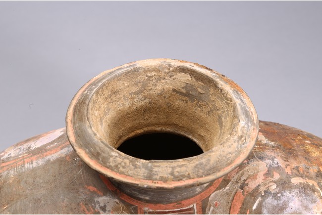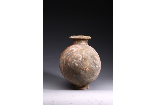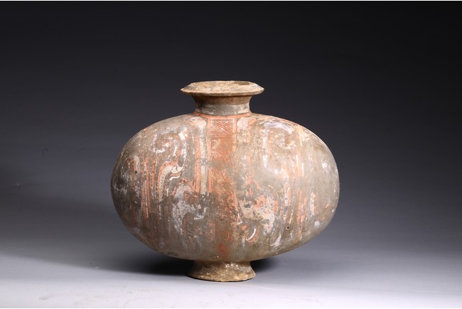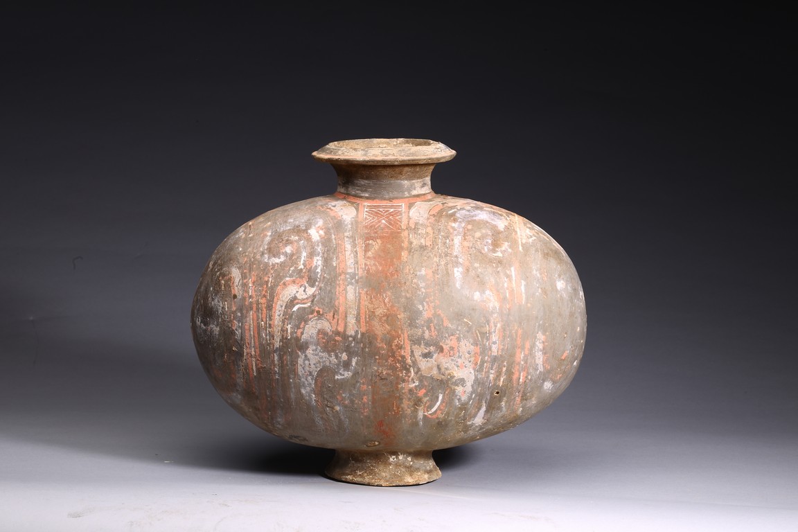 The well-potted body is decorated with bold scrollwork in yellow, red, orange, white pigments. Han Dynasty period.