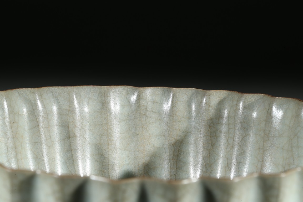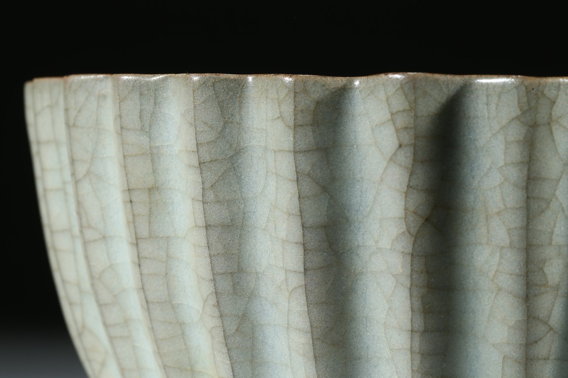 Finely potted with petal shaped lobes rising from the short straight foot, overall suffused with greyish-blue glaze with networks of crackles. Song Dynasty period.