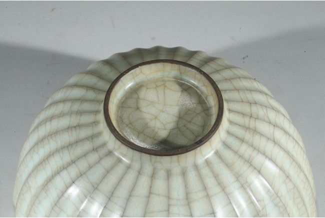 敞口,深腹,腹壁成菊瓣形仿觀朵菊綻開一瞬,平底,矮圈足,通體施哥釉,開片細密,足底露胎。