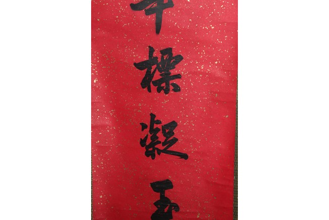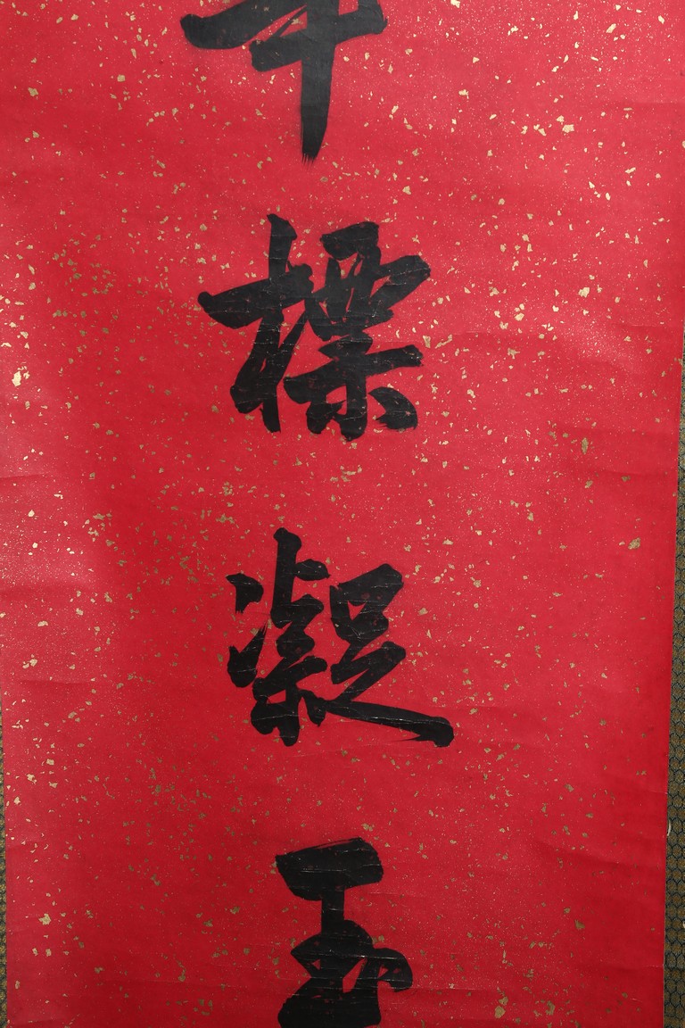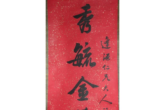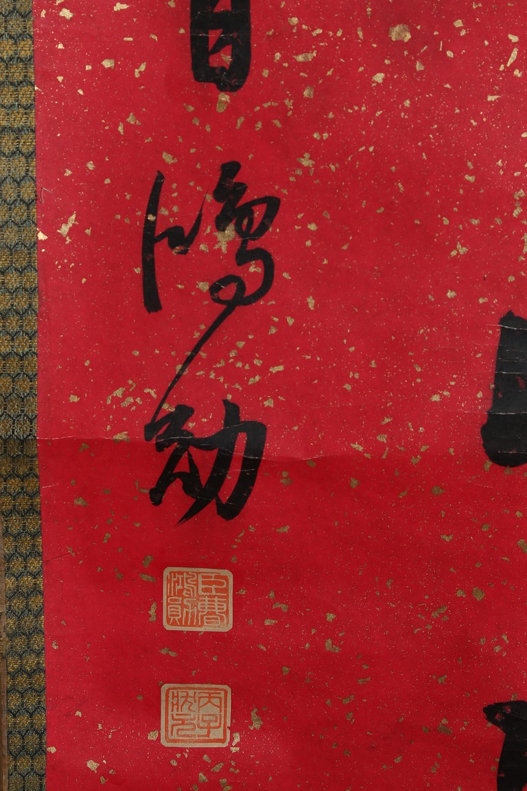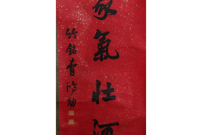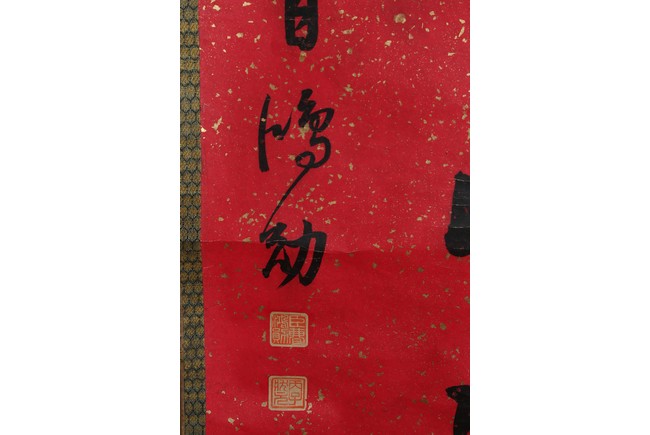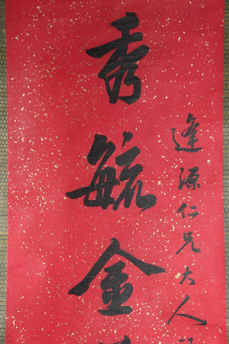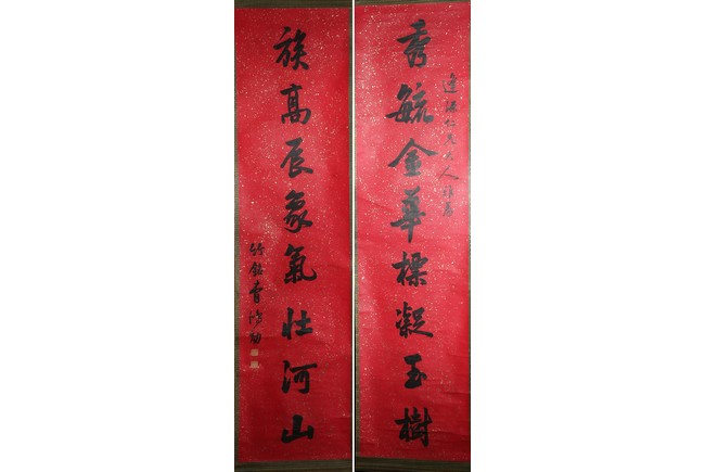 Ink on paper. Running script couplet calligraphy. Signed Cao Hongxun with two seal marks of the artist. Dedicated to Feng Yuan.
