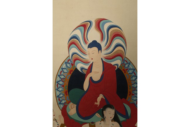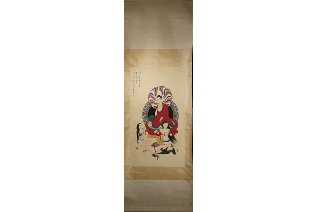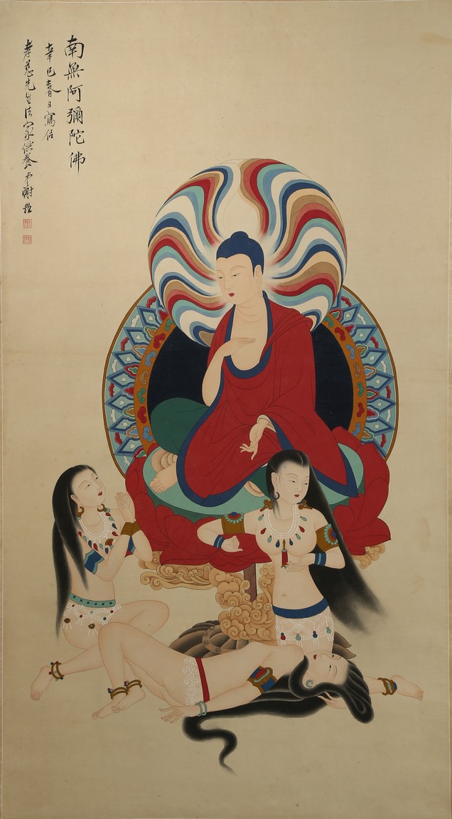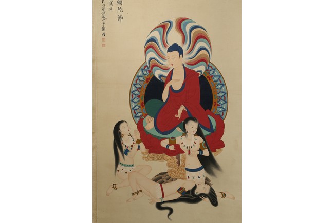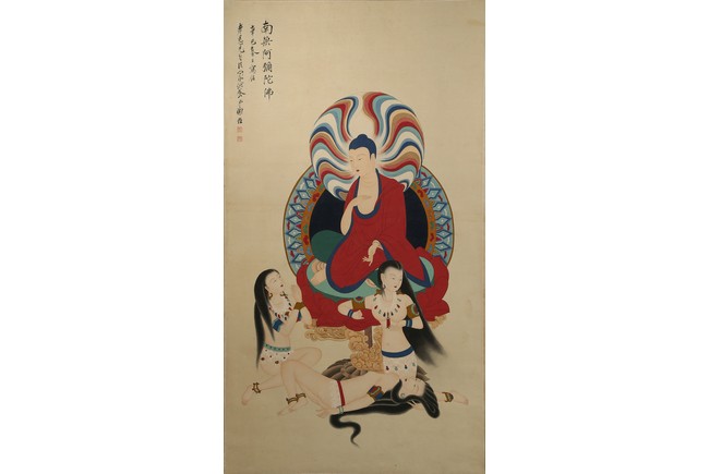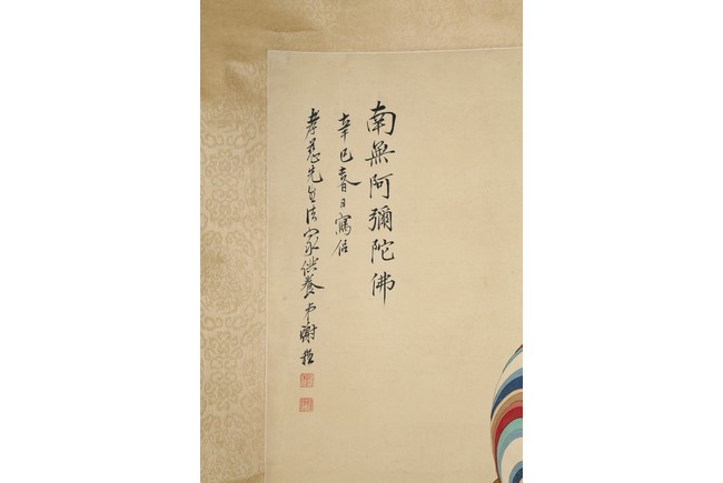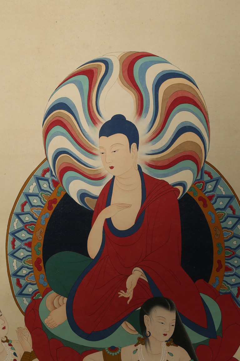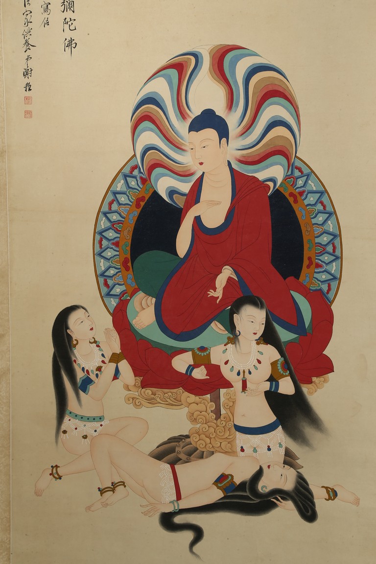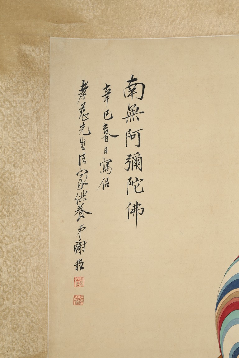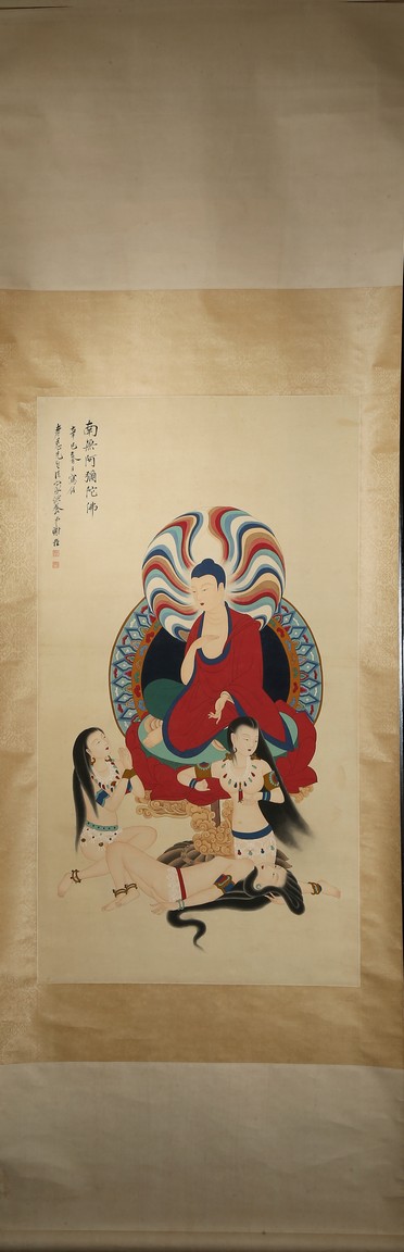 Ink and color on paper. Buddha. Hanging scroll. Inscribed and signed Xie Zhi with two seals of the artist.