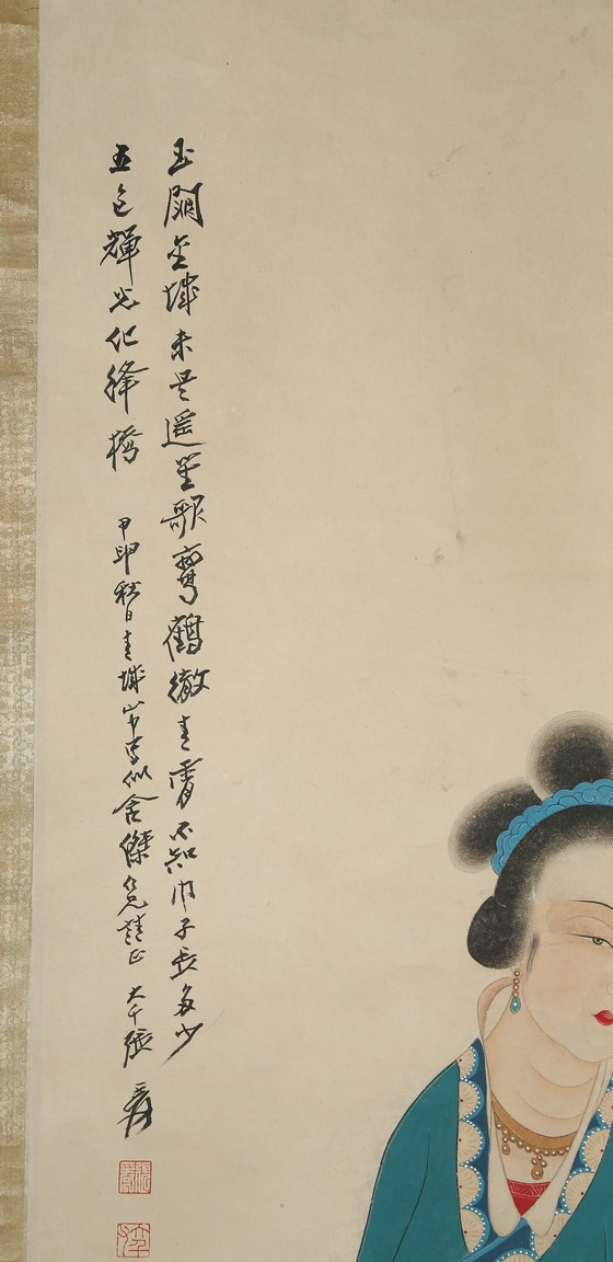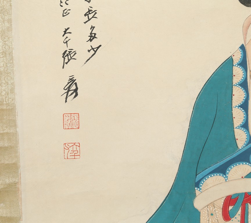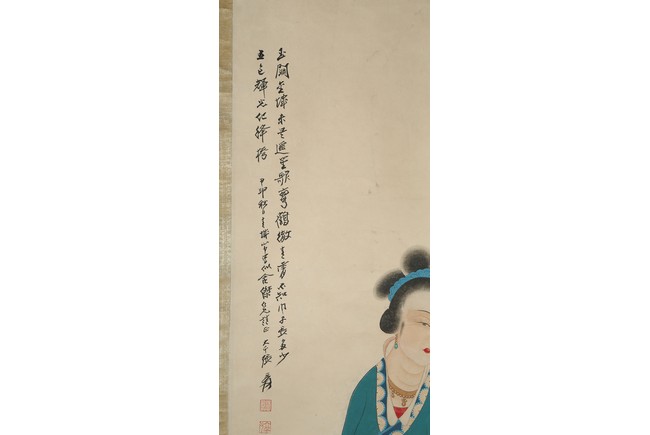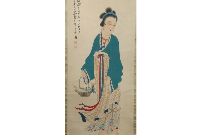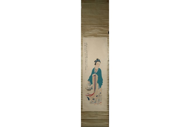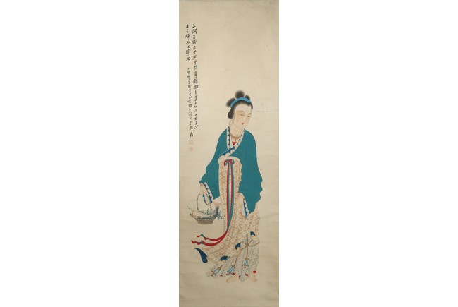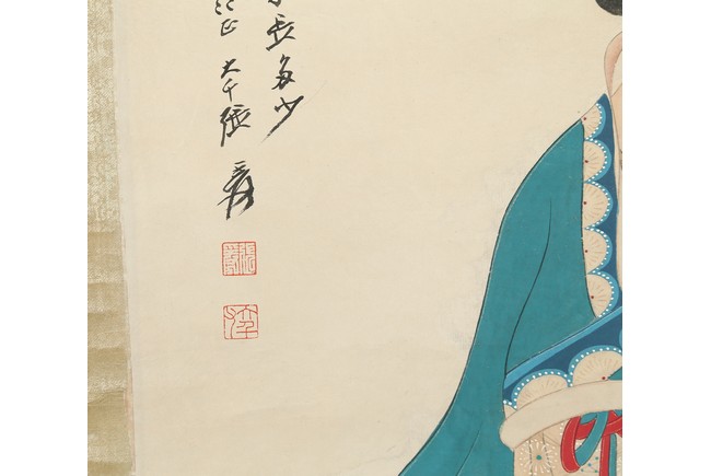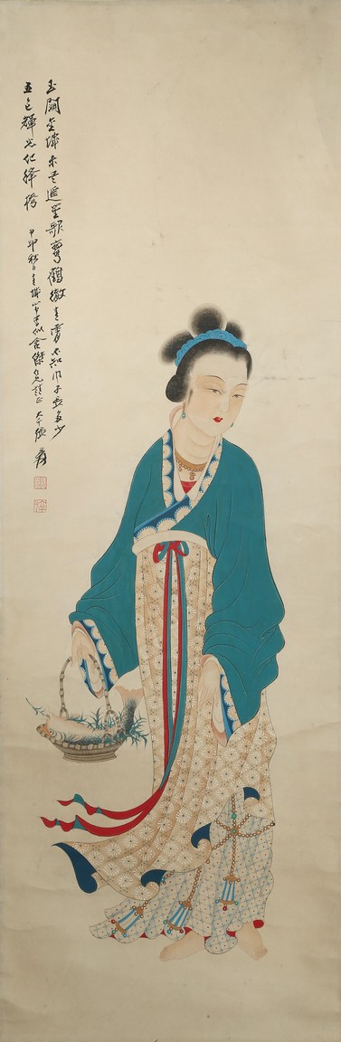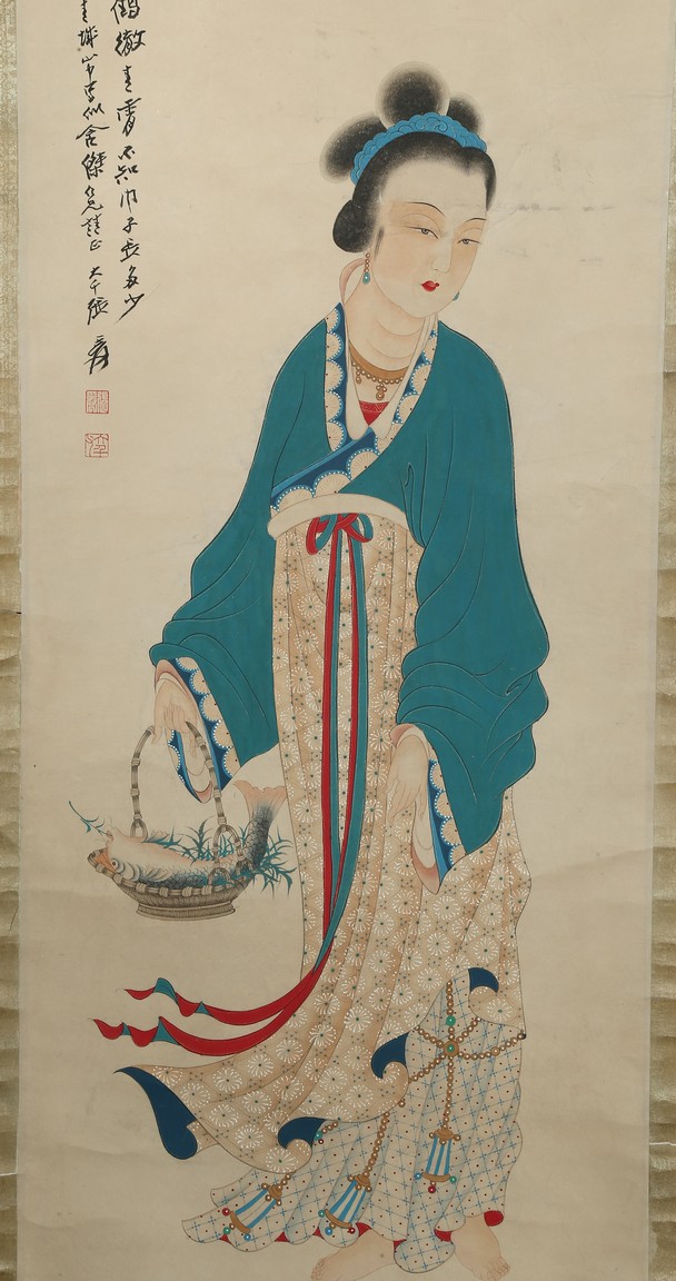 Ink and color on paper painting.Immortal Magu. Hanging scroll. Inscribed and signed Zhang Daqian with two seals of the artist.