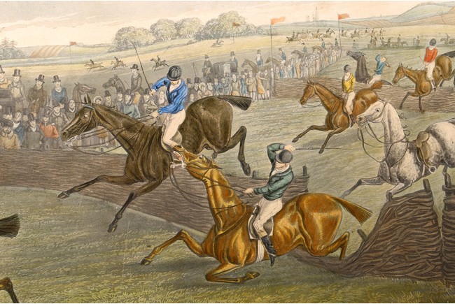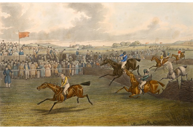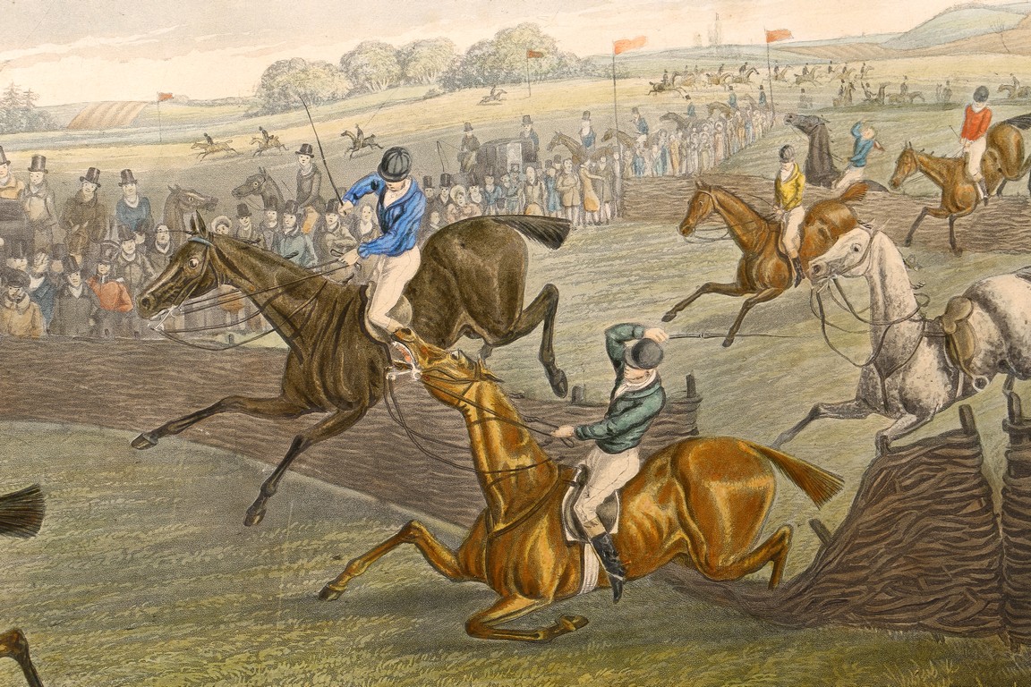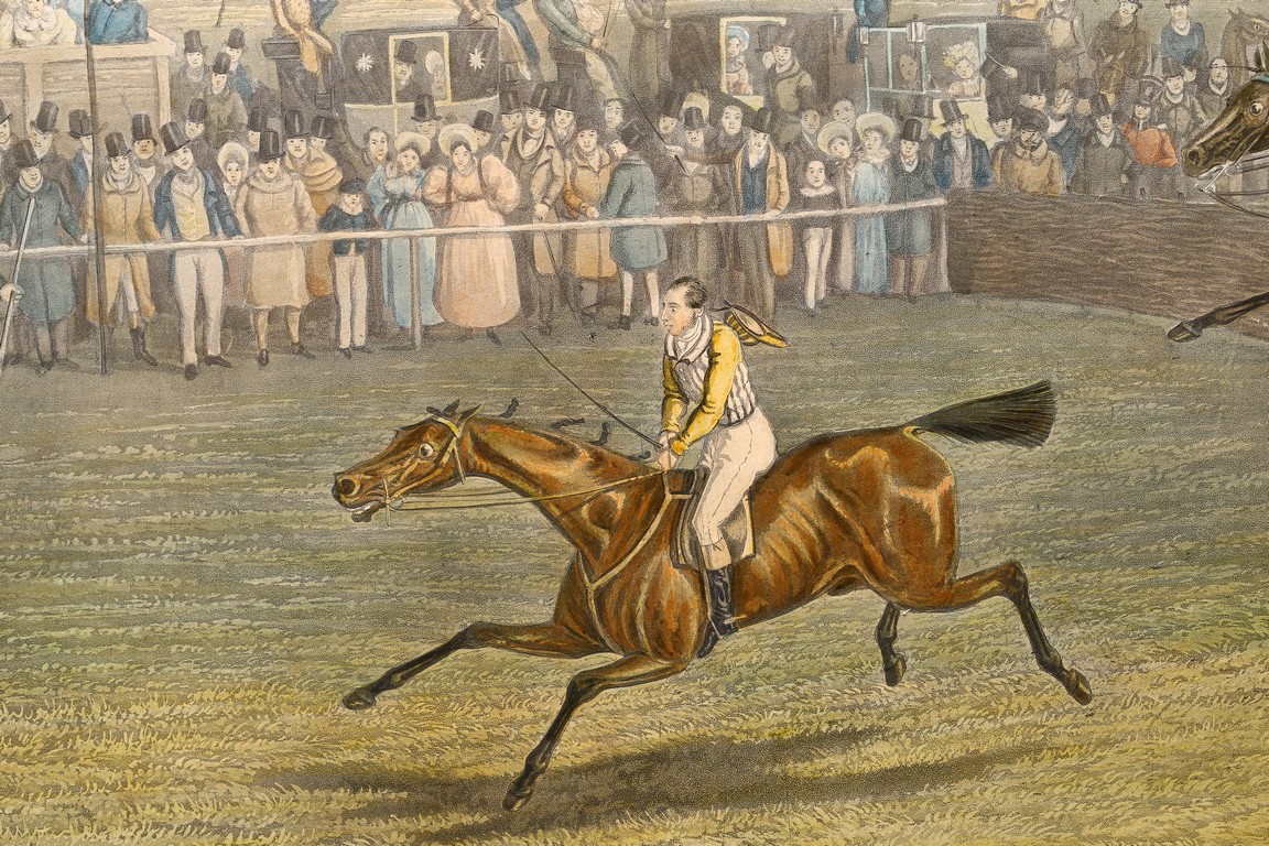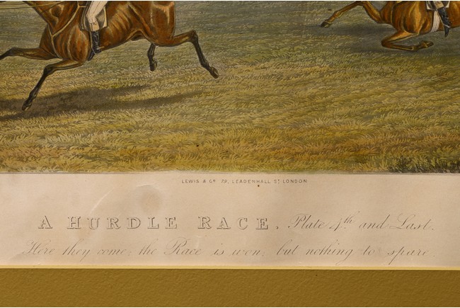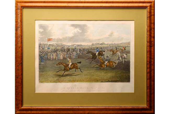 Framed. Hand-colored lithograph on paper, 'A Hundred Racing", drawn by G.H.Alken and engraved by C.Hunt.