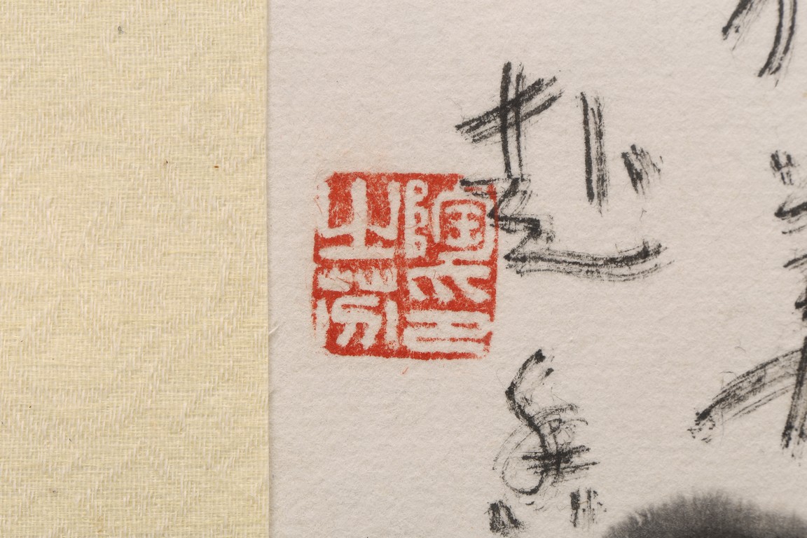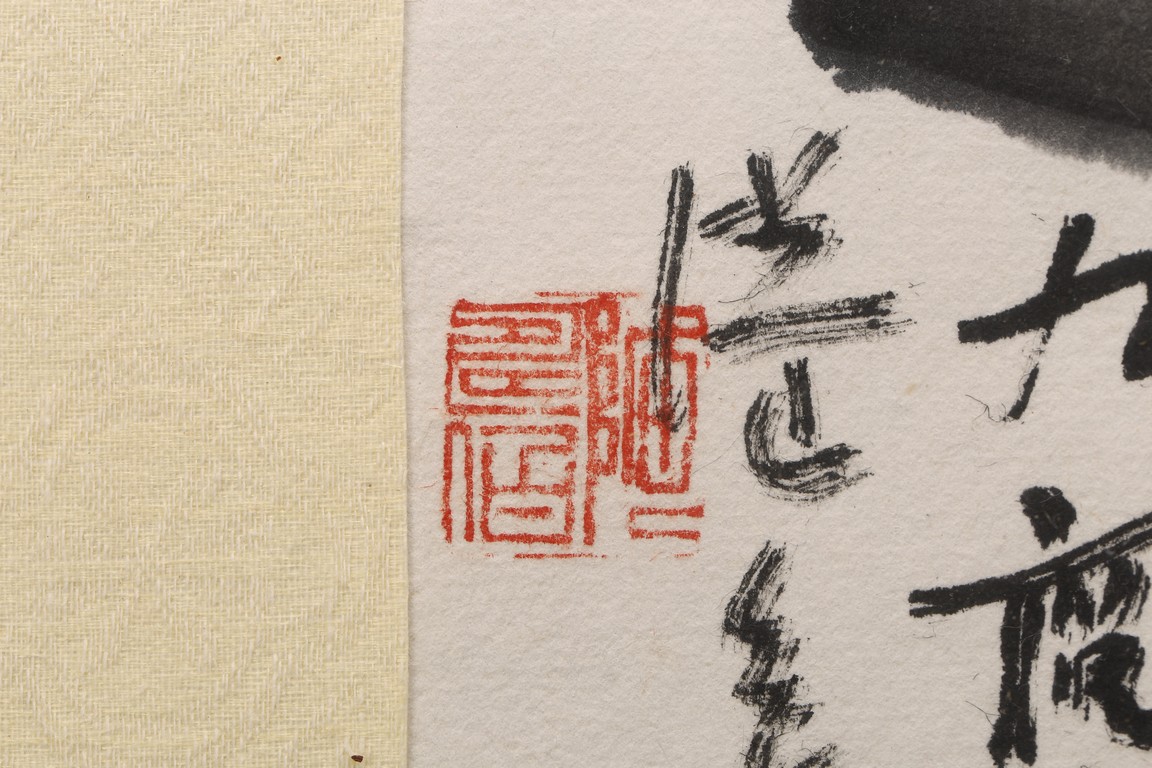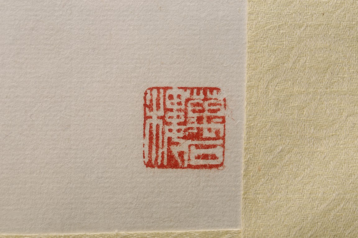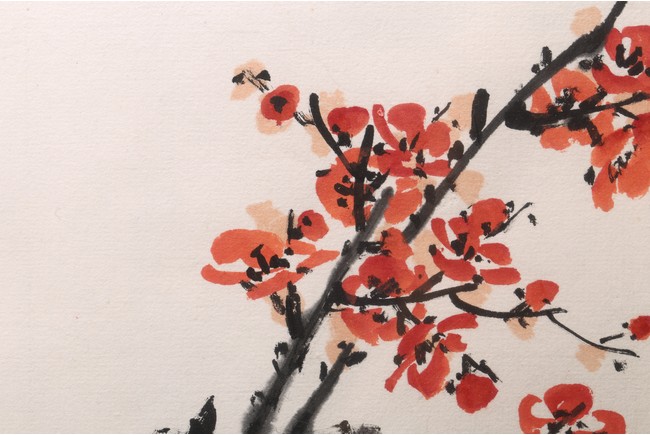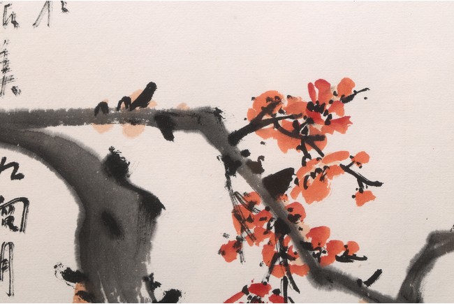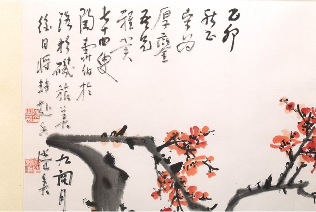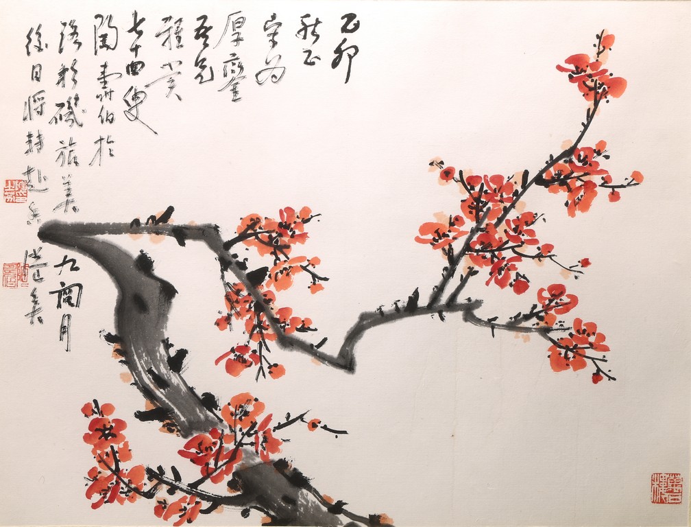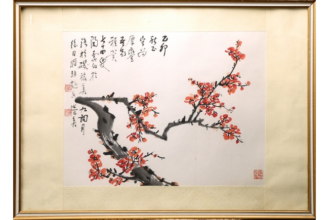 Color and ink on paper. Plum Blossoms. Framed. Inscribed and signed Tao Shoubo, with three seals of the artist.
