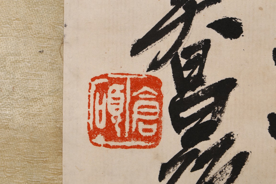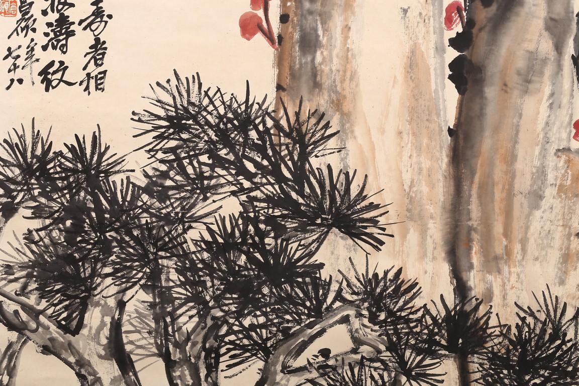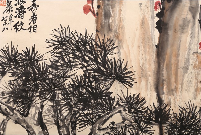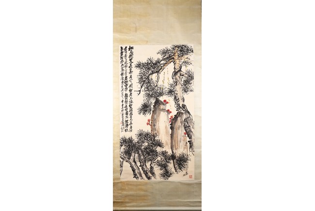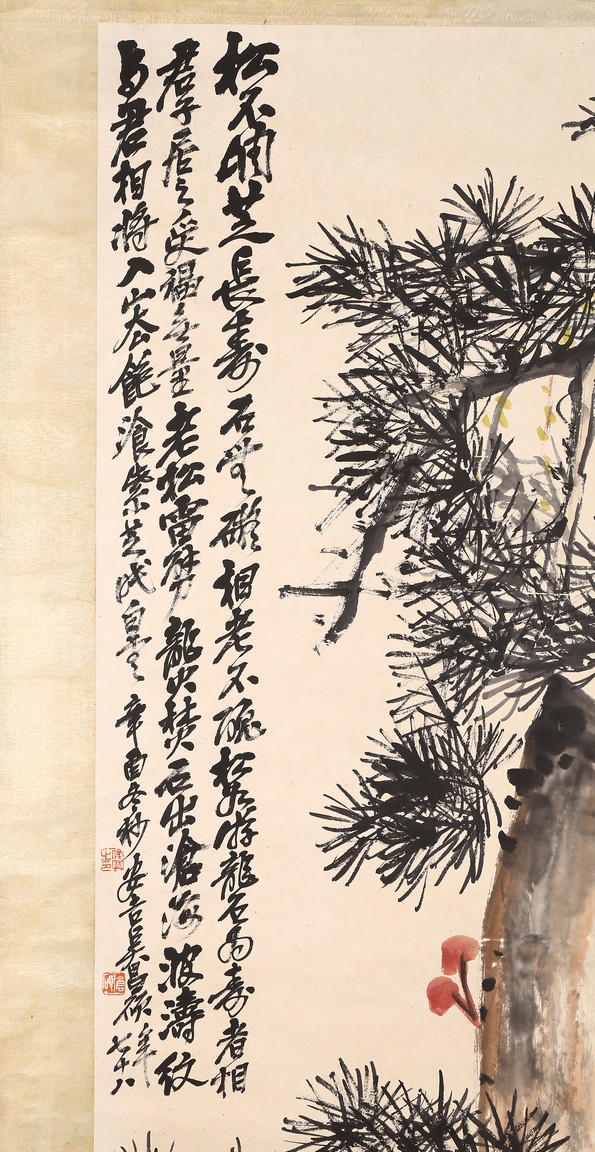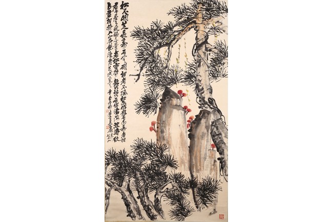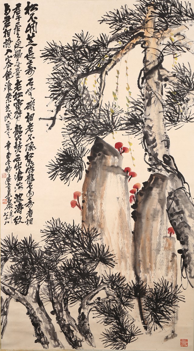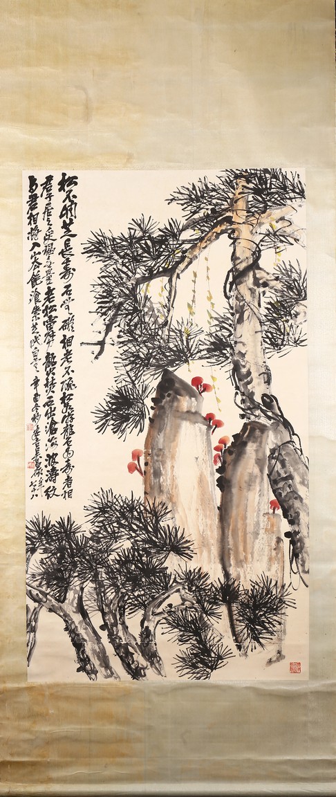 Color and ink on paper. Pine tree and reishi. Hanging scroll. Inscribed and signed, with three seal marks. Wu Changshuo (1844-1927)