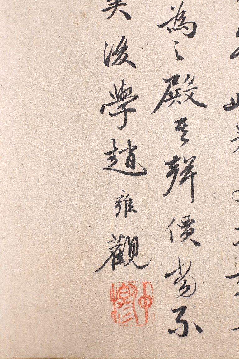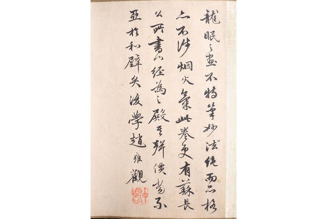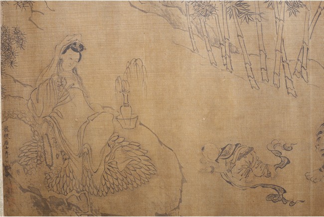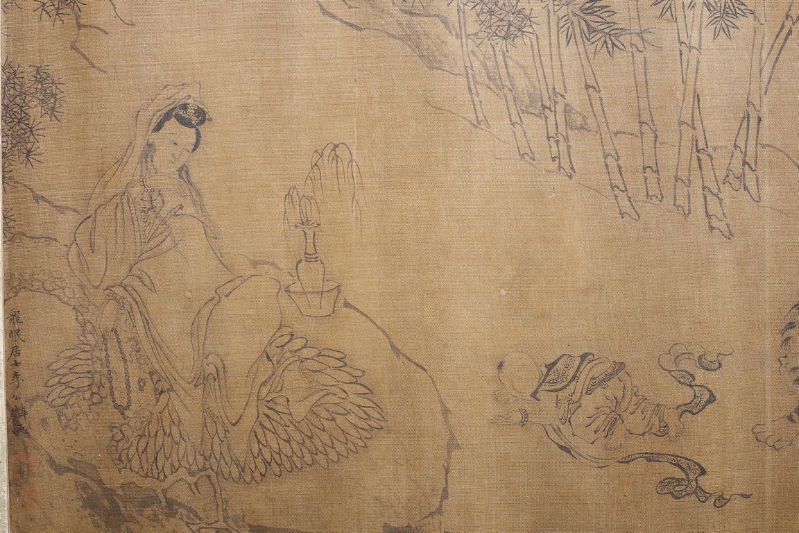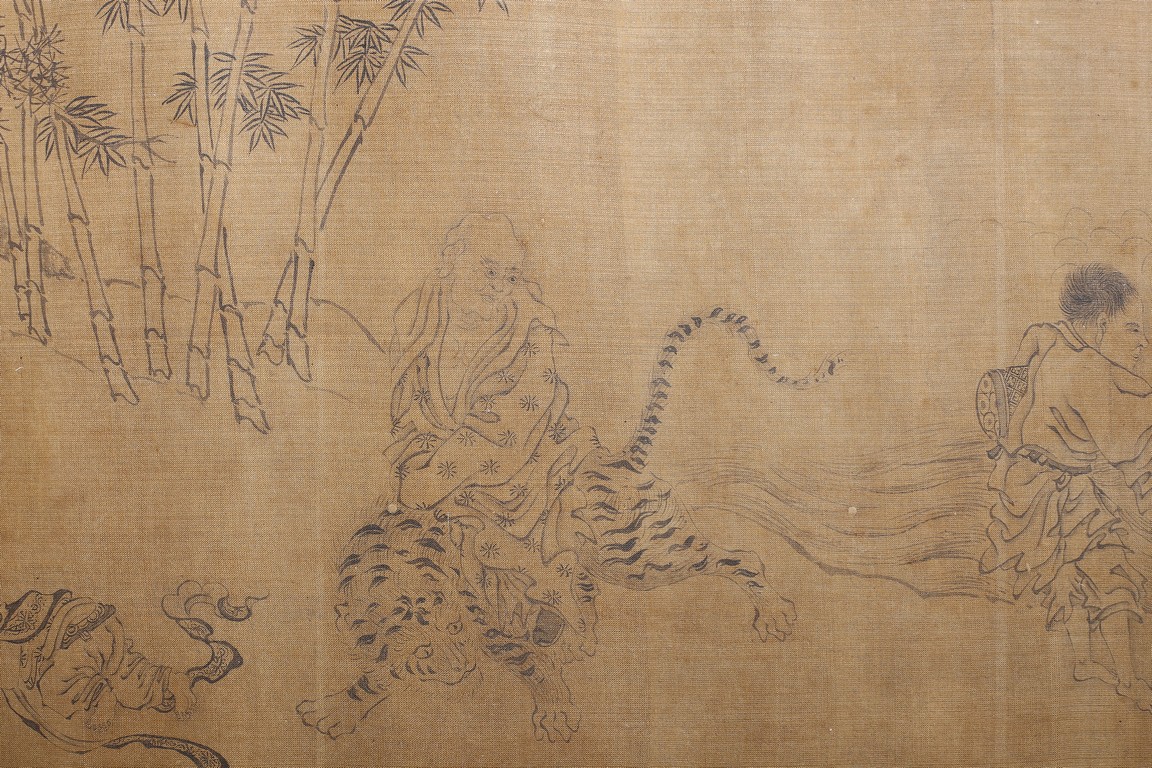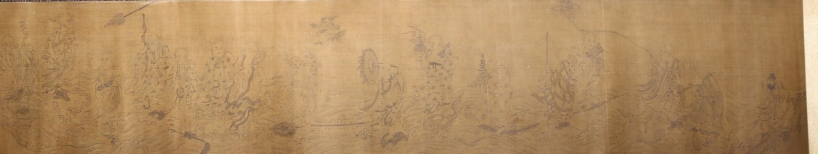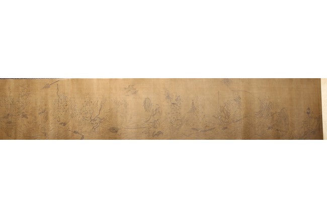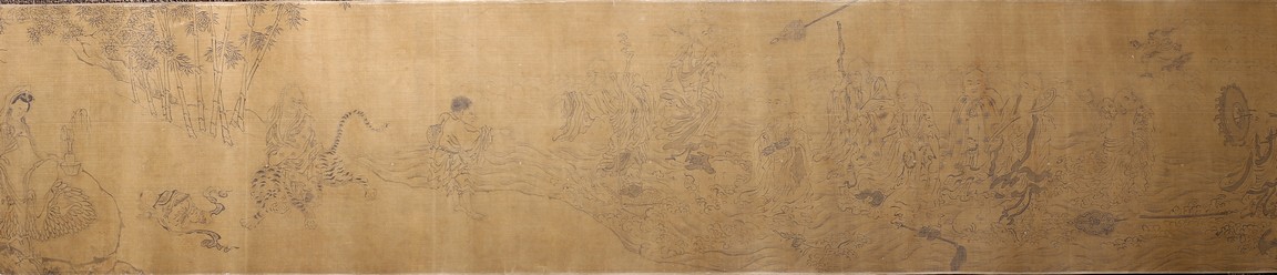 Color and ink on silk. Arhats crossing sea. Handscroll. Inscribed and signed Li Gonglin, with two seals of the artist. Colophon signed Zhao Yongguan with one seal of the artist. Attributed to Li Gonglin.