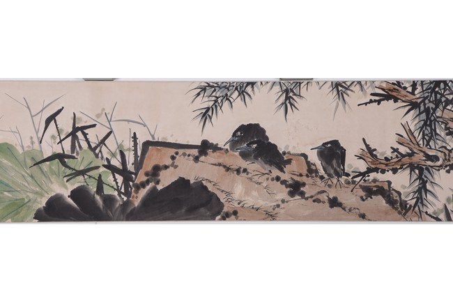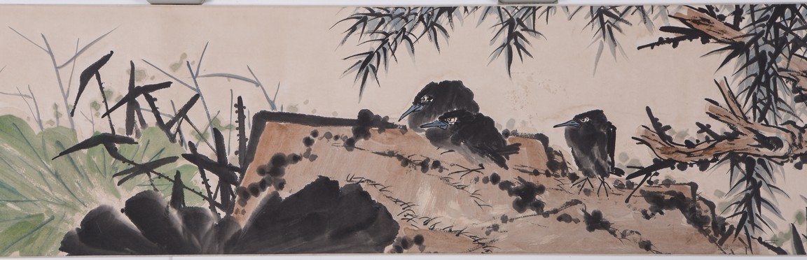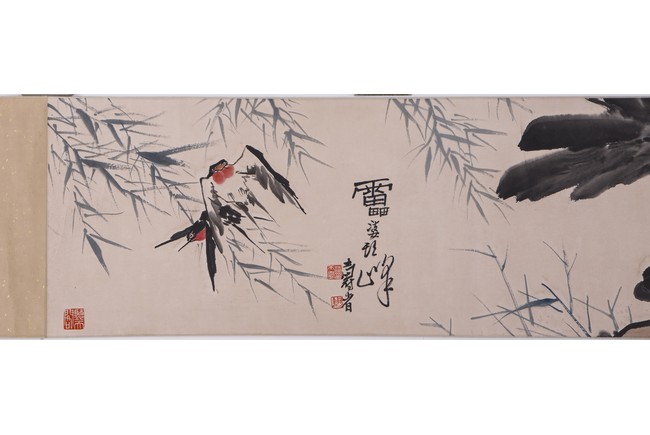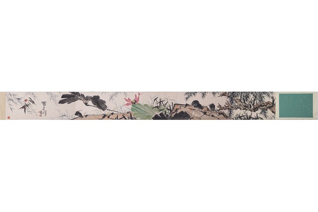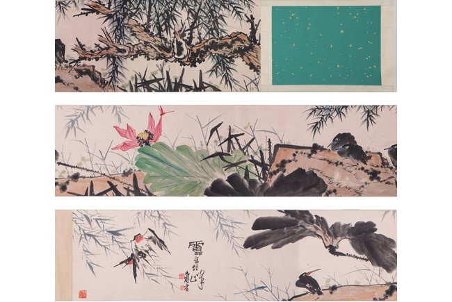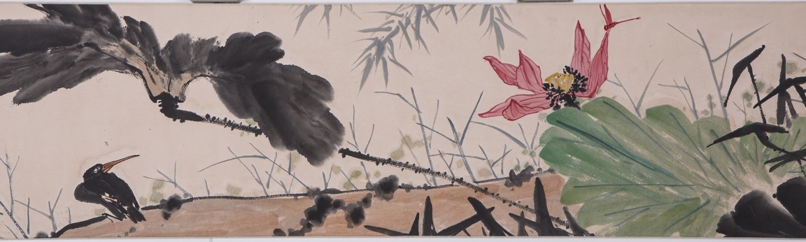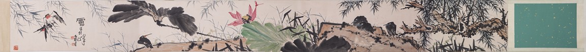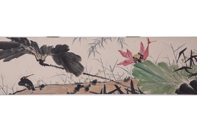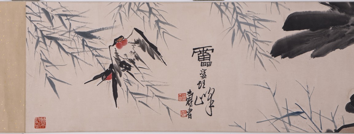 Ink and color on paper painting. Flowers and birds. Handscroll. Signed and with three seals of the artist. Attributed to Pan Tianshou.