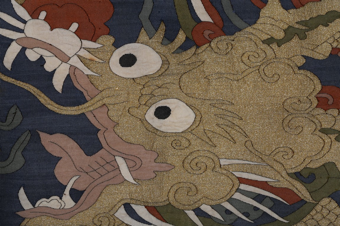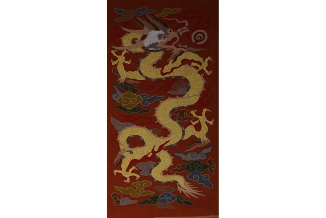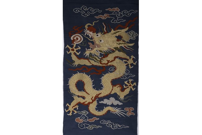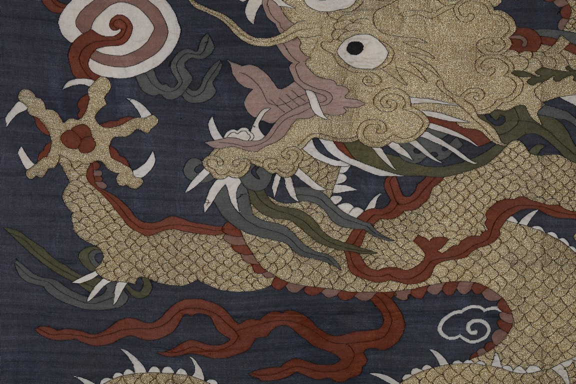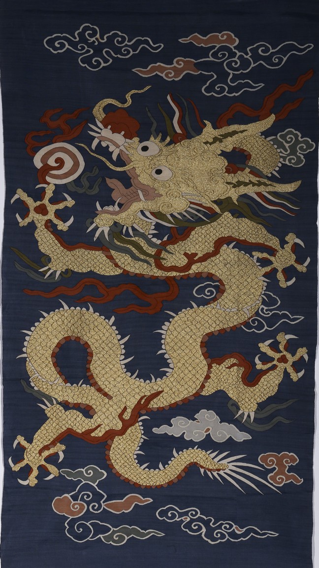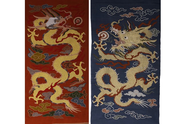 Each panel finely embroidered with five clawed dragon in gold thread amidst auspicious clouds chasing a flaming pearl, each reserved on red and blue ground.
