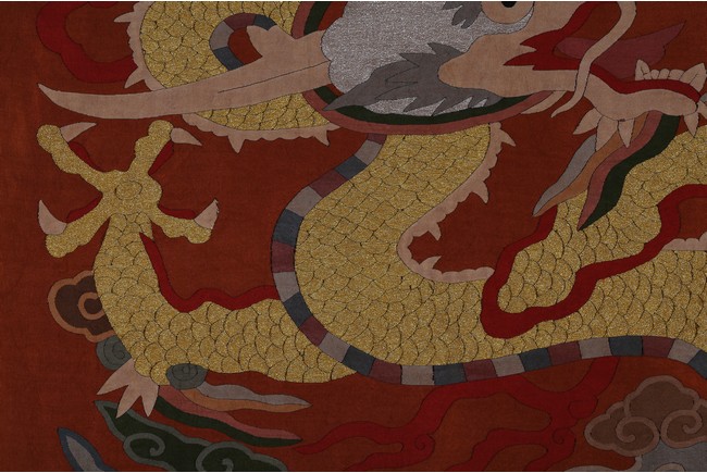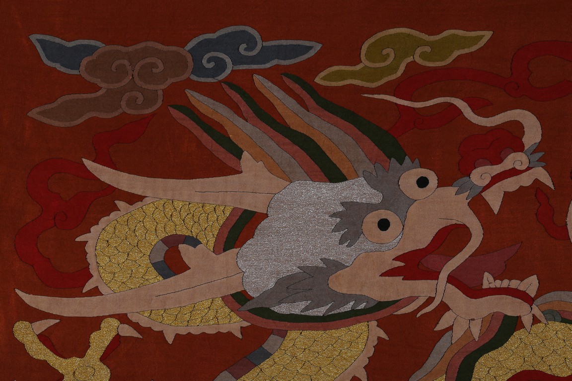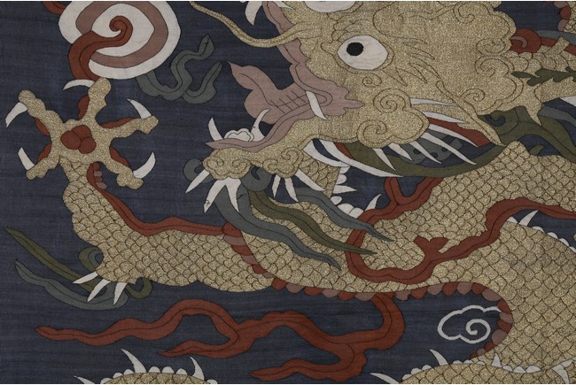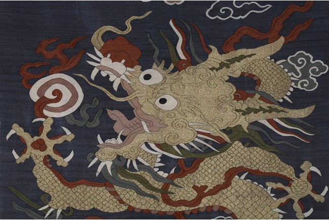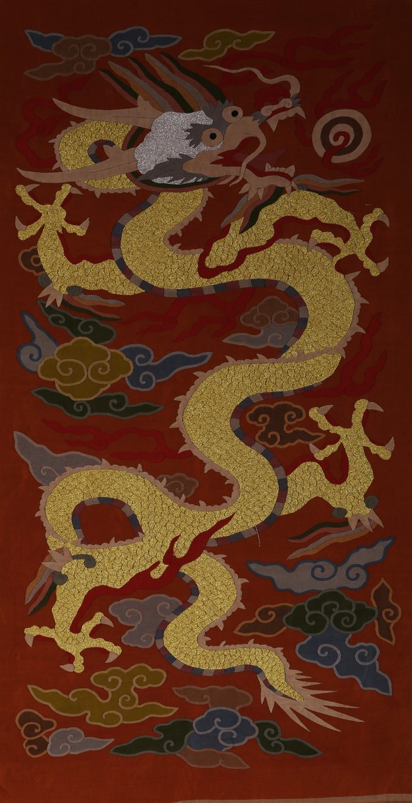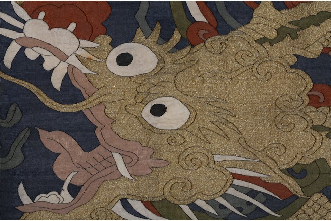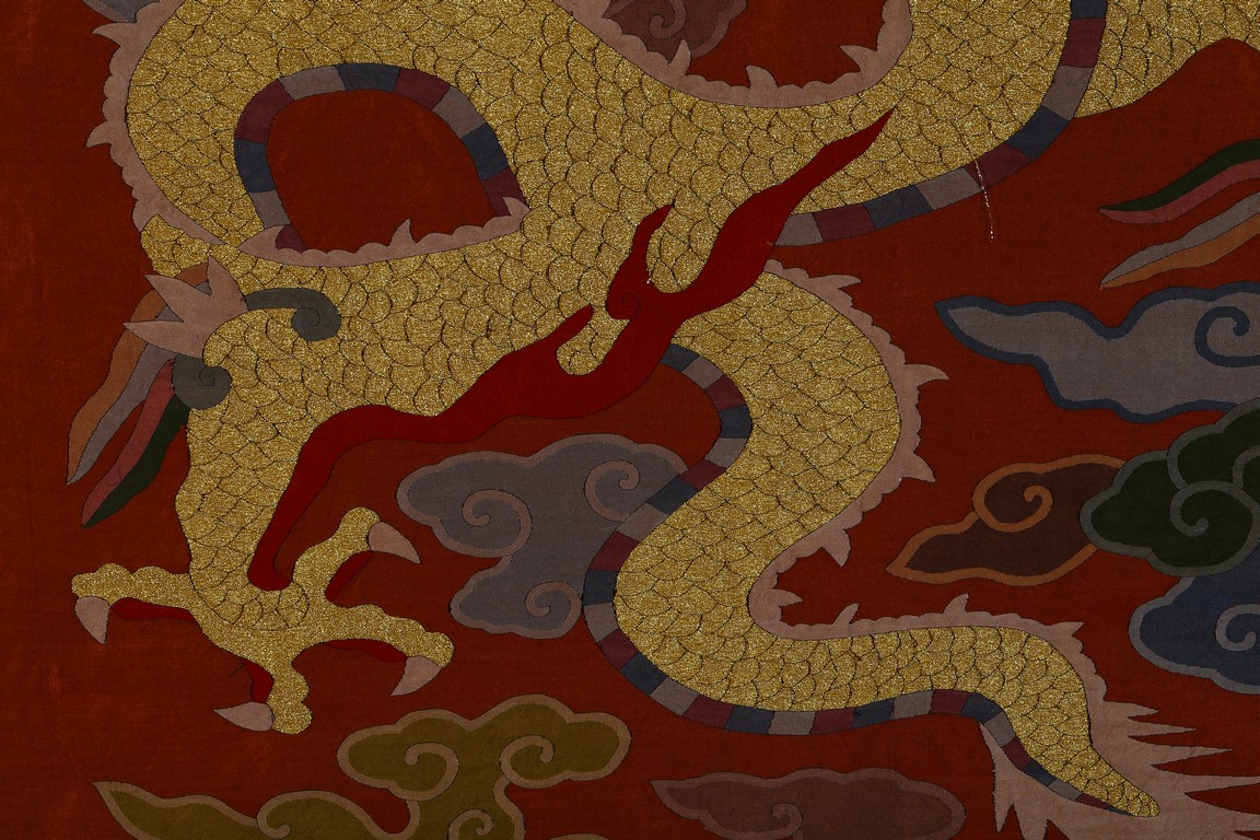Each panel finely embroidered with five clawed dragon in gold thread amidst auspicious clouds chasing a flaming pearl, each reserved on red and blue ground.