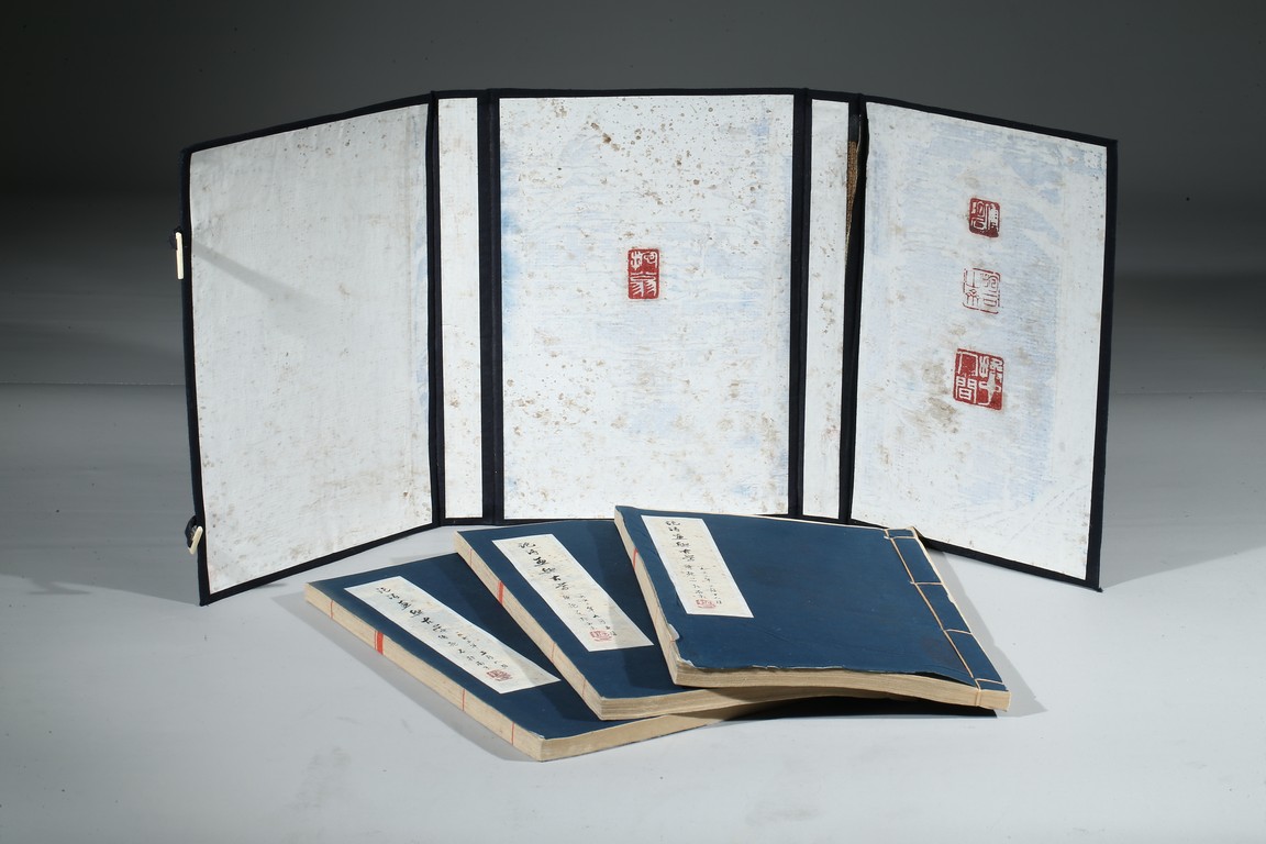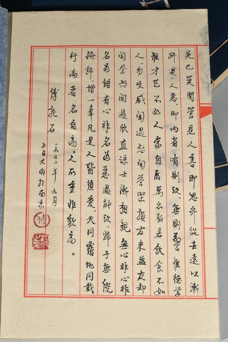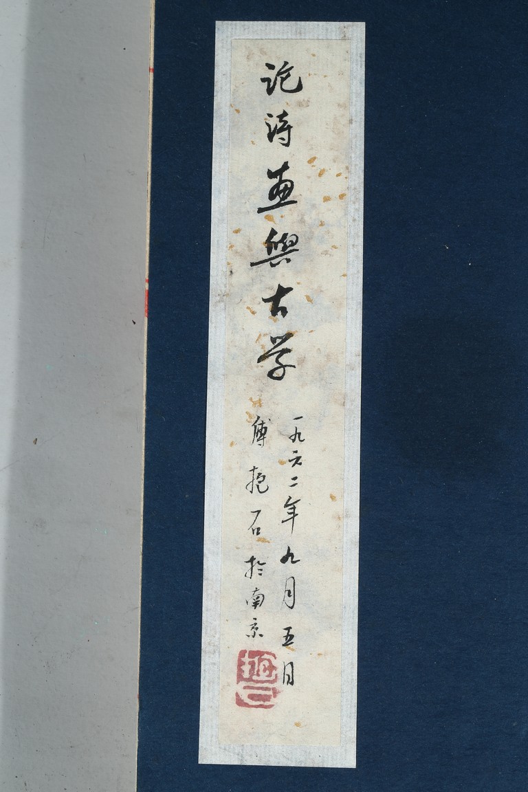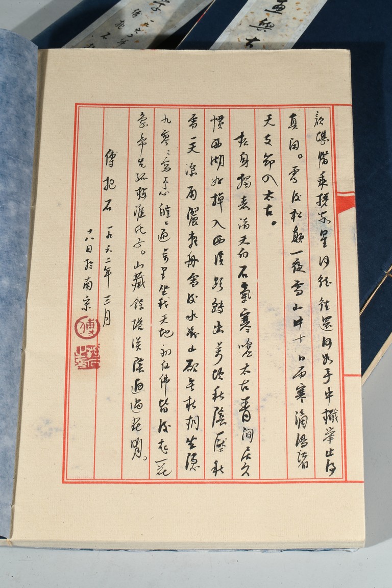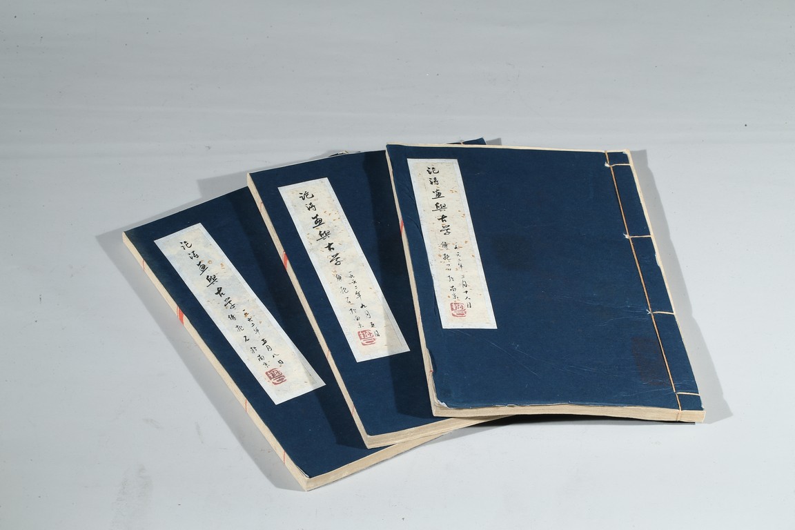 Ink on paper. Three handwritten books. Including a book hardcover. Signed by Fu Baoshi with twelve seals of the artist.