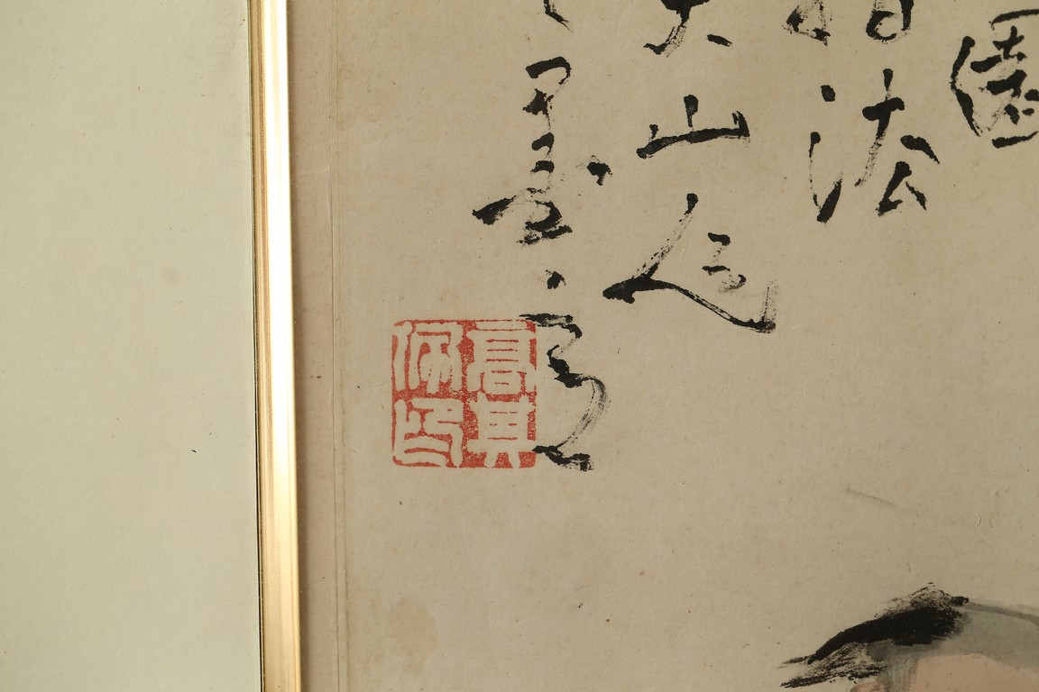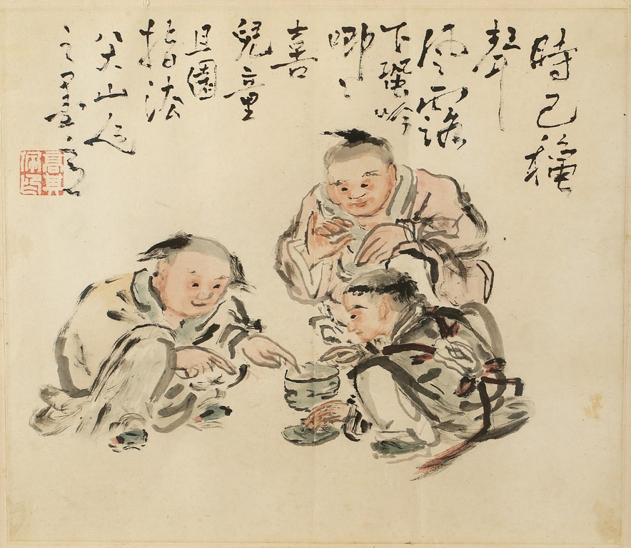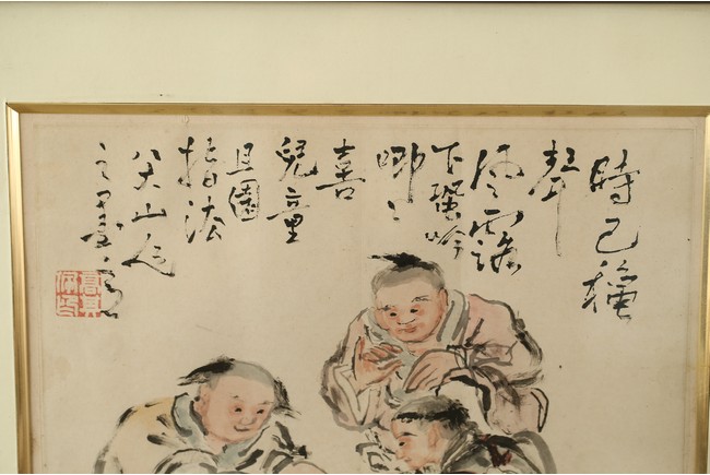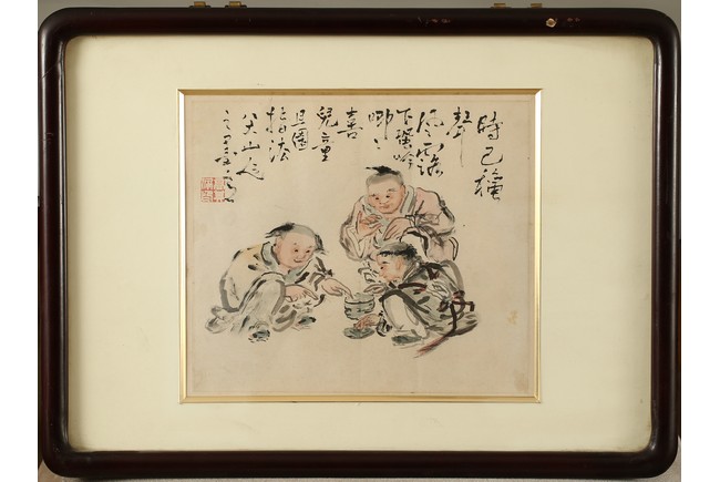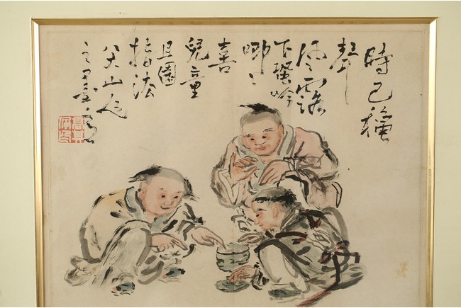 Color and ink on paper. Children. Framed. one seal of the artist. Attributed to Gao Qipei.