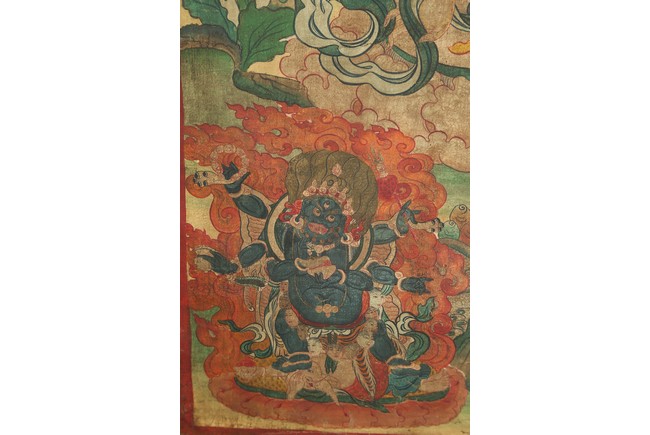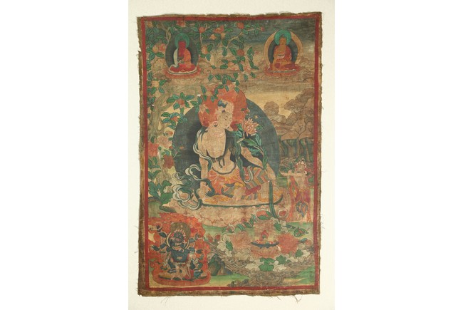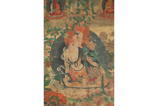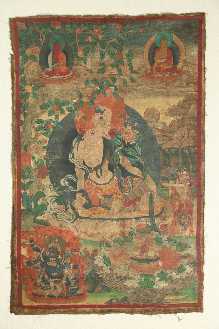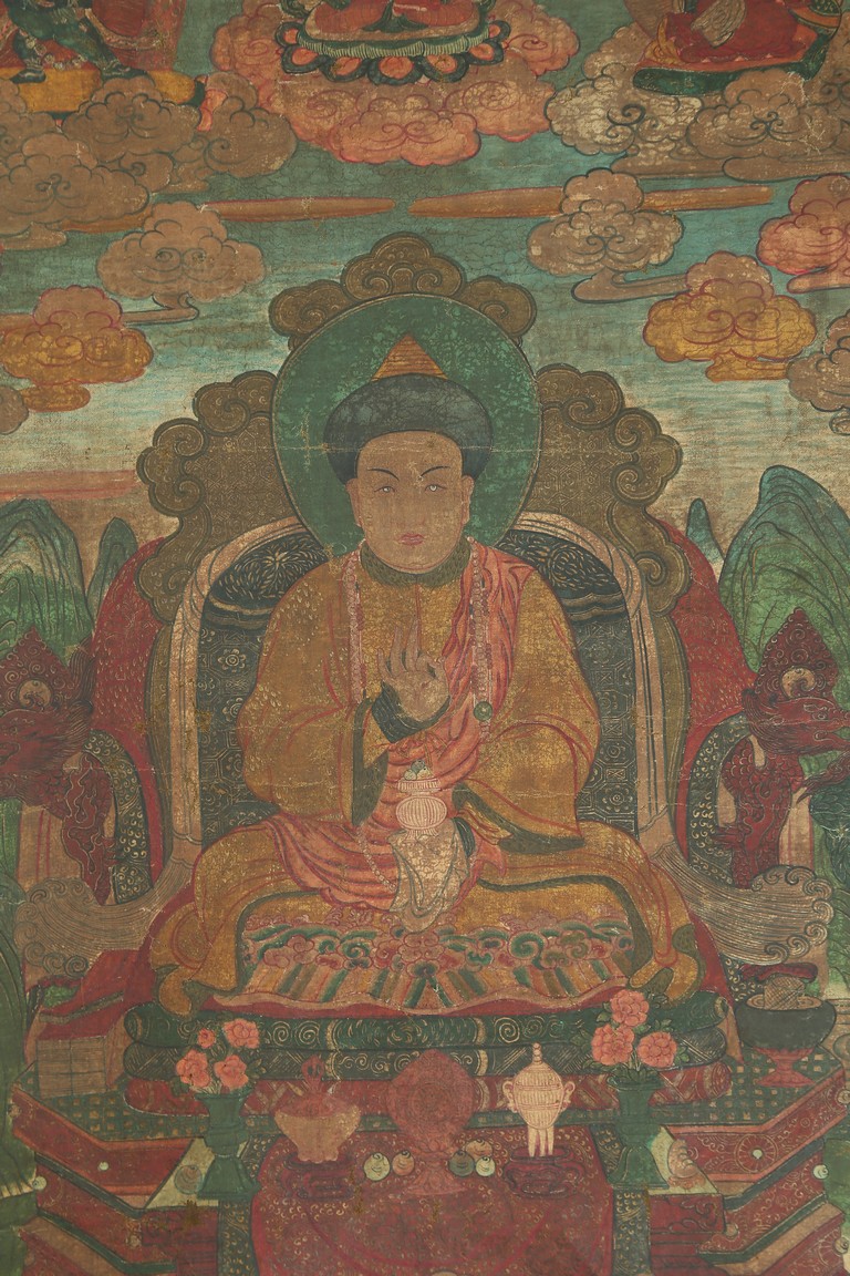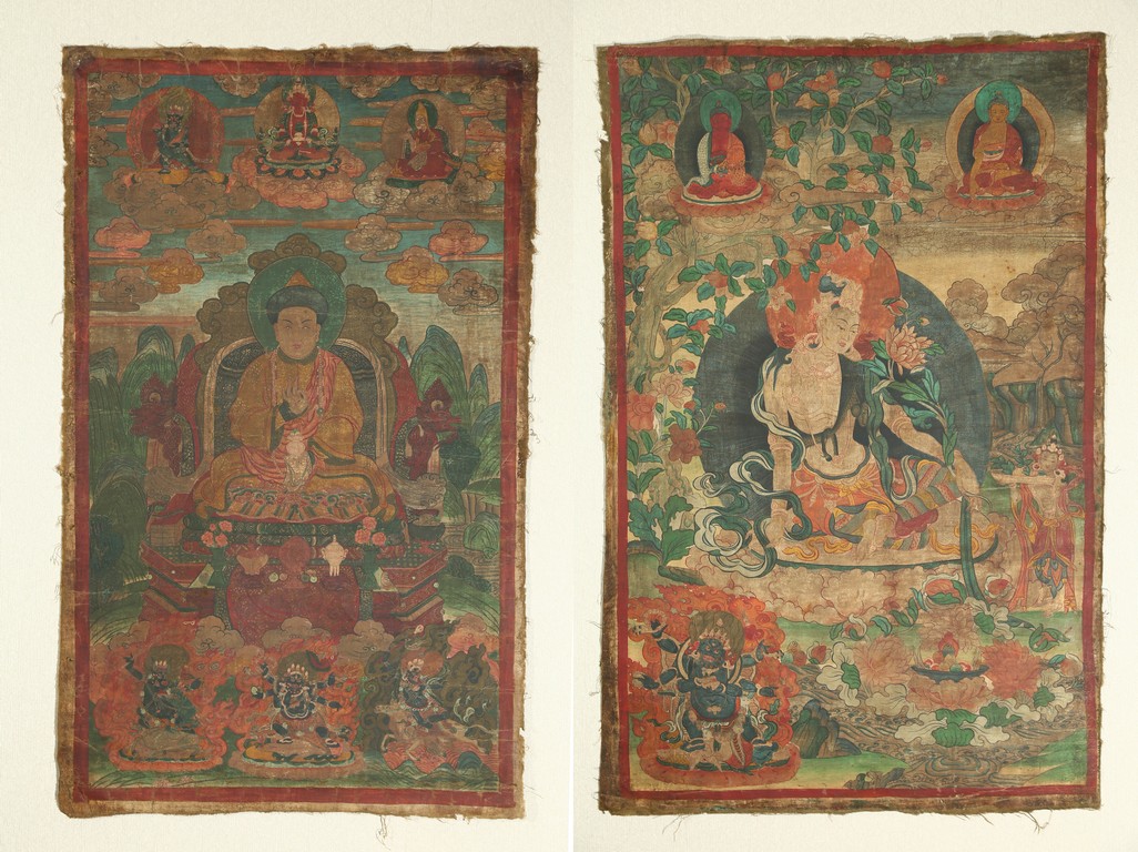 Comprising two thangkas, each thangka depicting different bodhisattva sense and painted in vivid color with the main central figure in various landscape settings.