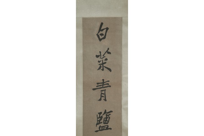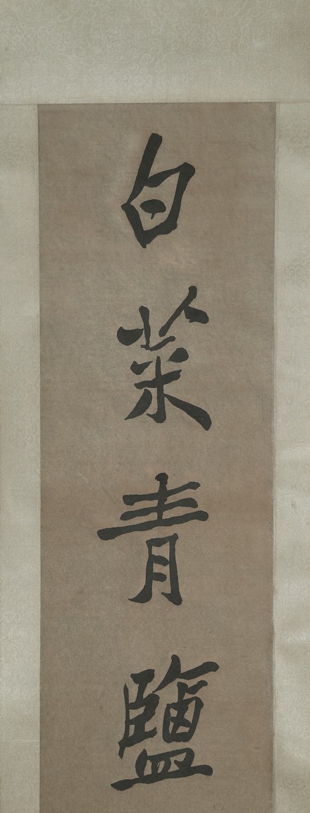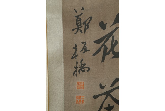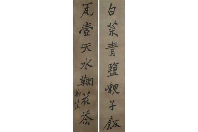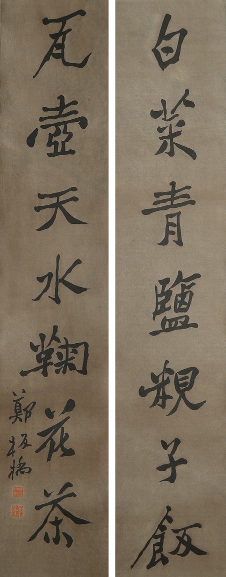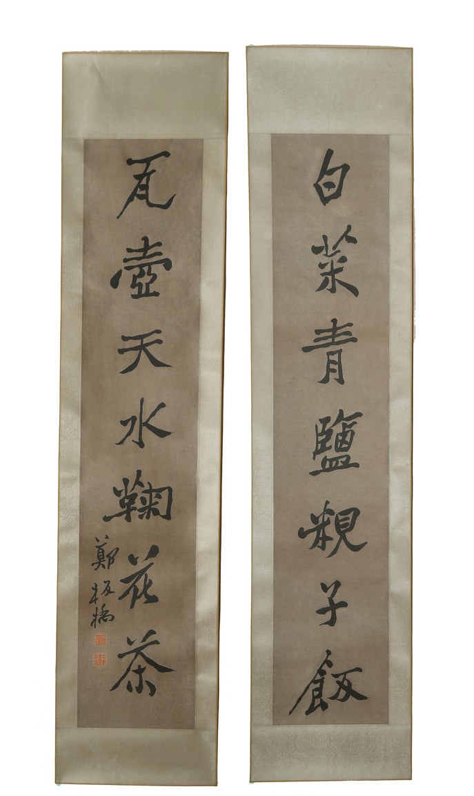 Ink on paper. Seven-character calligraphy couplet. Hanging scroll. Signed by Zheng Banqiao and with two seals of the artist.