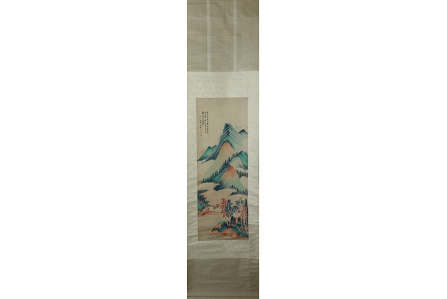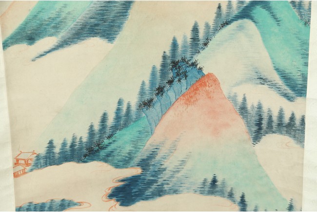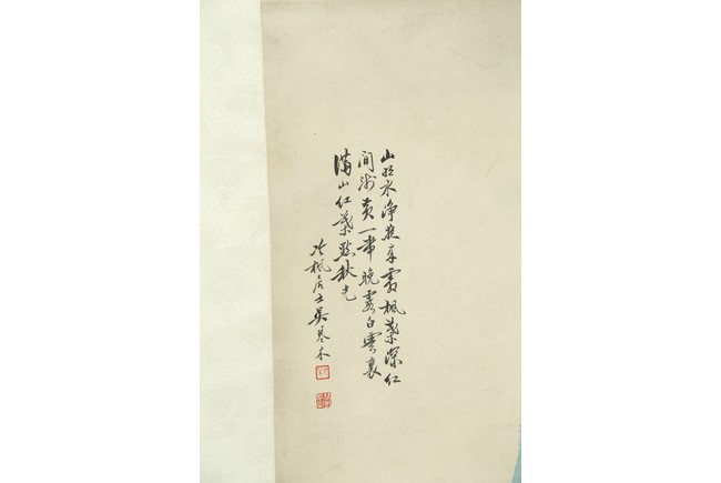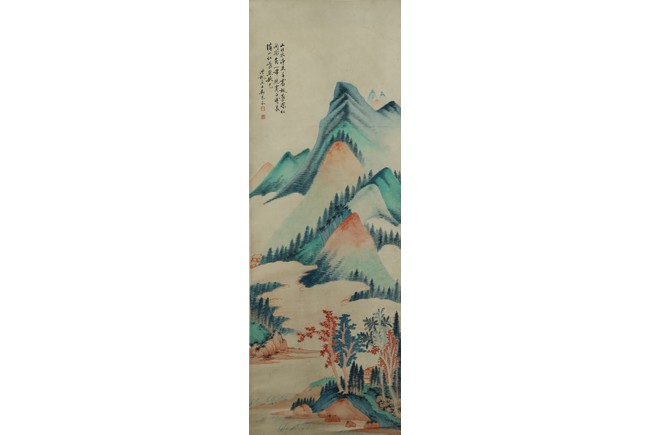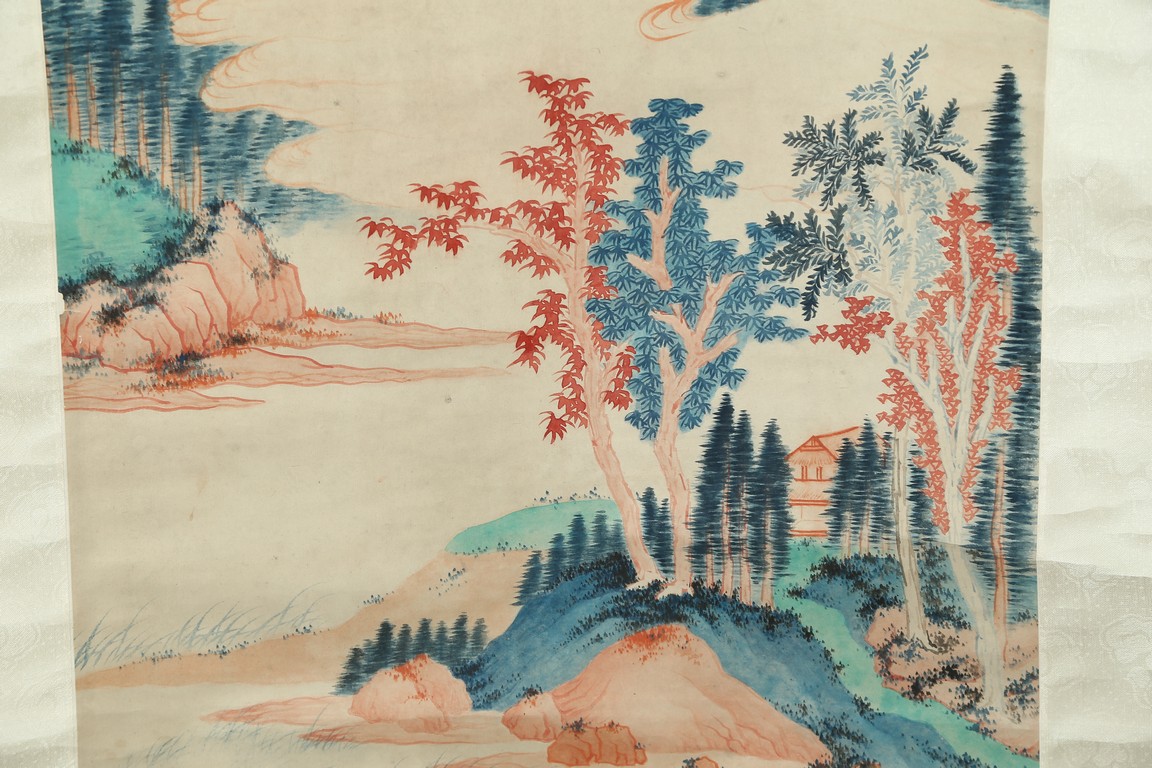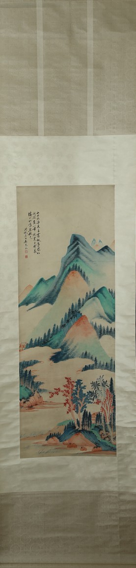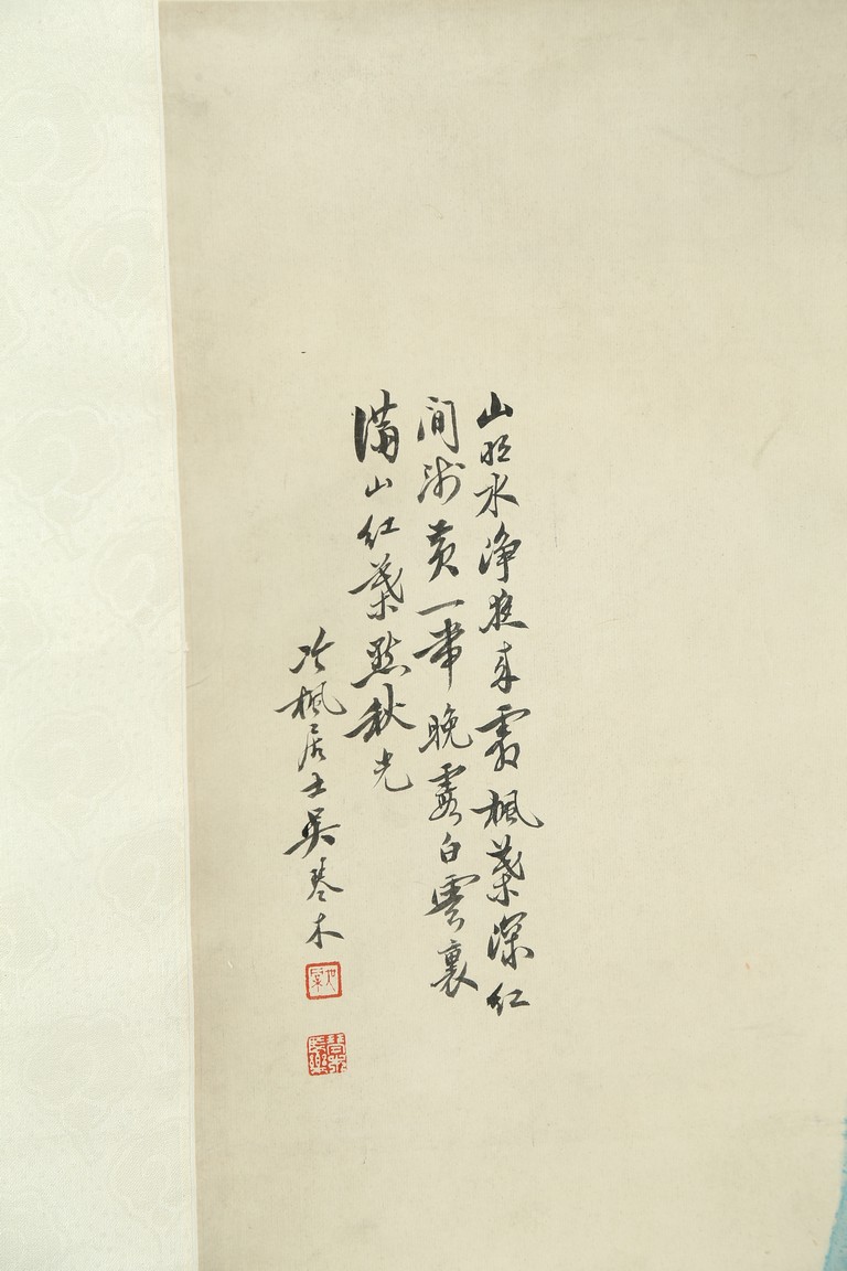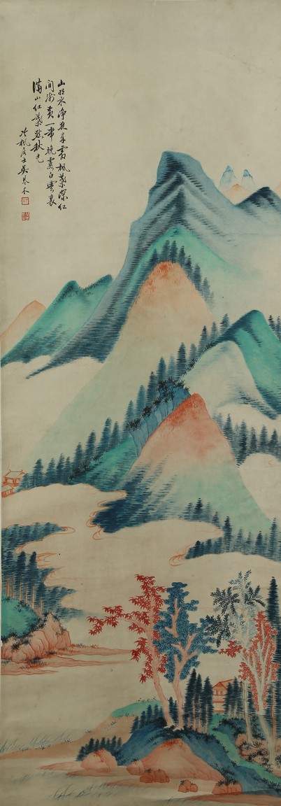 Ink and color on paper painting. Landscape. Hanging scroll. Signed Wu Qinmu and with two seals of the artist.