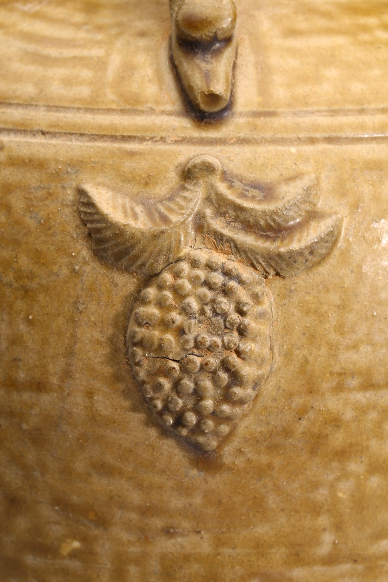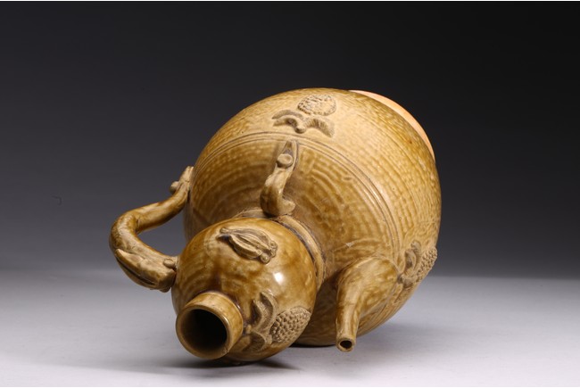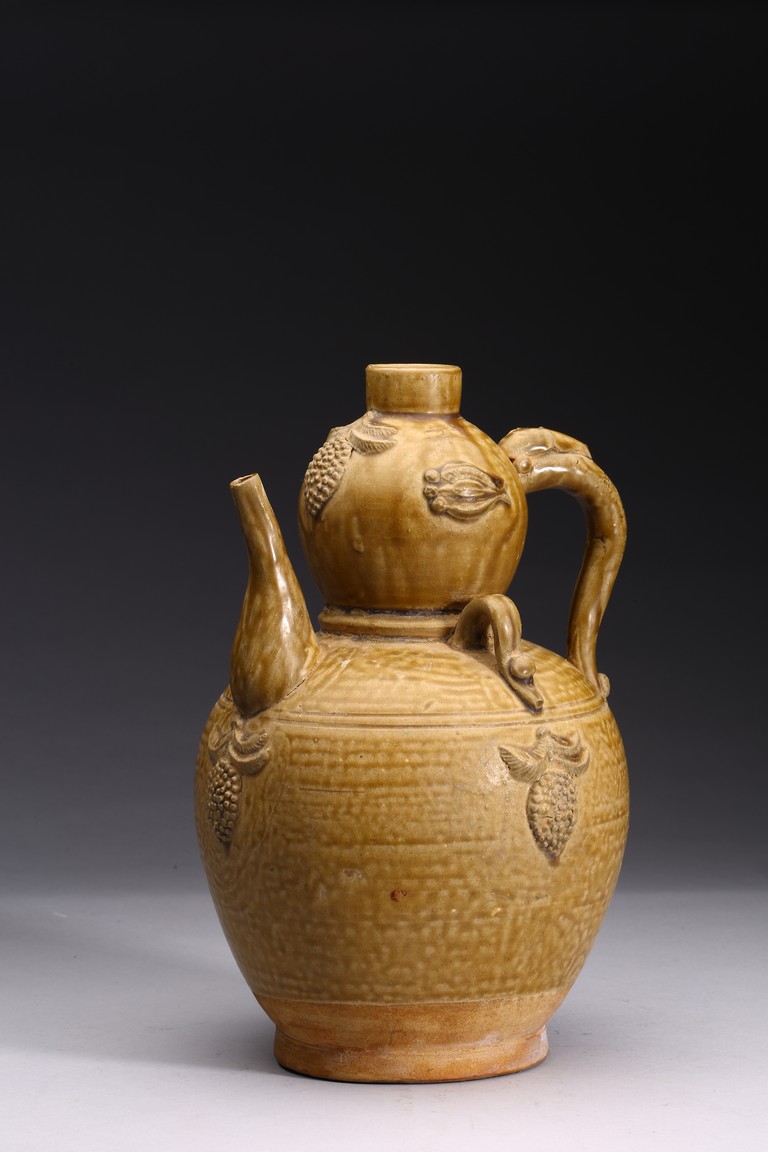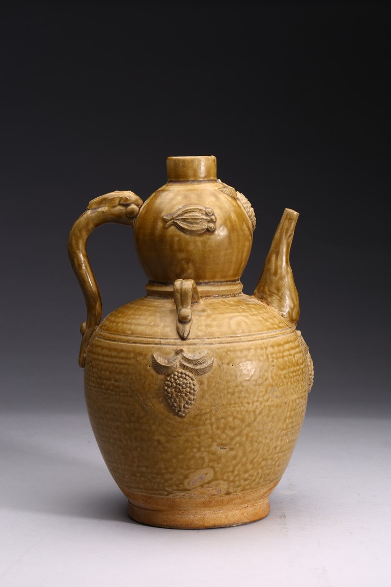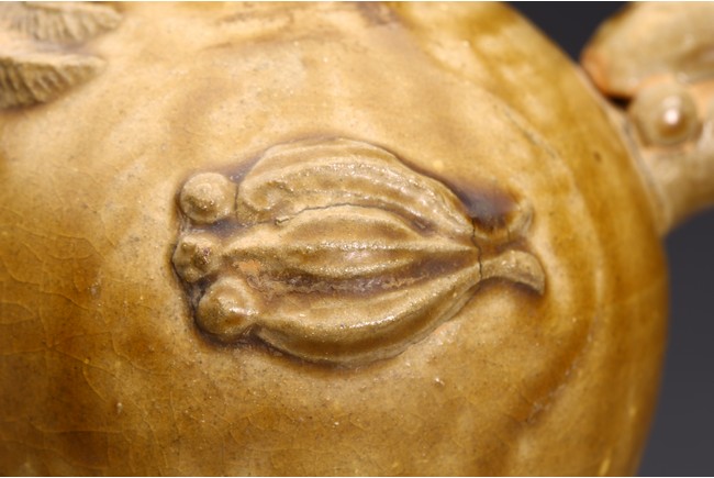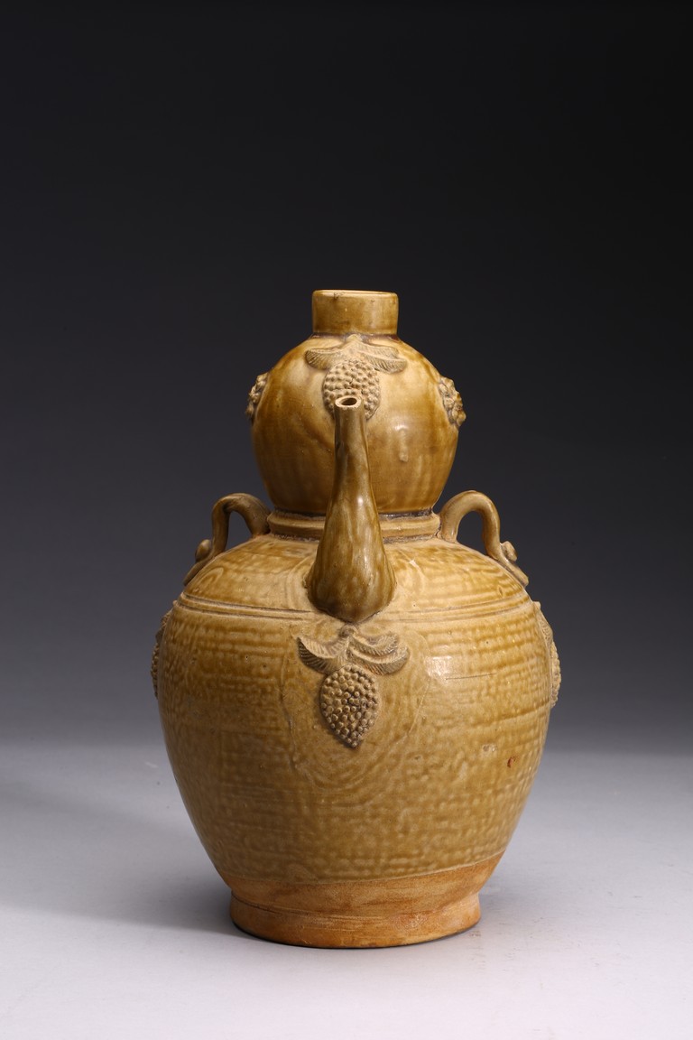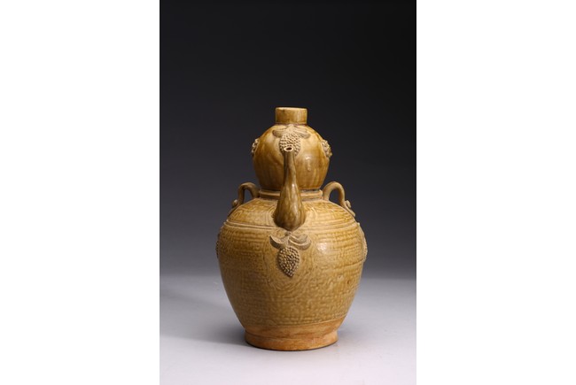 With applied handle and applied grape cluster motifs on a double gourd form.