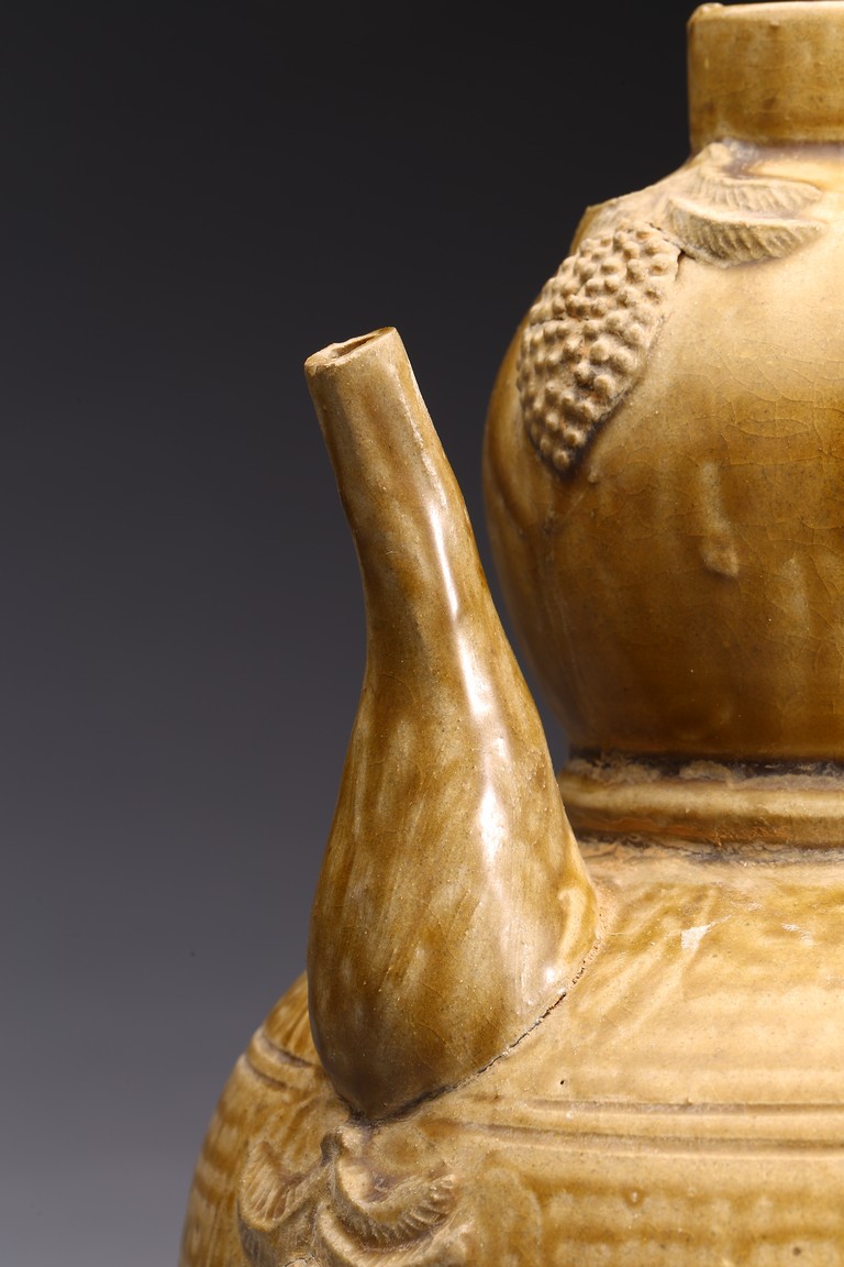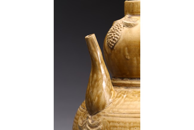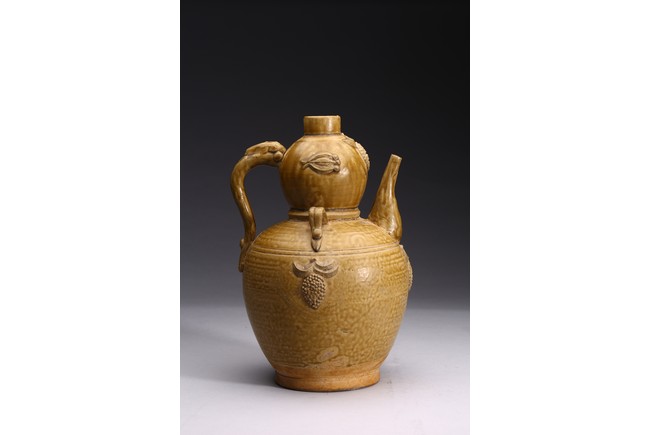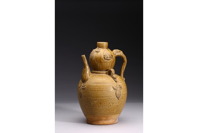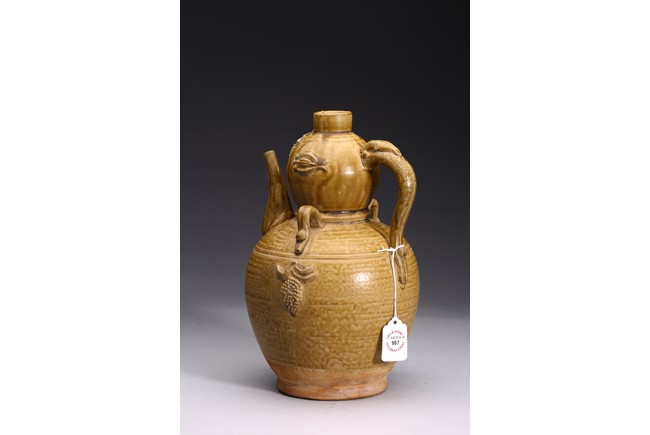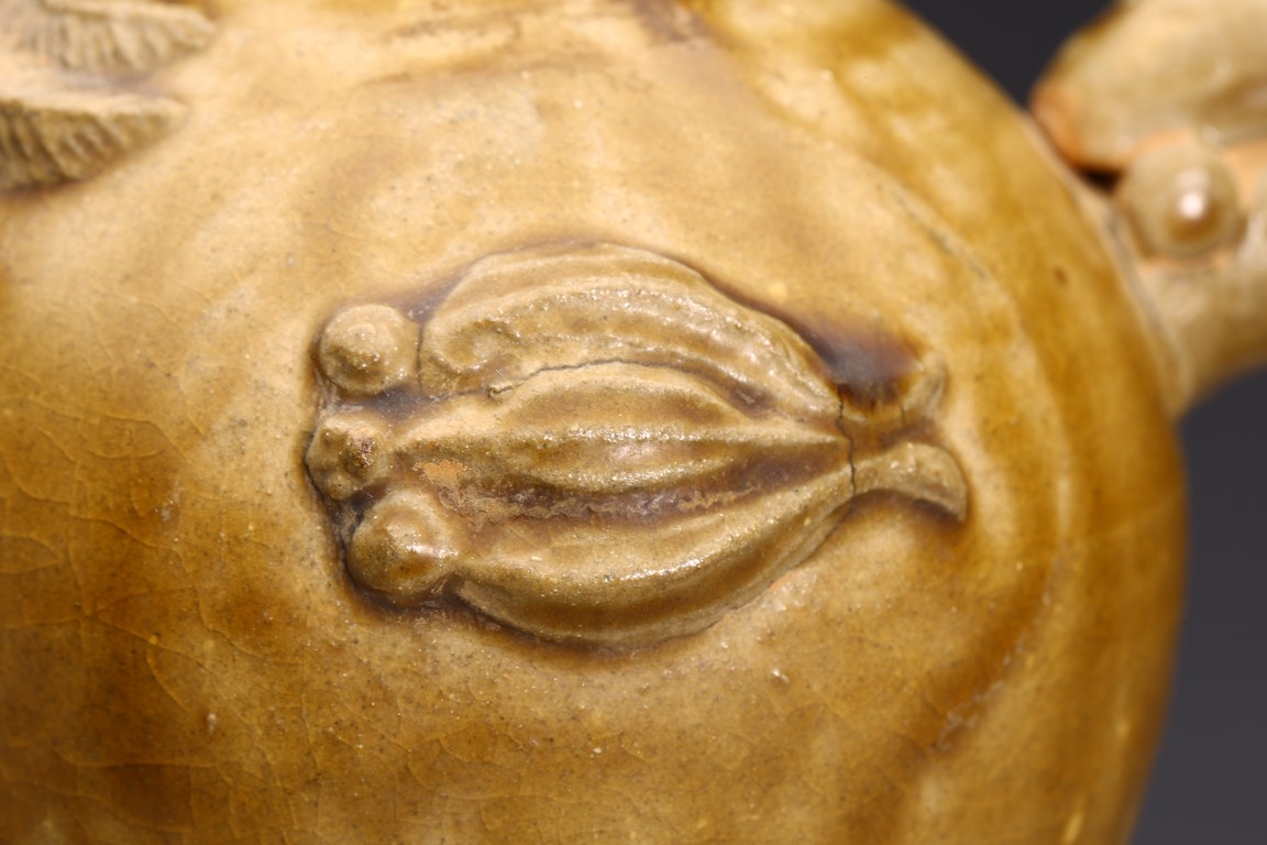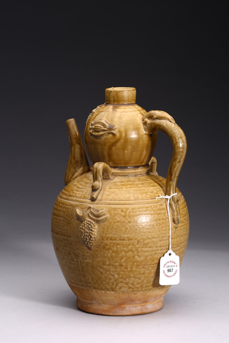 AN OLIVE GREEN STONEWARE TEAPOT 明 醬釉葫蘆式壺