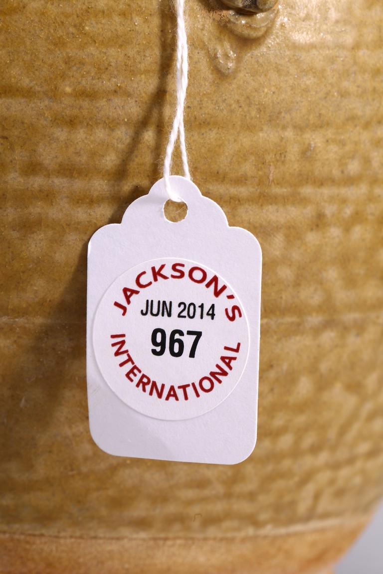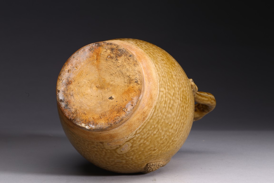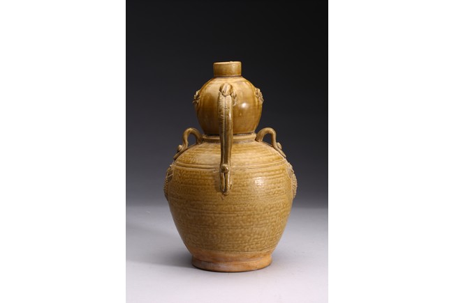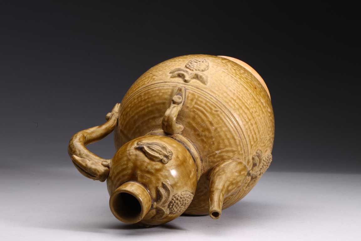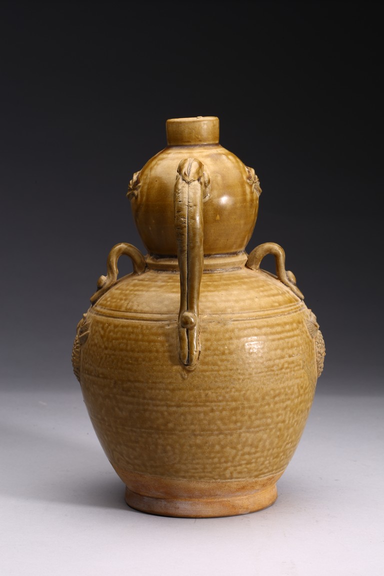 AN OLIVE GREEN STONEWARE TEAPOT 明 醬釉葫蘆式壺