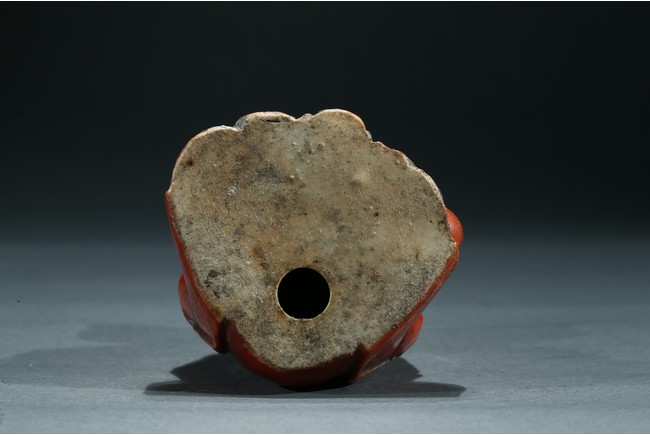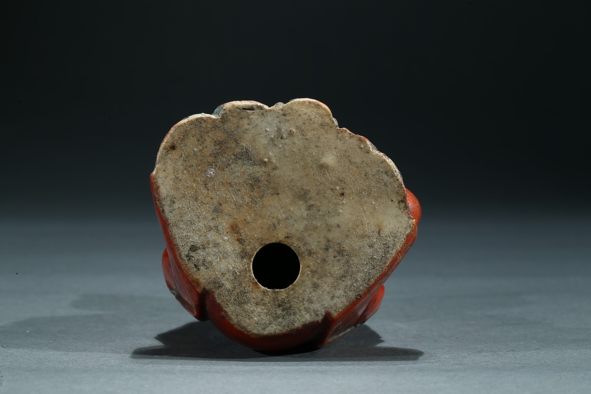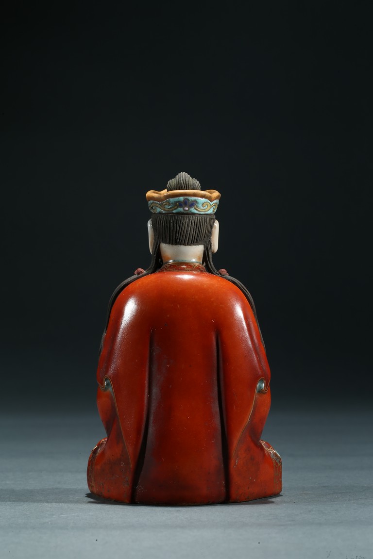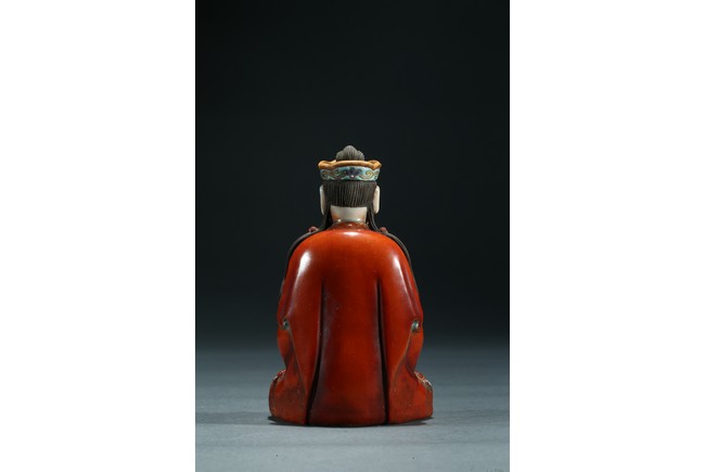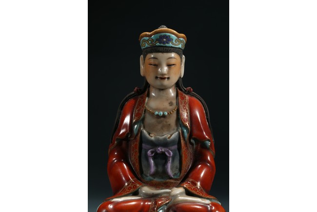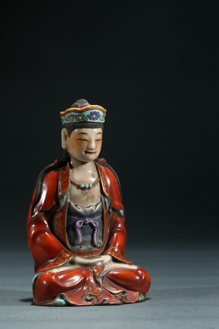 The well modelled ceramic figure is shown seated with hands held together rested upon feet, wearing red-glazed long robe revealing chest, face with serene expression. Late Qing Dynasty period.