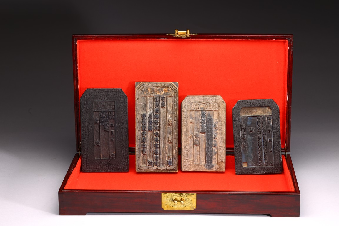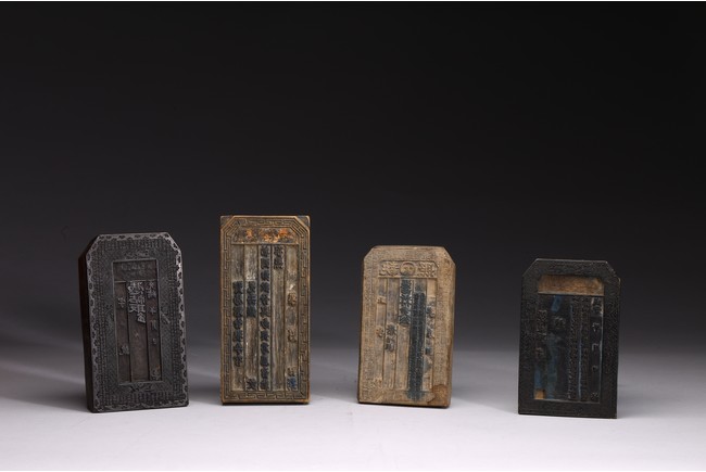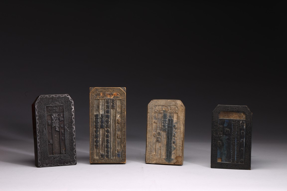 Comprising of four rectangular wood stamps, each inscribed with the name of the bank to the top, blank date, and blank amount at the center. Qing Dynasty period.