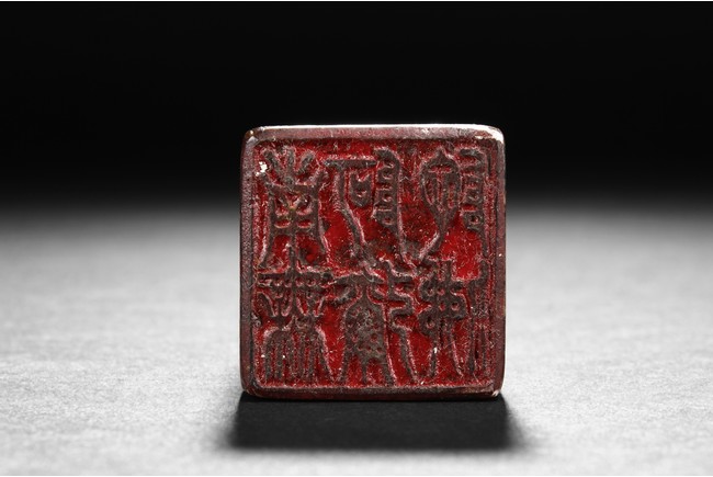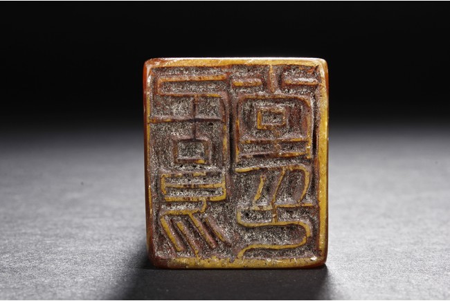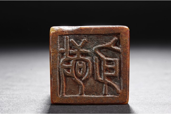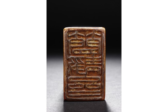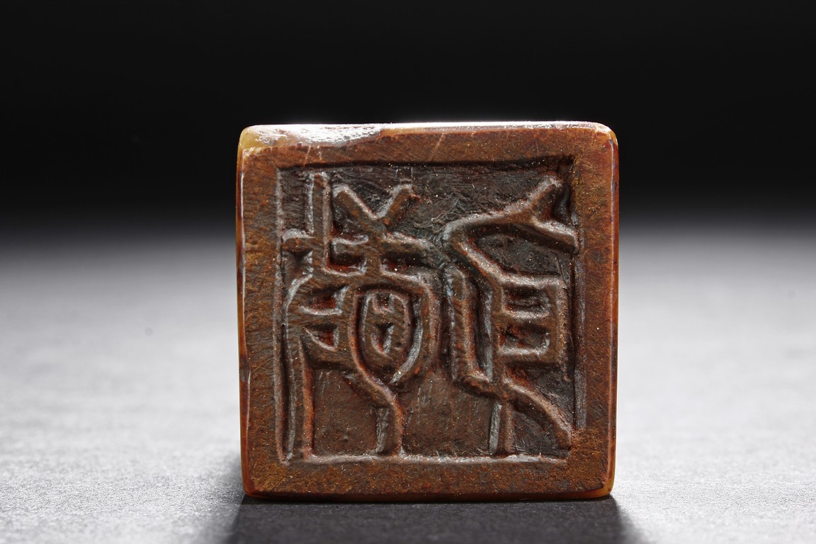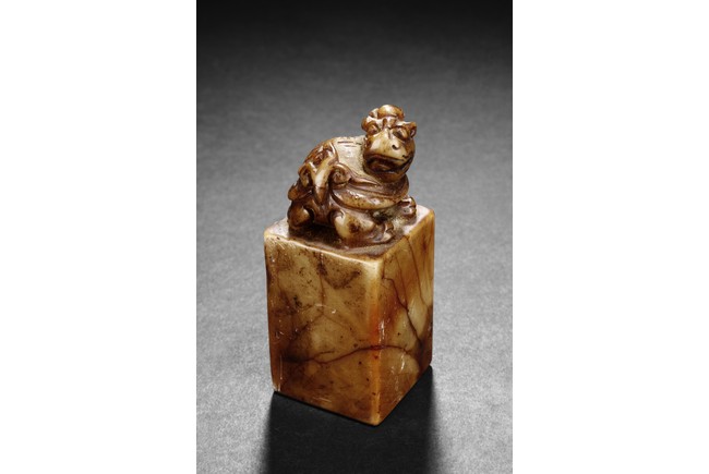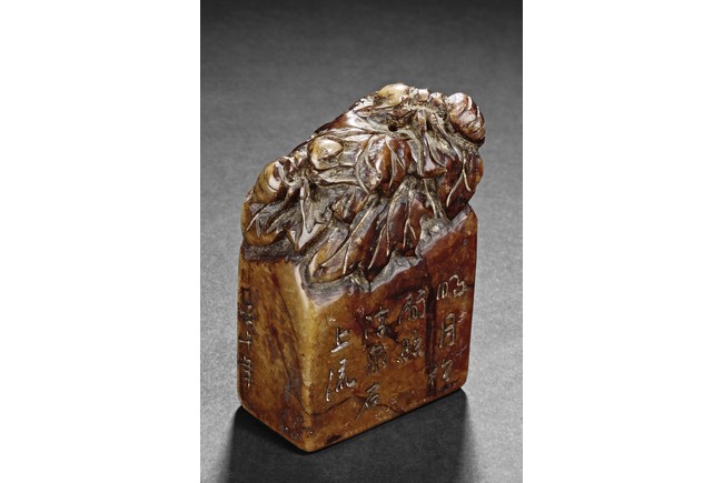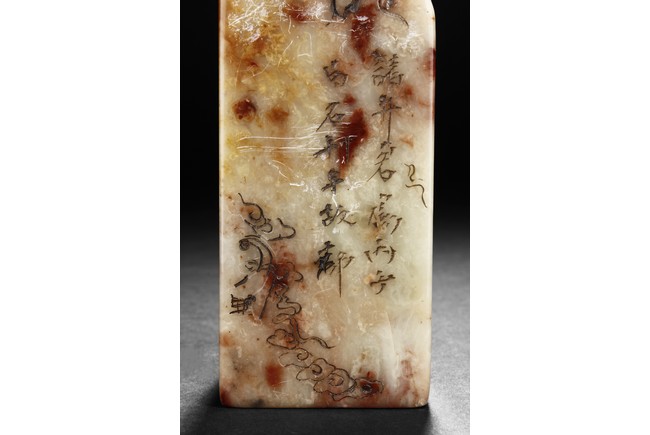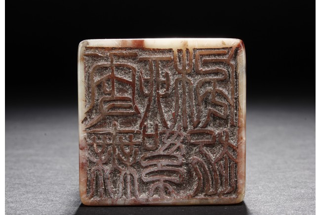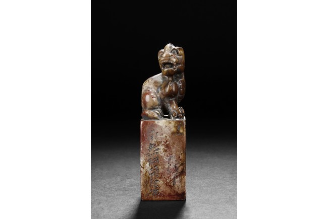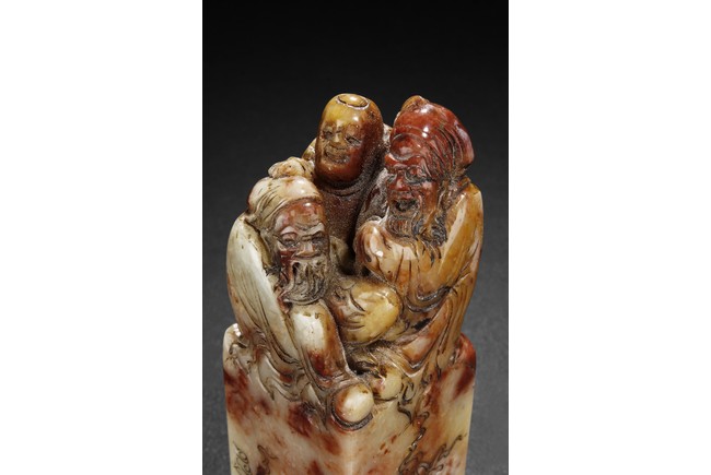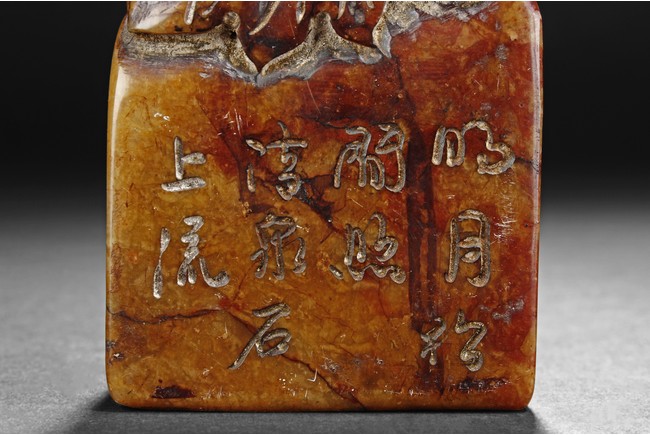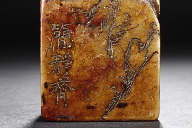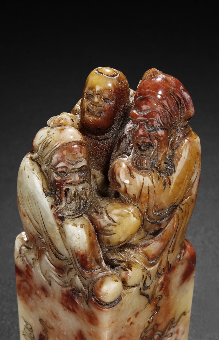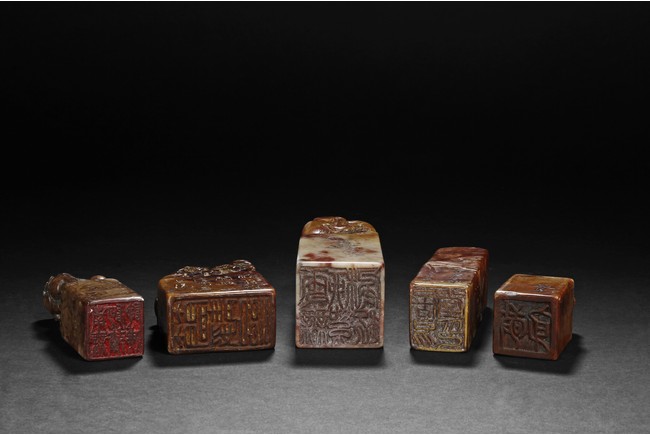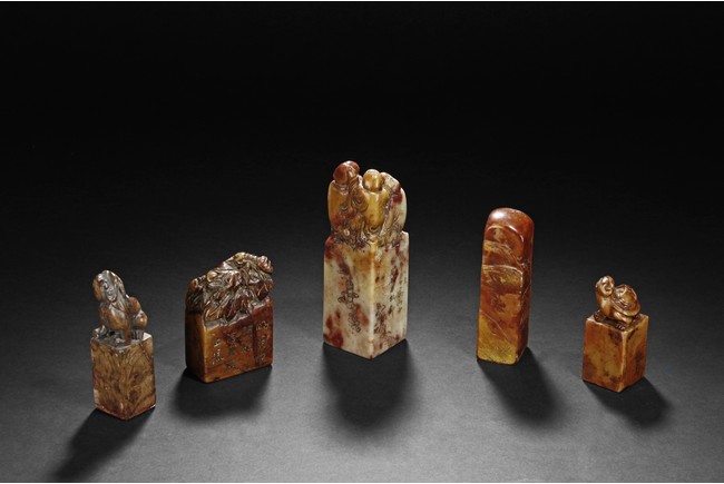 The group includes five shoushan stone stamp seals, mostly in tall rectangular form, with themes such as mythical beast, elders, poetry, and landscape, the color ranging from dark brown to grayish white, intertwined with red and other colors, bottom carve