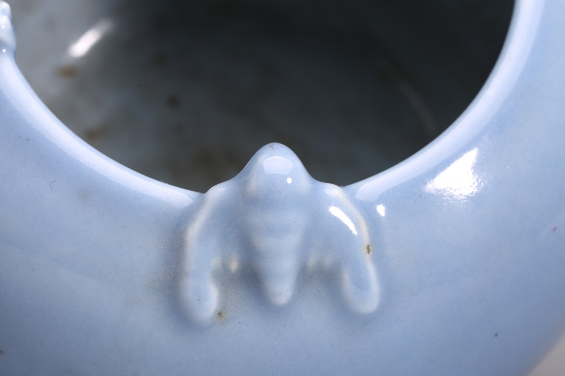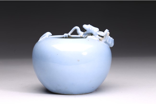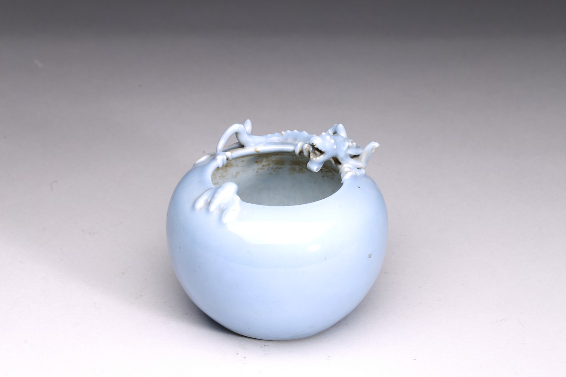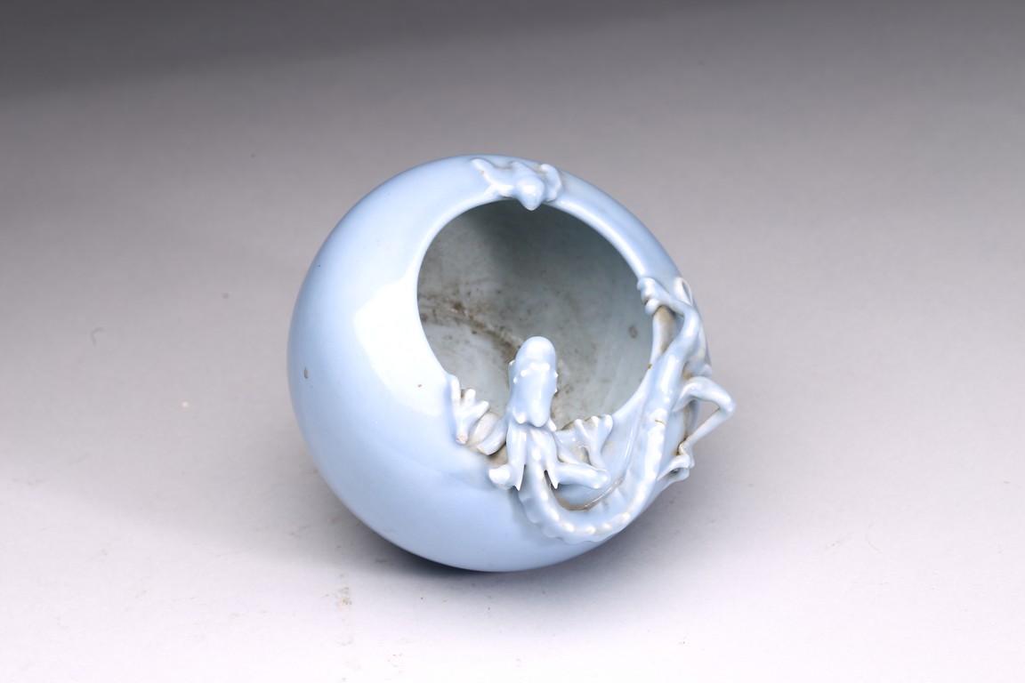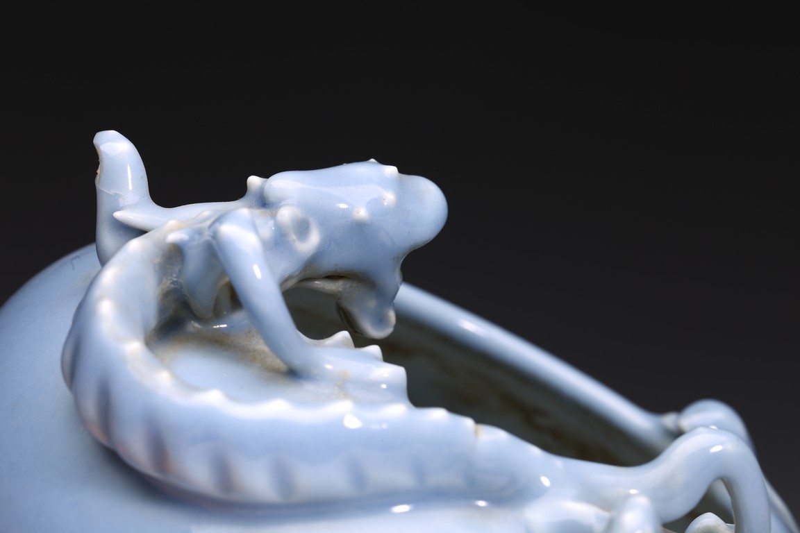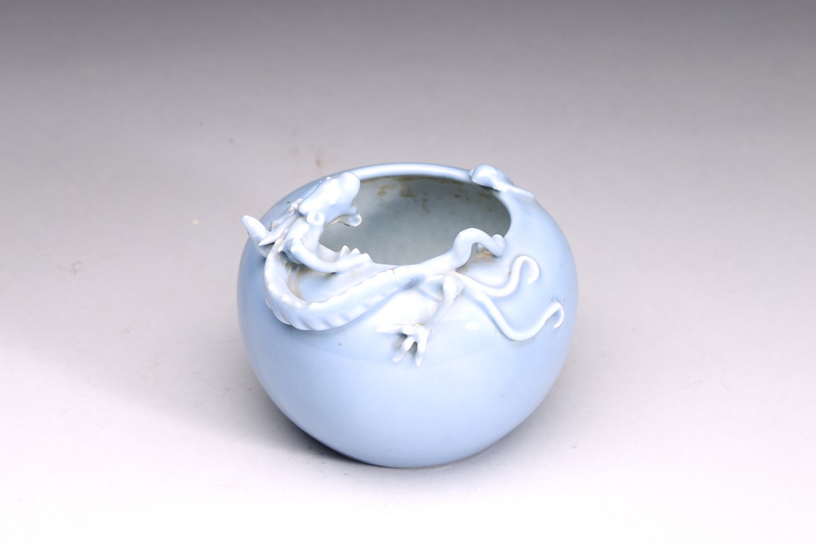 Of globular form, the body moulded in relief with a sinuous chilong around mouth rim, overall suffused with attractive blue glaze, base with apocryphal six character Yongzheng mark. Qing Dynasty period.