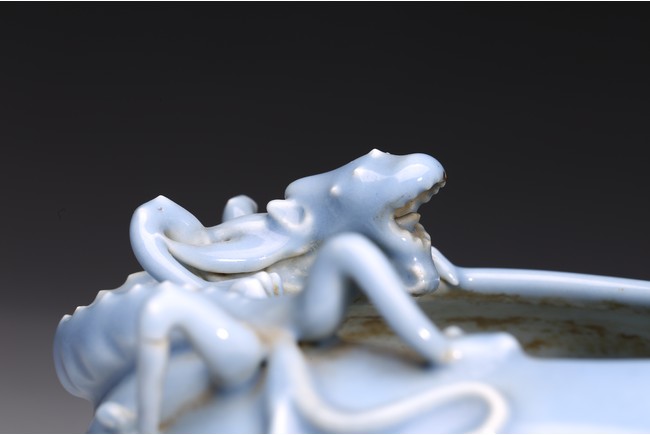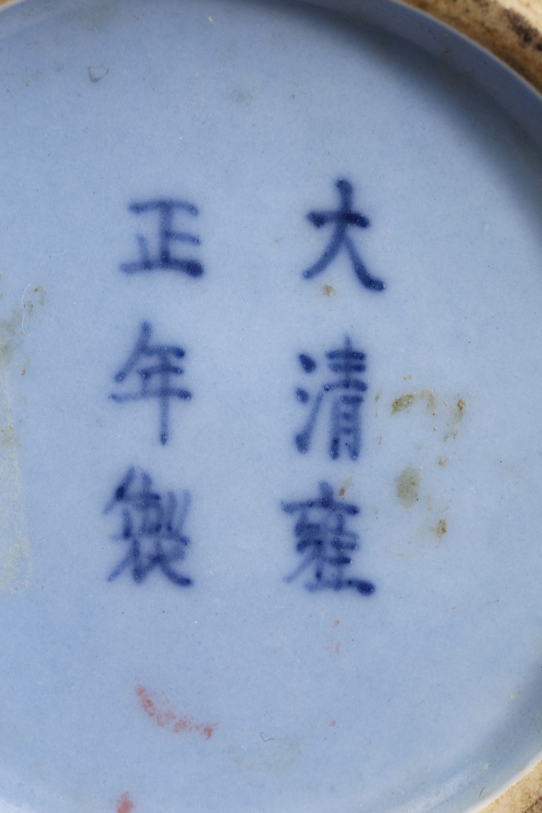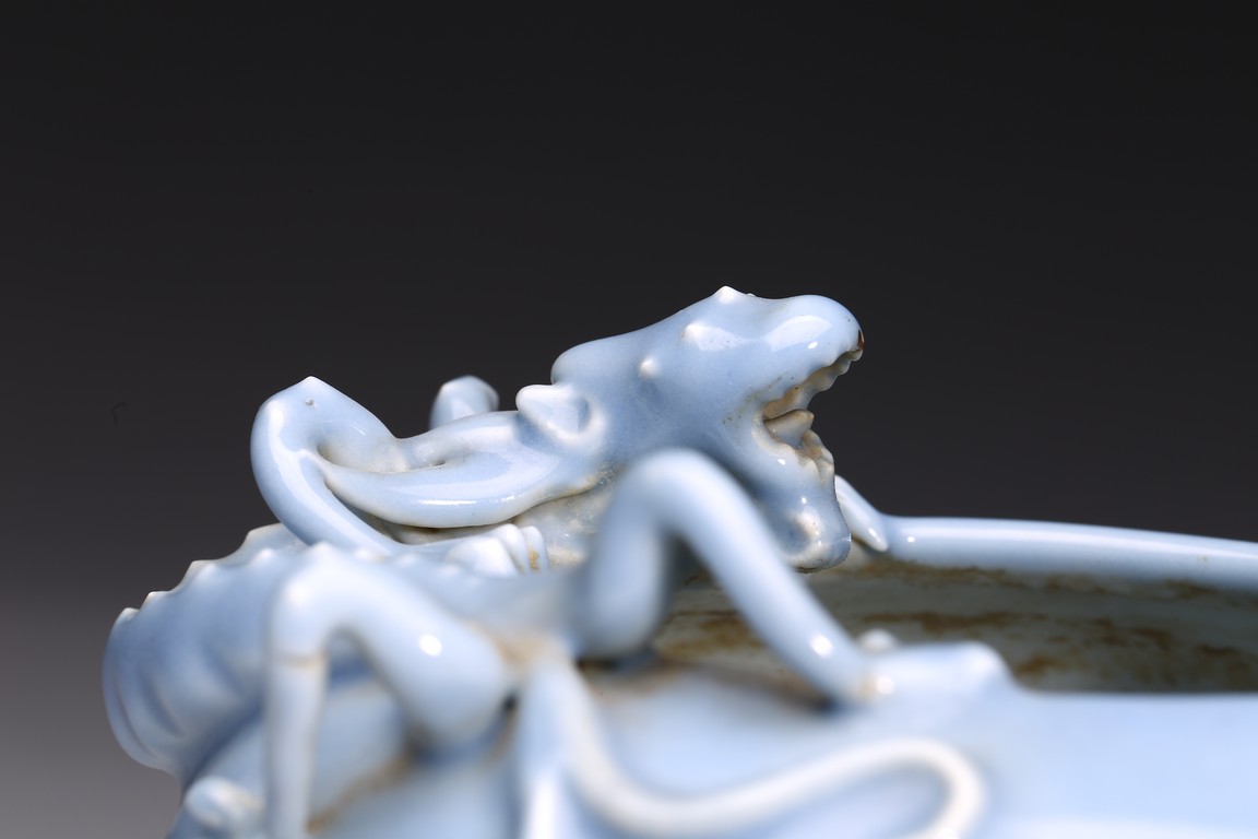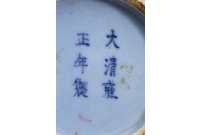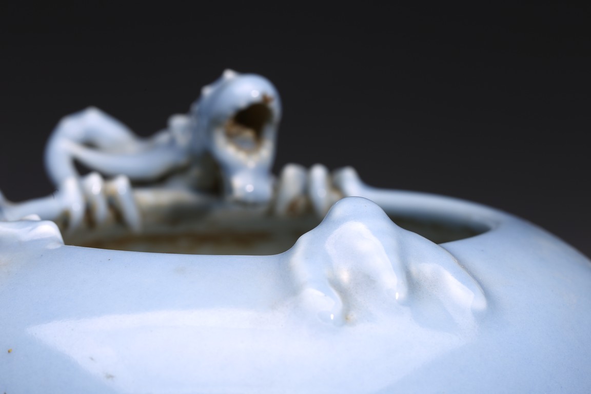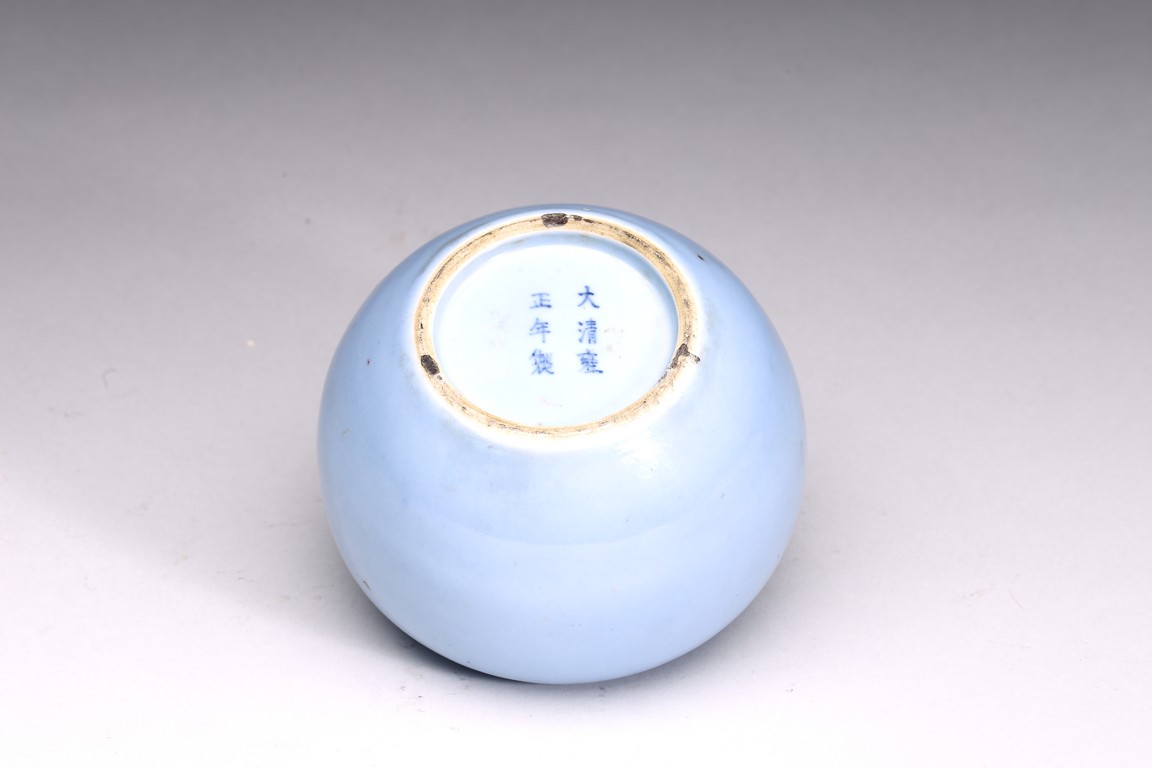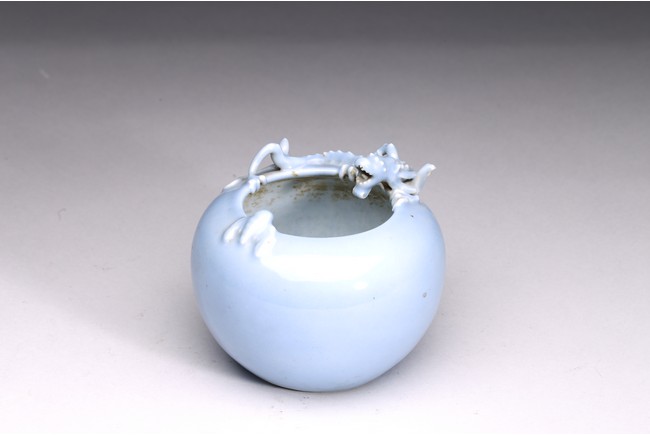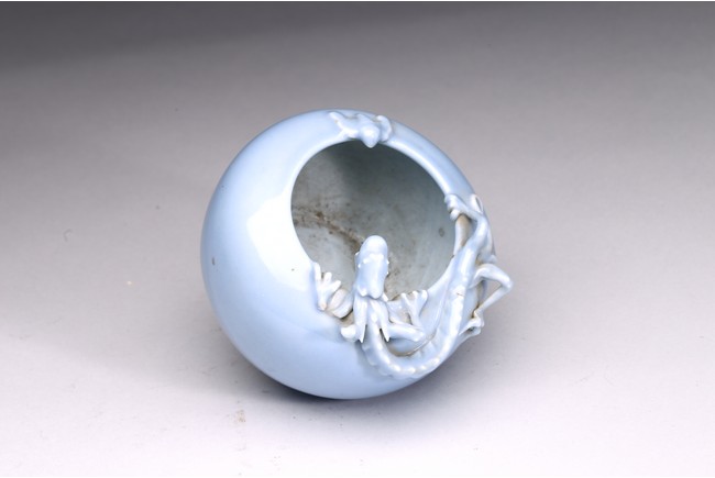 Of globular form, the body moulded in relief with a sinuous chilong around mouth rim, overall suffused with attractive blue glaze, base with apocryphal six character Yongzheng mark. Qing Dynasty period.