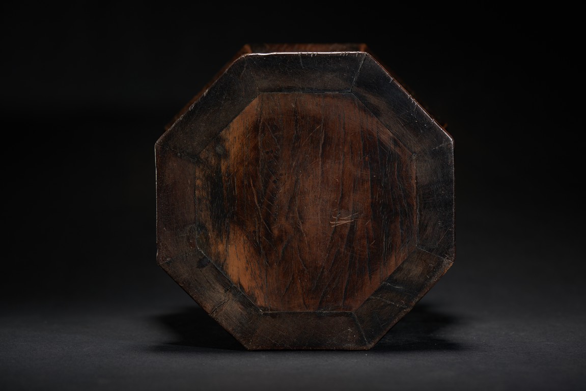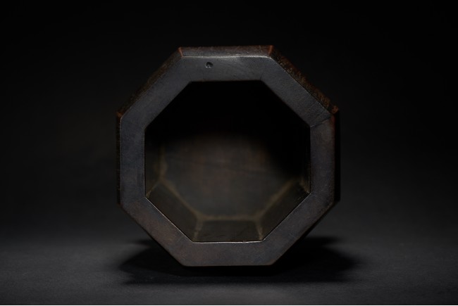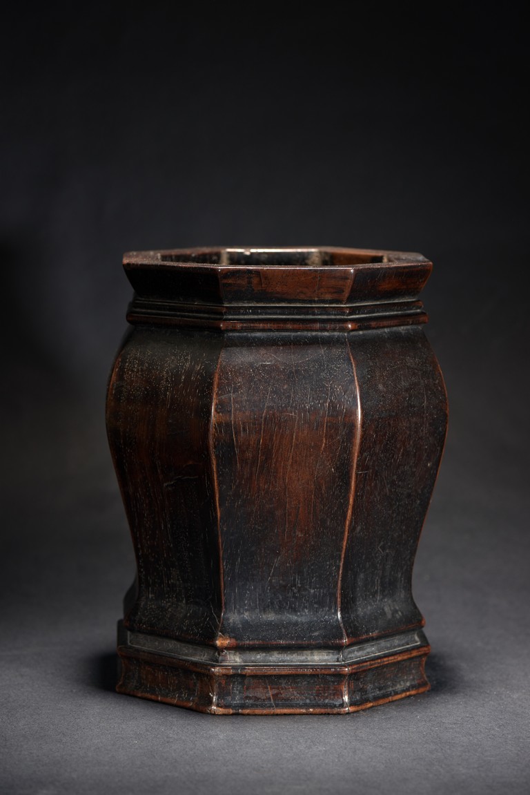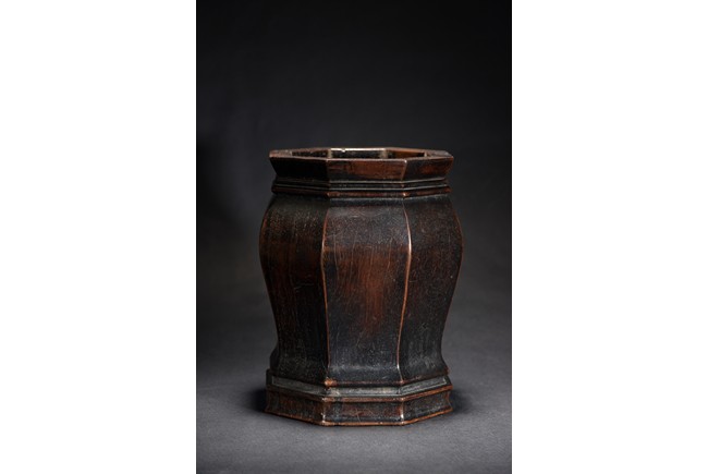 The planter is of shaped square section with sides rising to everted rim, overall suffused with opaque mottled red and purple tone glaze ending in the line on the foot showing the brown tone base.