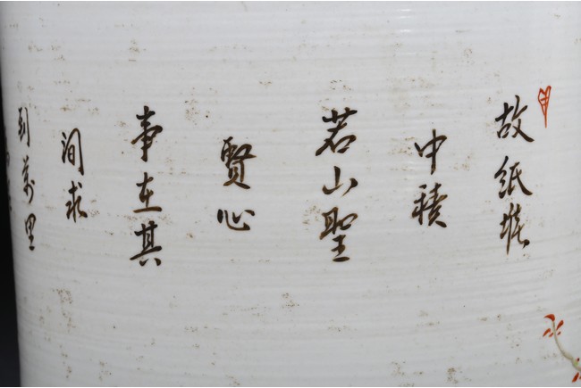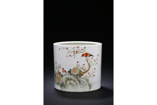 Of large cylindrical form, delicately enamelled with blossoming chrysanthemum issuing from grassy rockwork, one red and black bird standing on the rock peak turn its head back look at another bird perching on the gnarld plum fower branch, the reverse with an poem inscription in stylized script, signed Xu Dasheng. Republic period.