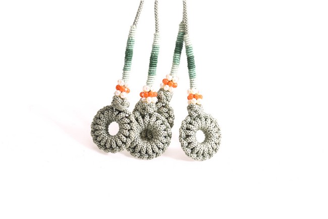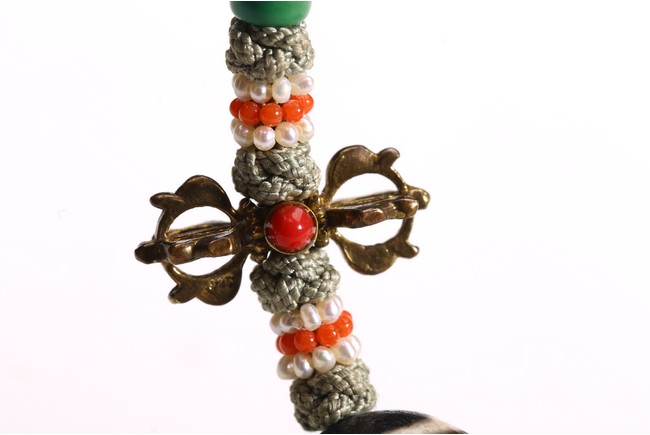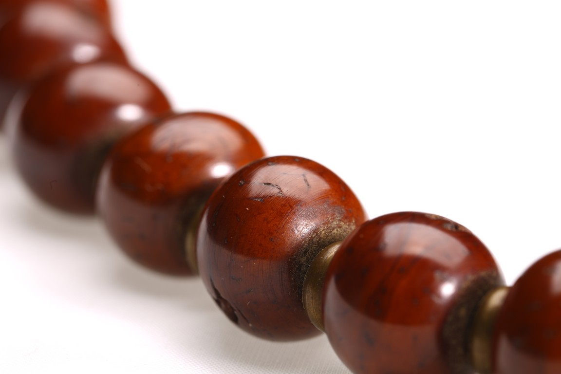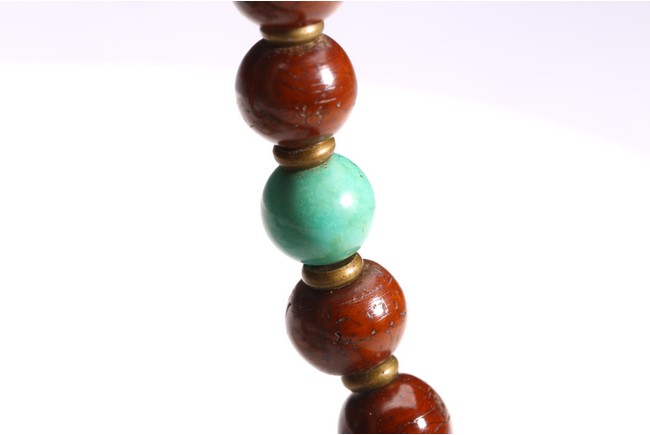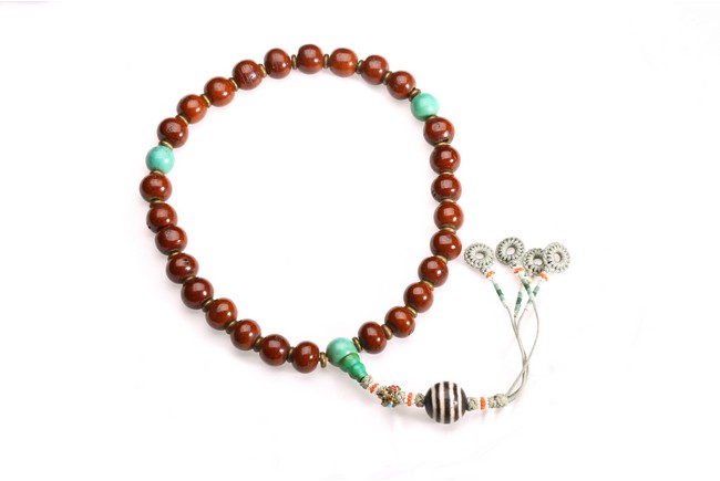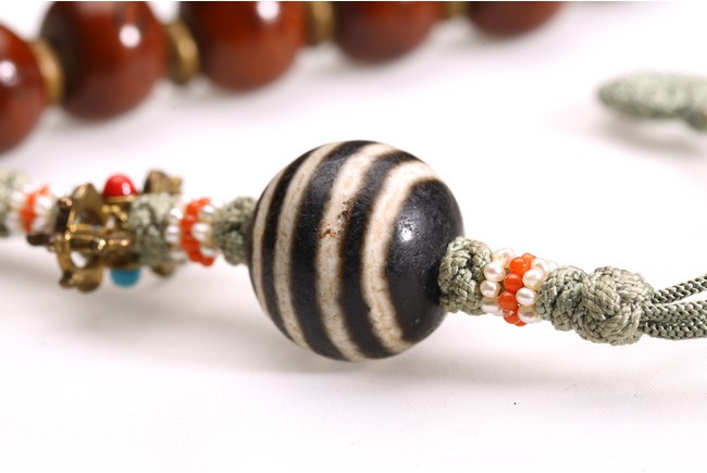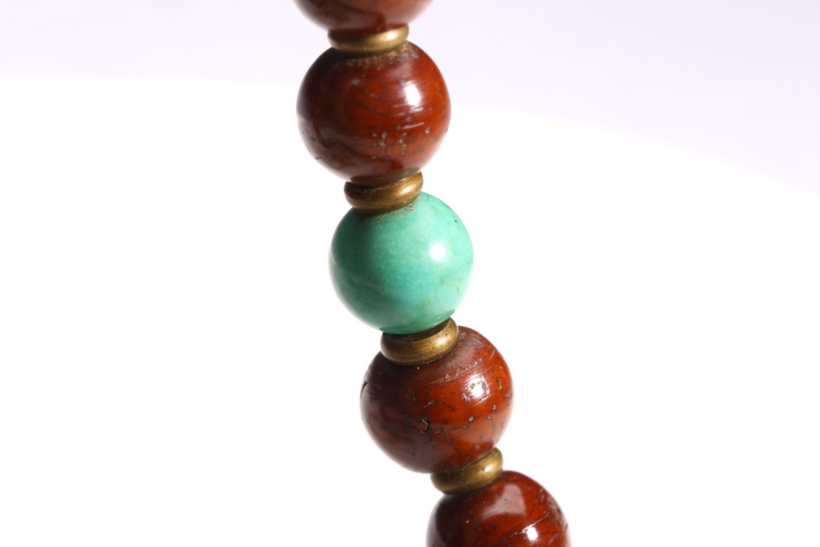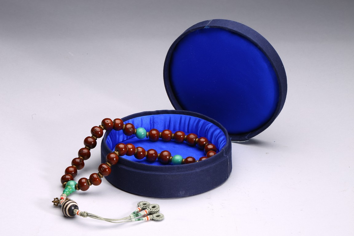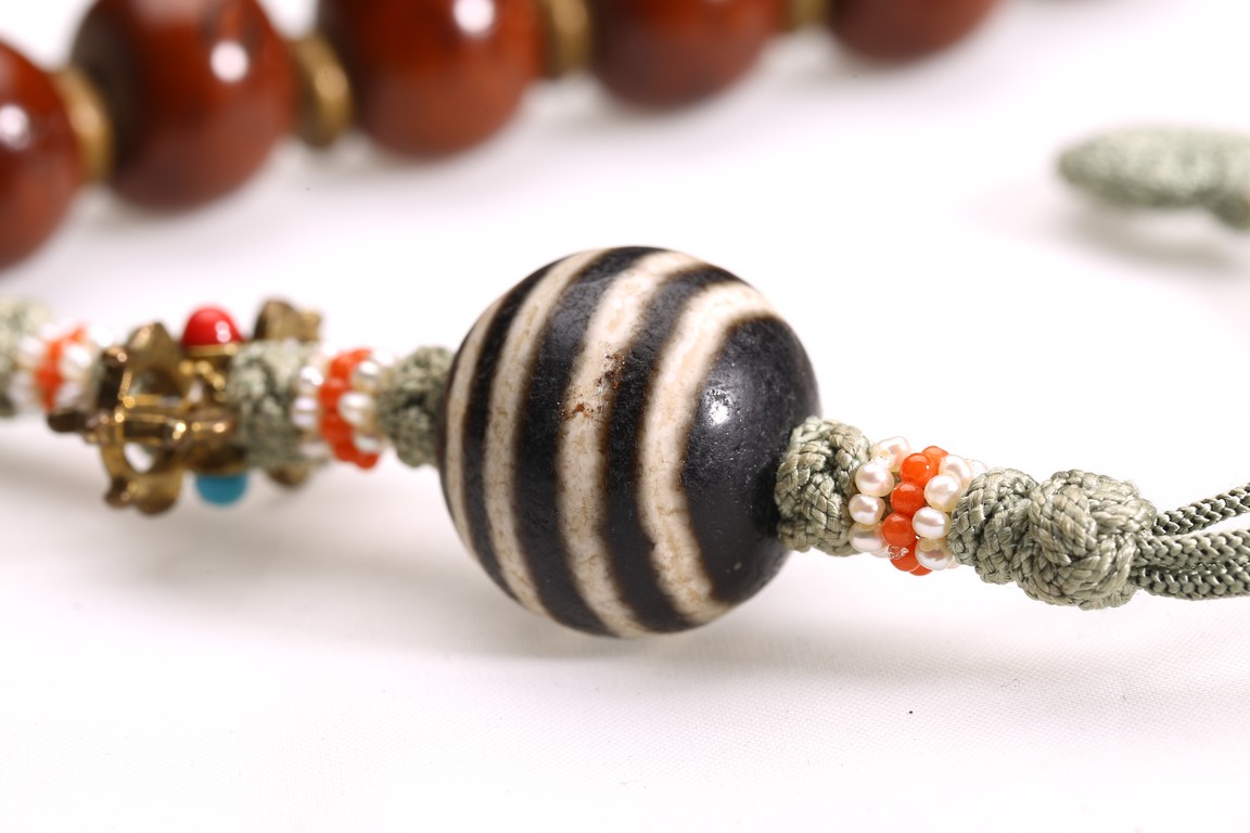 Comprising of twenty seven brown tone Puti beads, divided by three turquoise beads, suspending a Dzi bead with strips design. Qing Dynasty period.
