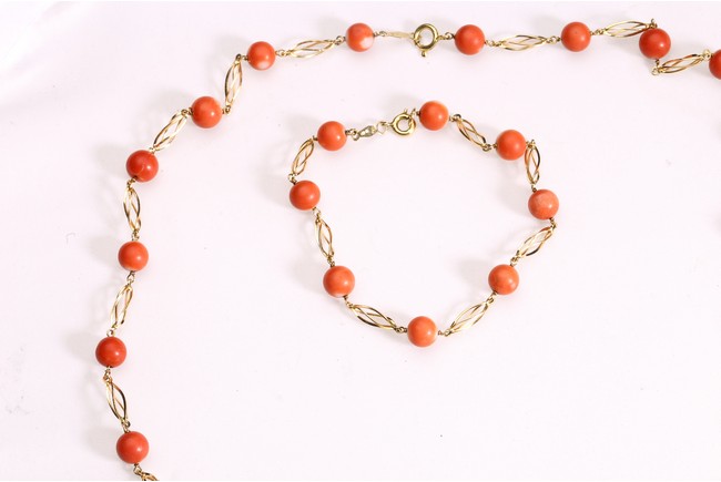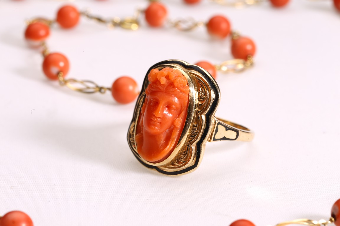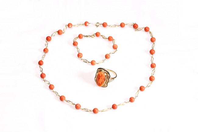 Comprising of a 18K gold carved coral necklace, bracelet, and ring.