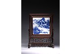 A BLUE AND WHITE PANEL MOUNTED TABLE SCREEN
