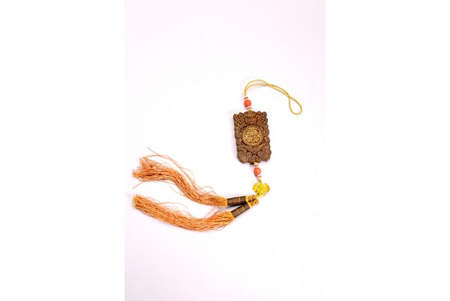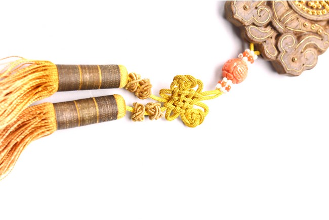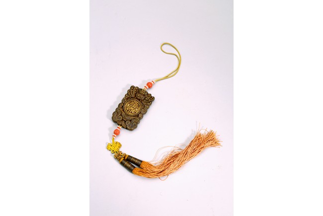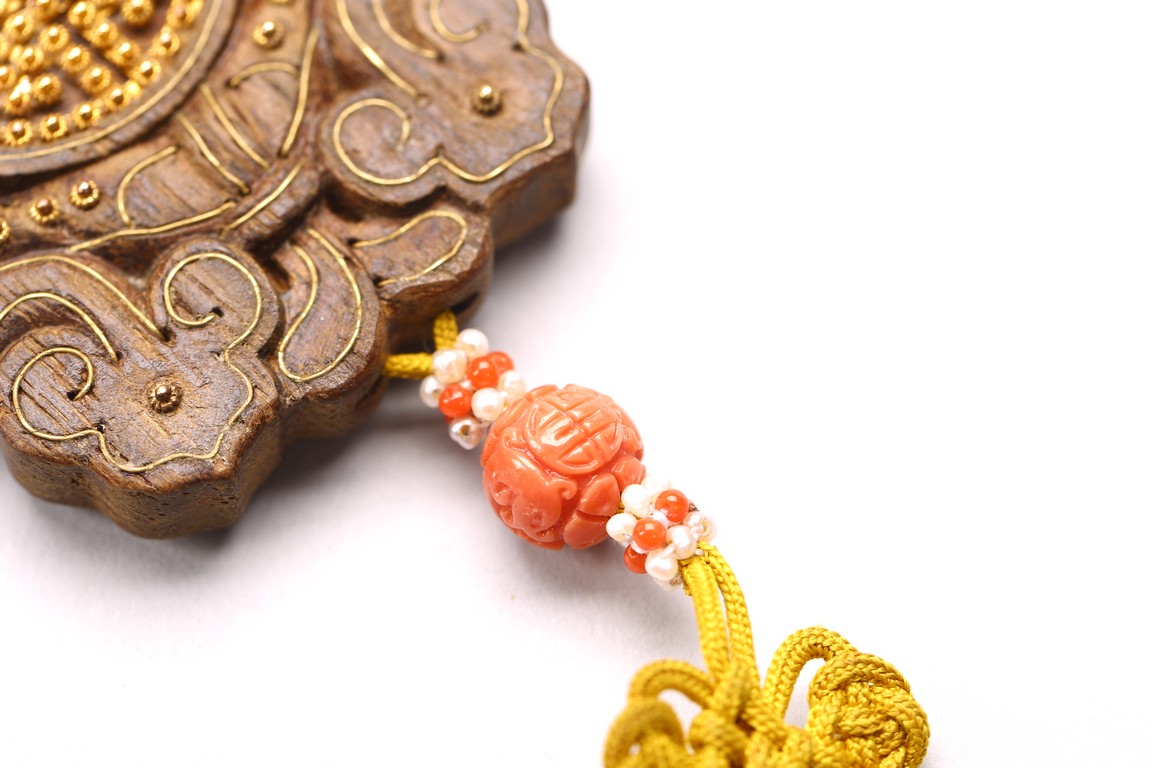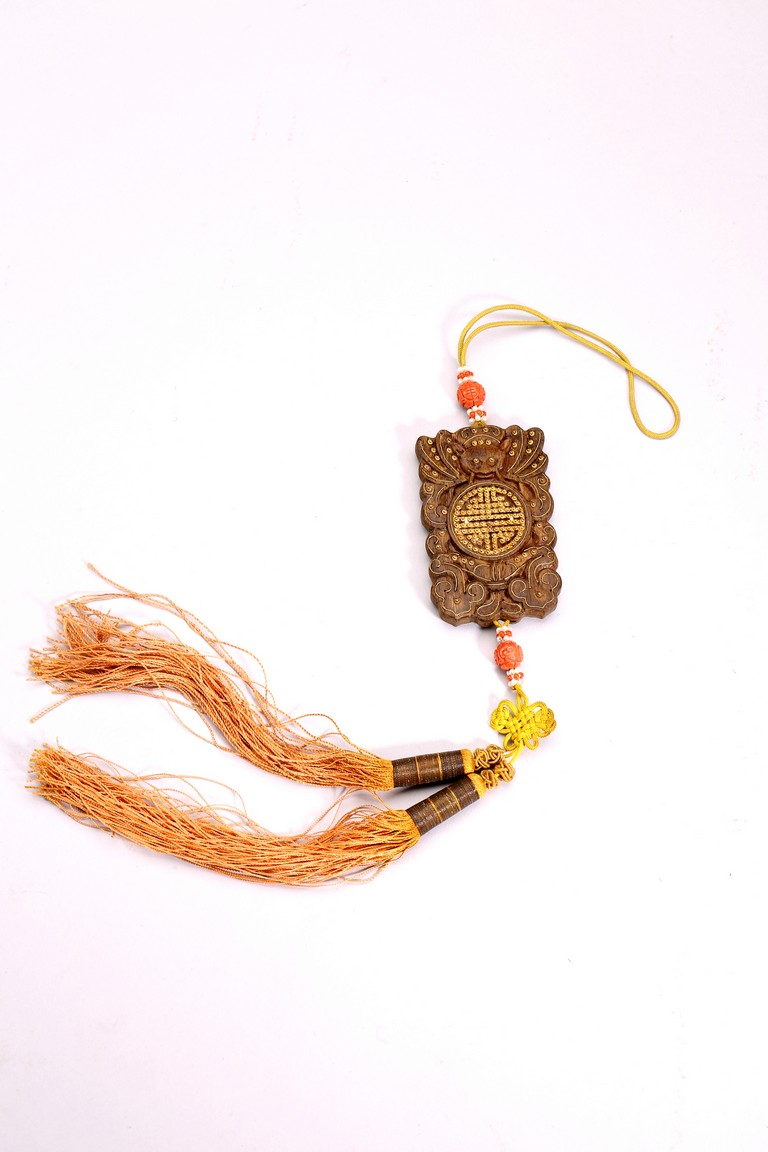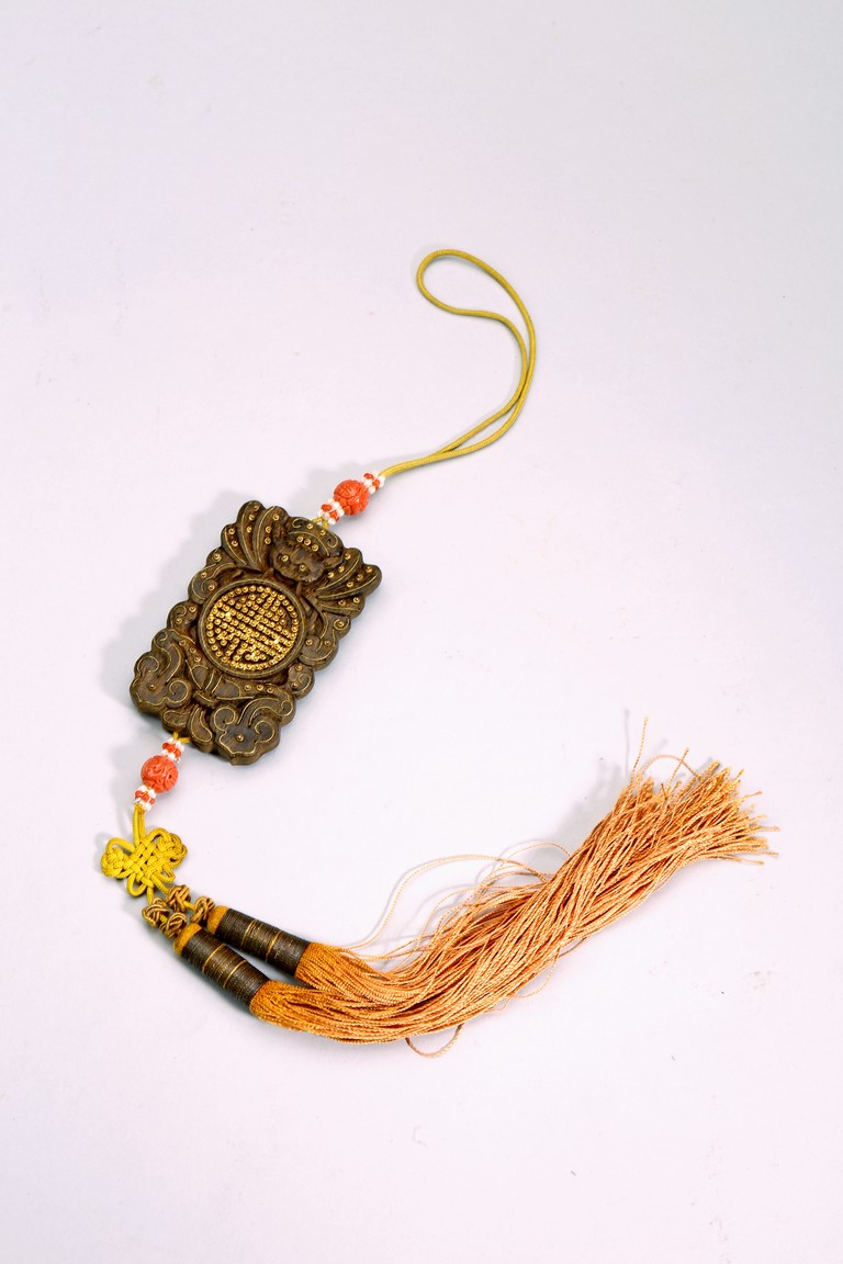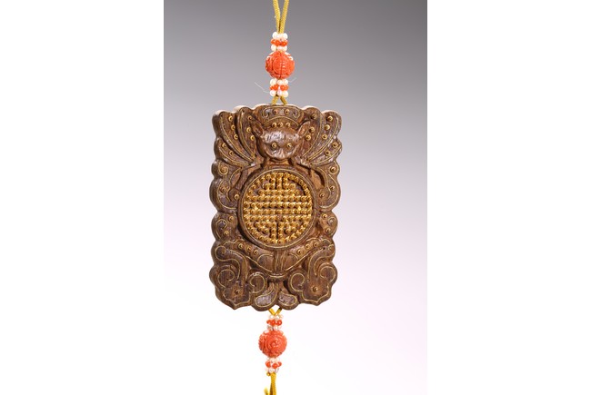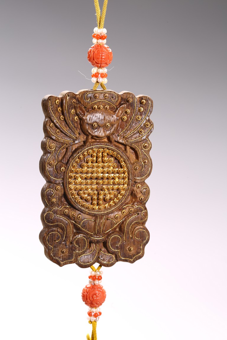 Of rectangular form, the plaque carved with an auspicious bat atop a stylized shou character inlaid with gold beads, the bat and ruyi decoration outlined by gold wire inlaid. Qing Dynasty period.