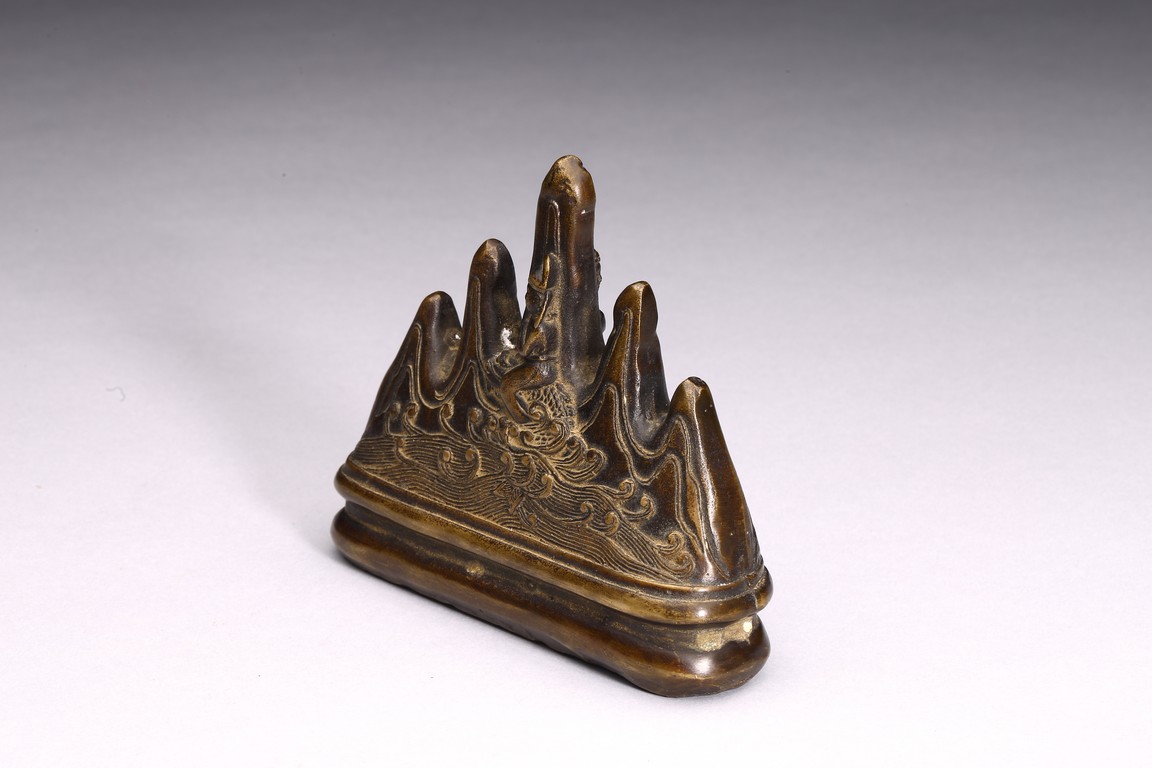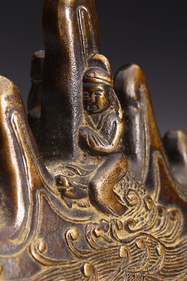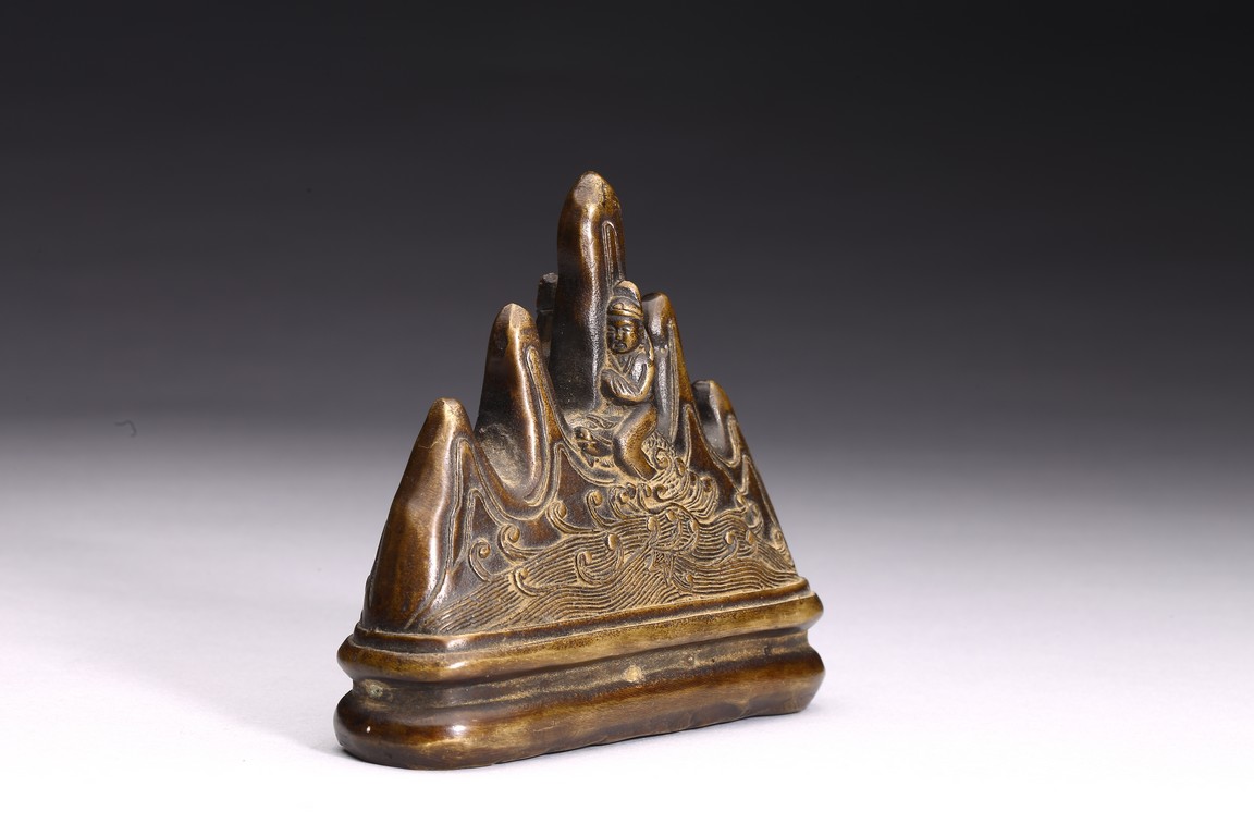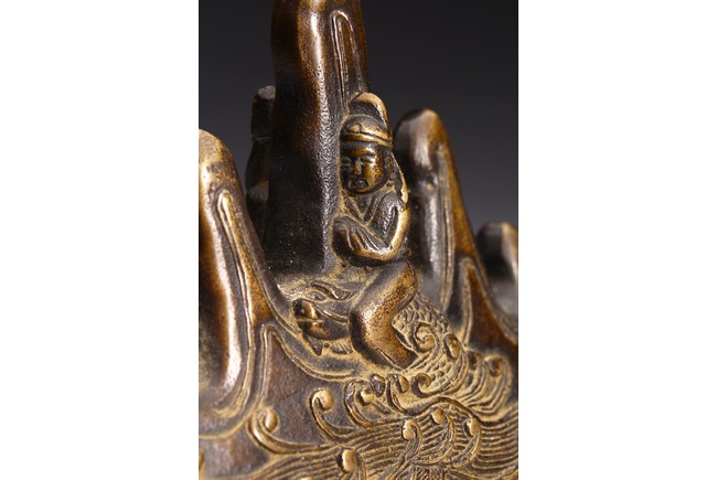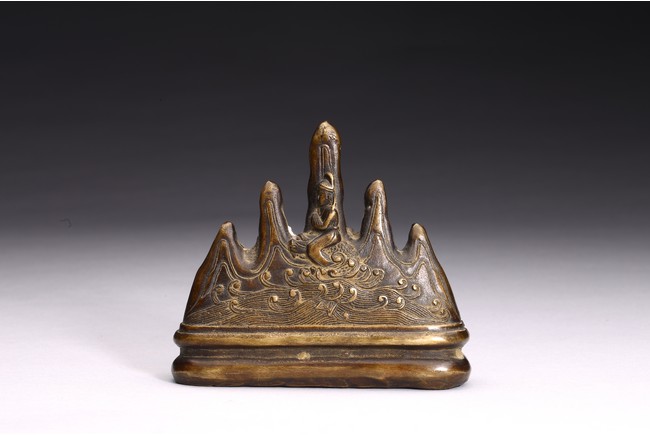筆架以五嶽山為形,文曲星獨佔鰲頭立海水江崖之上,寓意美好,有高中狀元之意。其形古拙大氣,銅質優良,包漿醇熟,底部“宣德年制”方款。