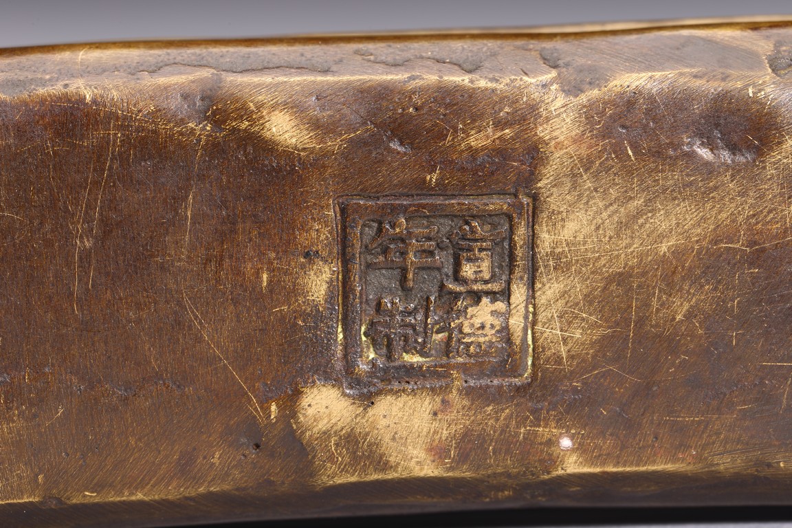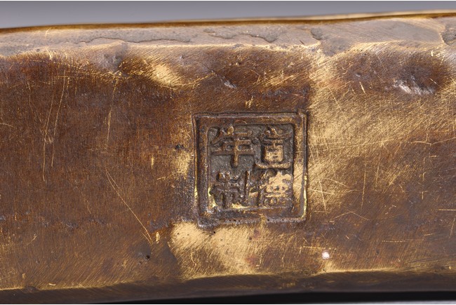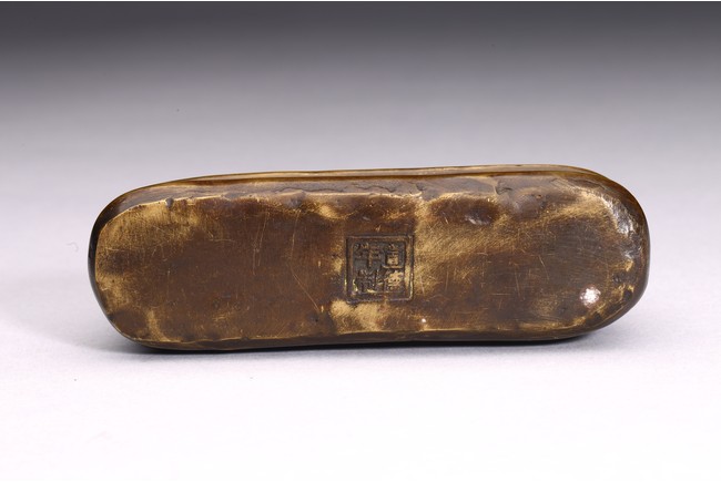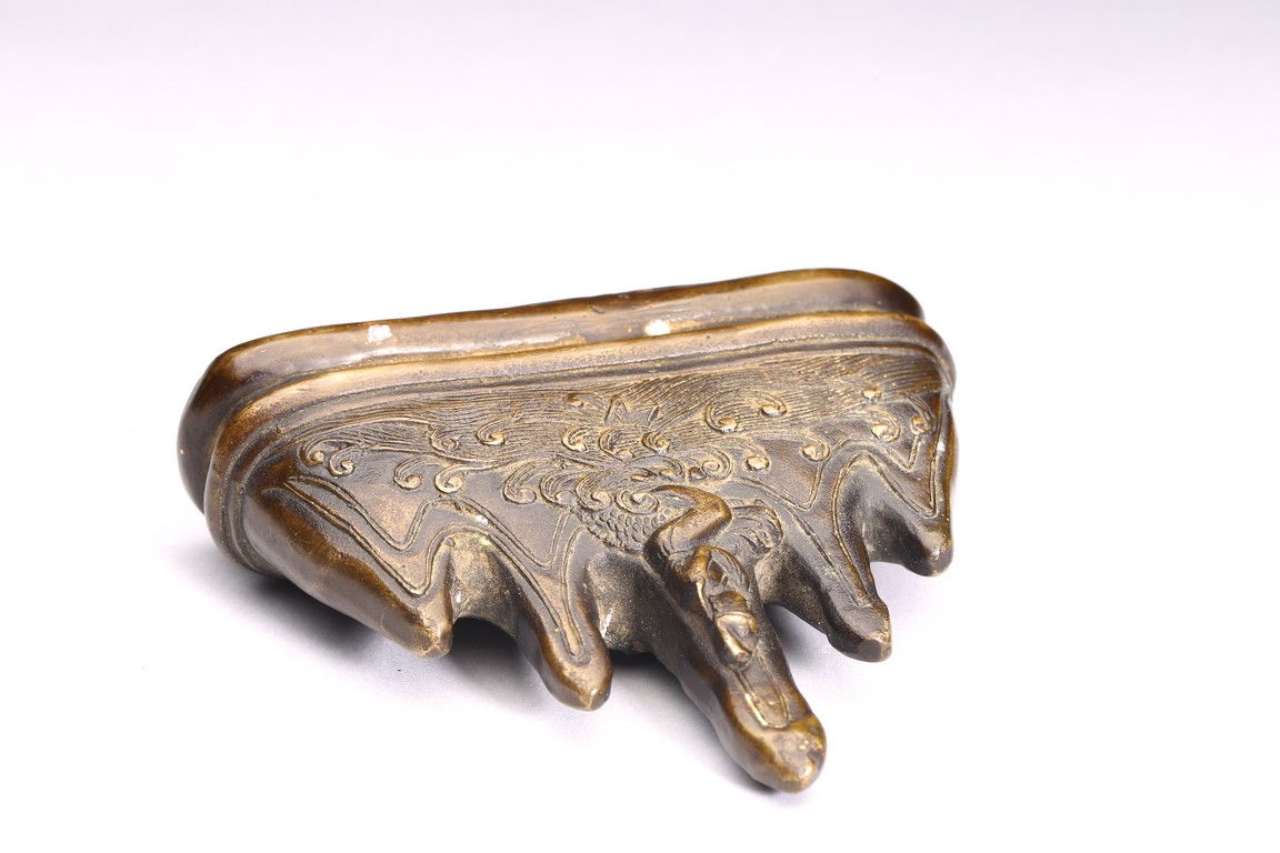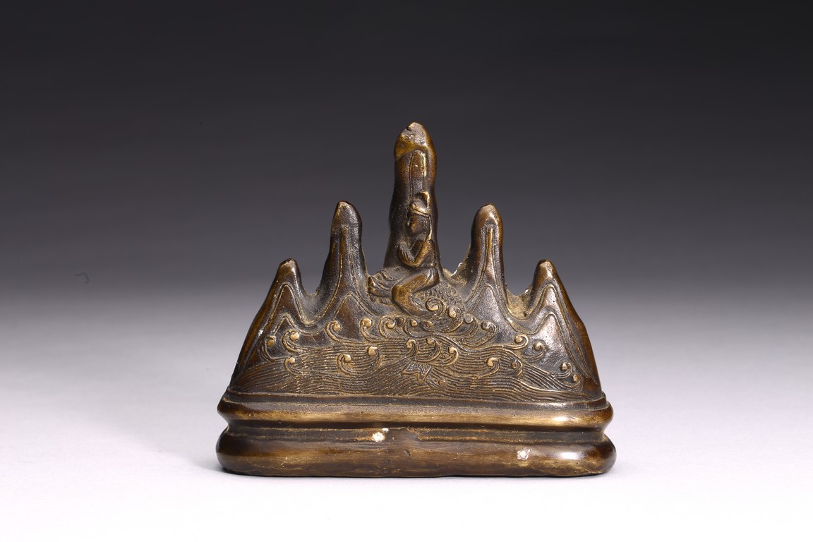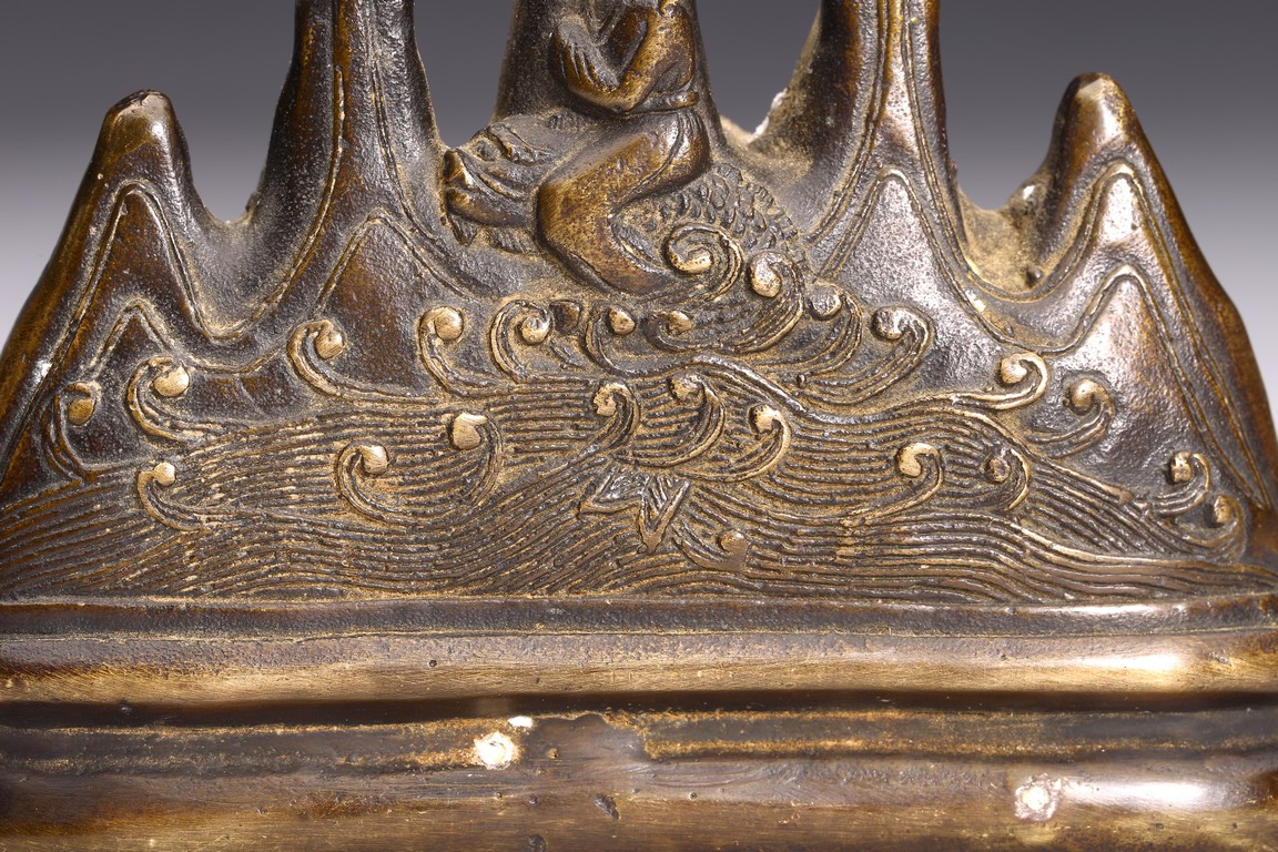 筆架以五嶽山為形,文曲星獨佔鰲頭立海水江崖之上,寓意美好,有高中狀元之意。其形古拙大氣,銅質優良,包漿醇熟,底部“宣德年制”方款。