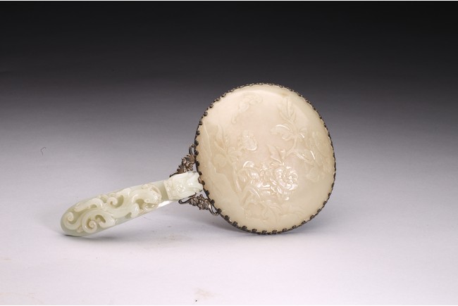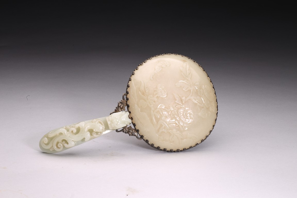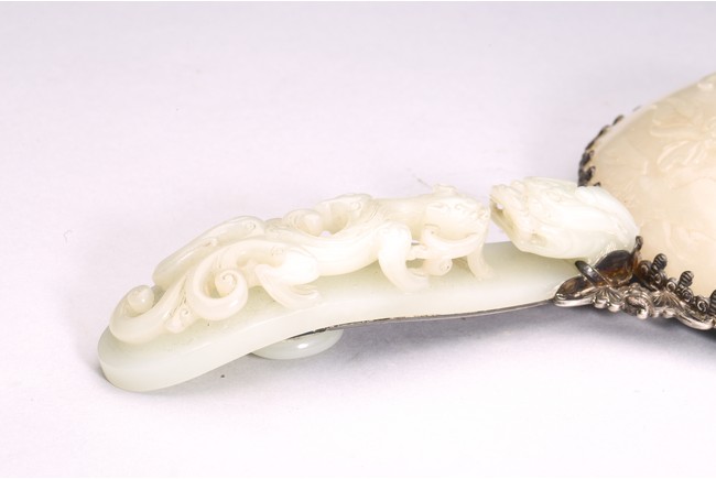 The ovoid plaque carved in low relief with a bat flying next to large blossoming peony flowers growing from rock base, the white jade belt-hook carved with a chilong along the shaft confronting a dragon-head terminal, the back with a circular knob for attachment, mounted as a hand mirror. Qing Dynasty period.