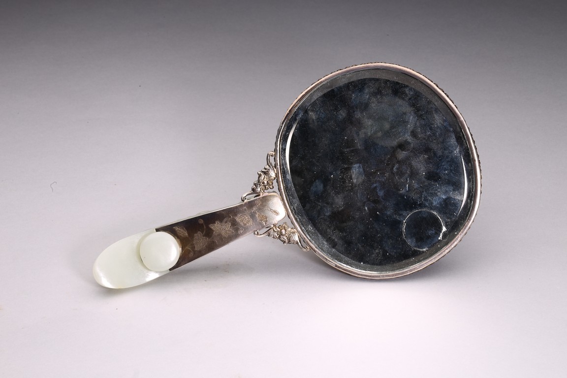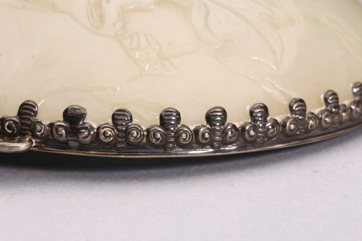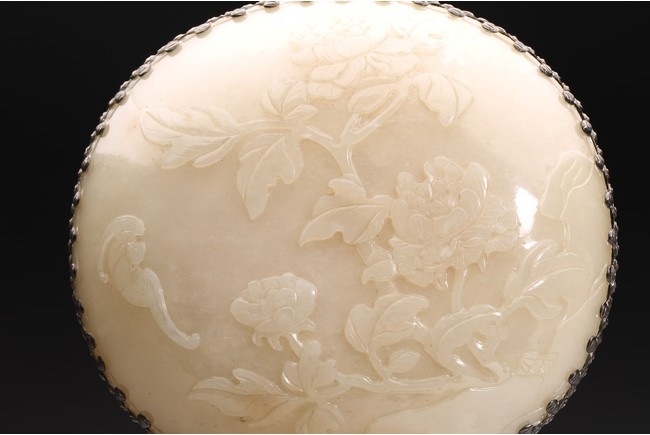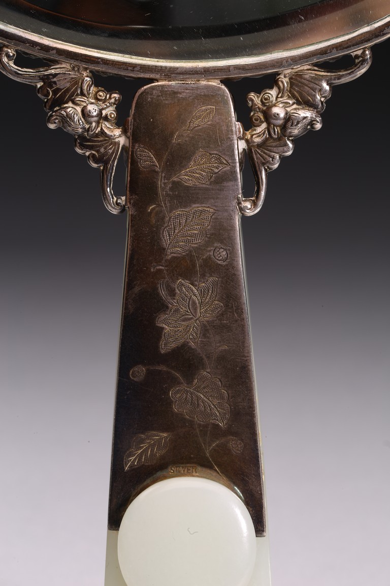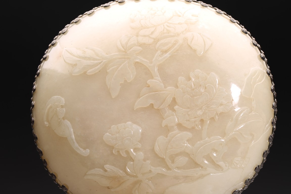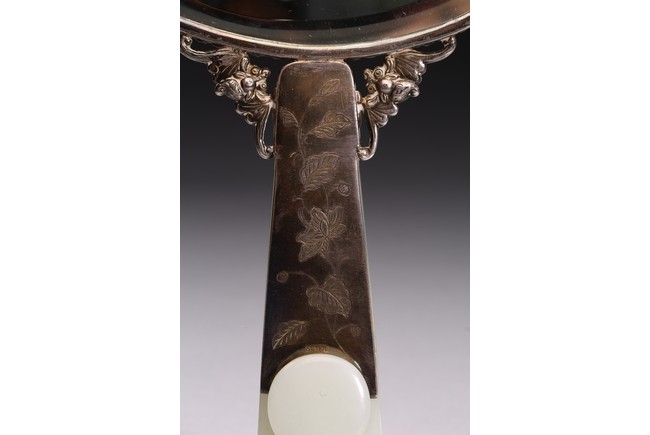 Provenance: Property from a private collection, Los Angeles 最早手鏡始於戰國時期,其小巧玲瓏,便於攜帶。後來加之以雕飾,以玉、寶石等稀有珠寶嵌入手鏡,以此彰顯主人的身份地位。此手鏡以銀為基底,玉為輔,在鏡面背部以銀鑲邊嵌入玉刻牡丹圖,手柄處也以銀為基底,將玉刻螭龍嵌入鏡柄。其做工精細、大氣,白玉色澤明麗鮮潤、玉質縝密細膩,又以牡丹和螭龍為飾寓意主人生活美好,感情和睦,吉祥富貴。 來源:洛杉磯私人藏家收藏