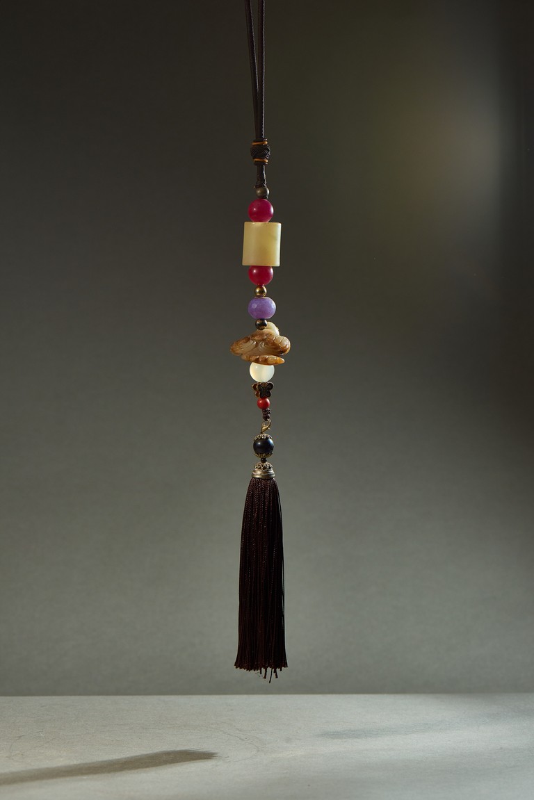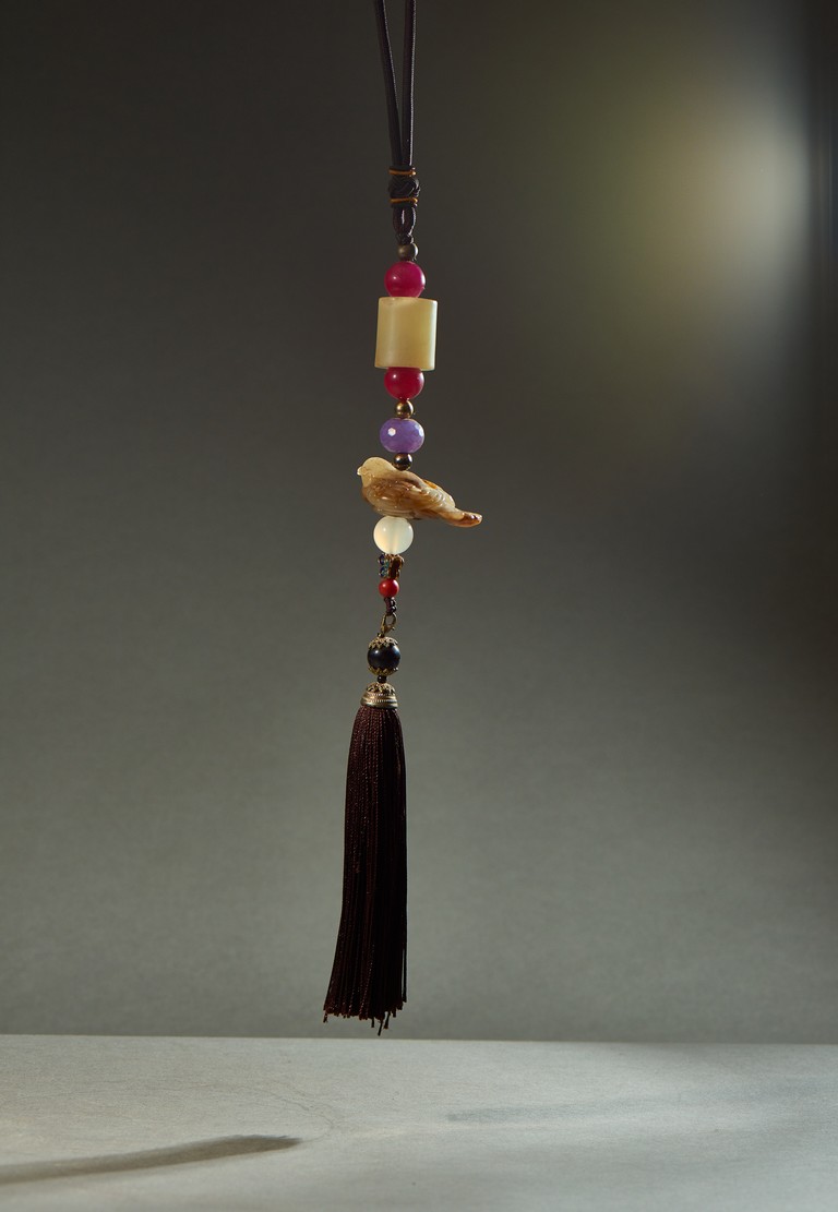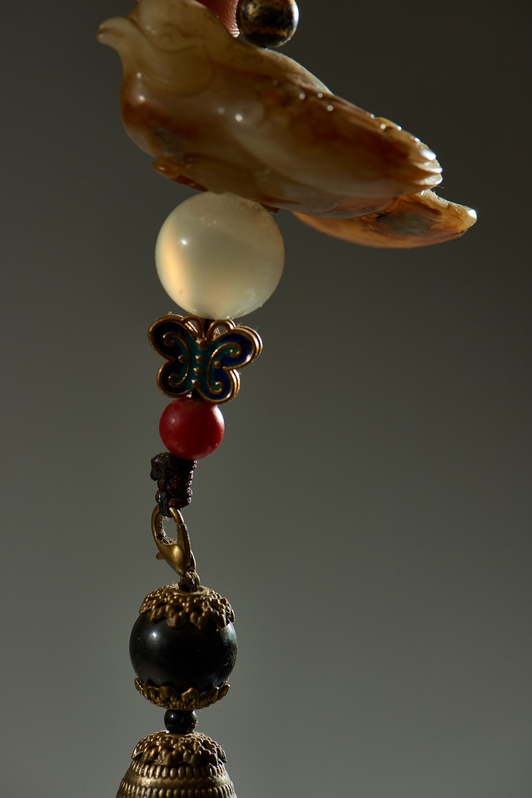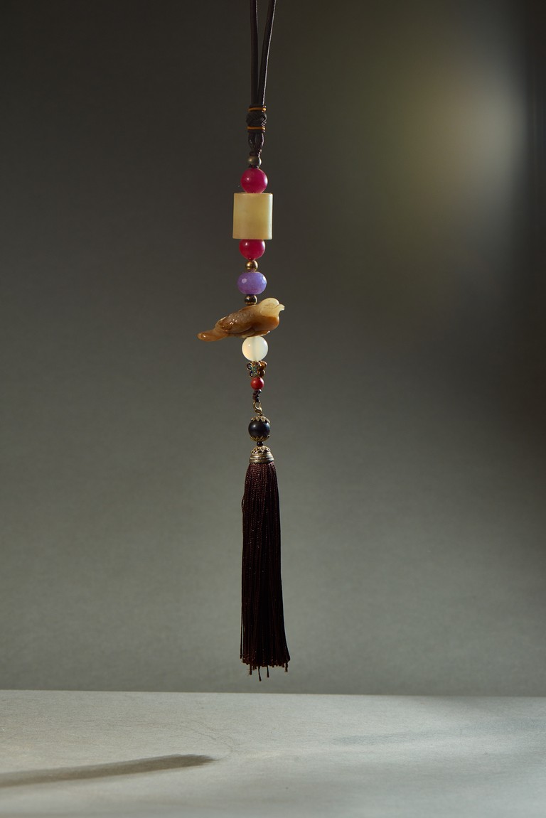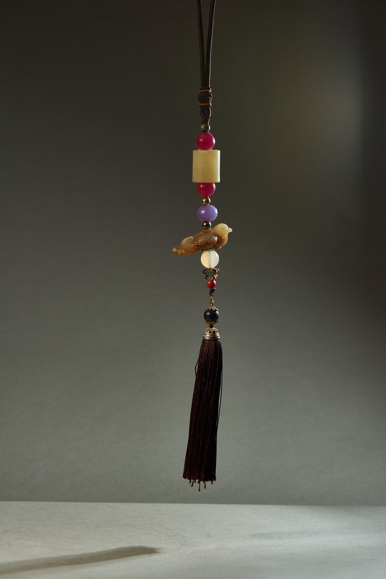 The jade pendant carved in the form of bird with detailed feather, the head with beak and rounded eyes.
