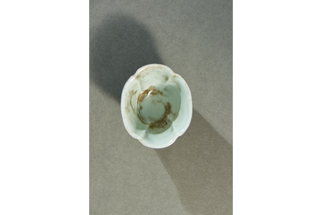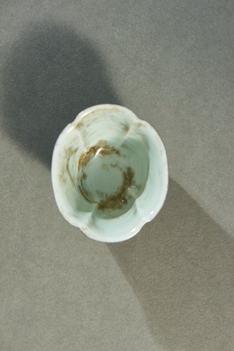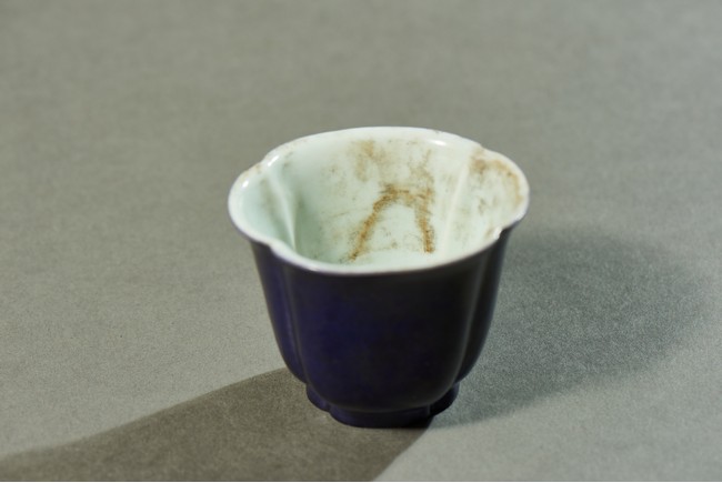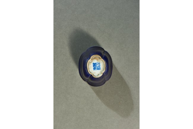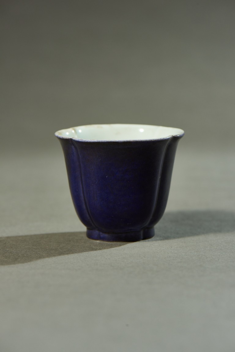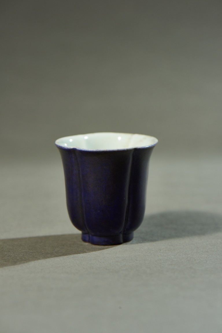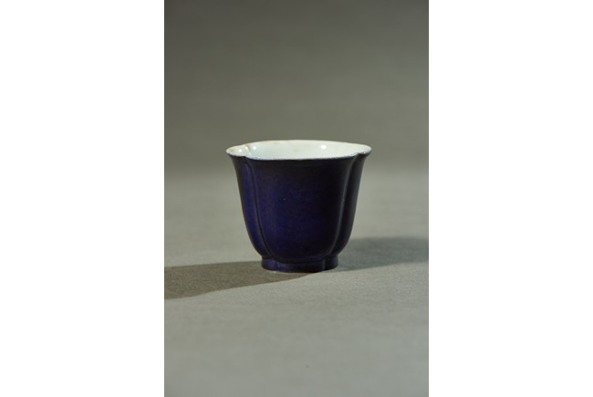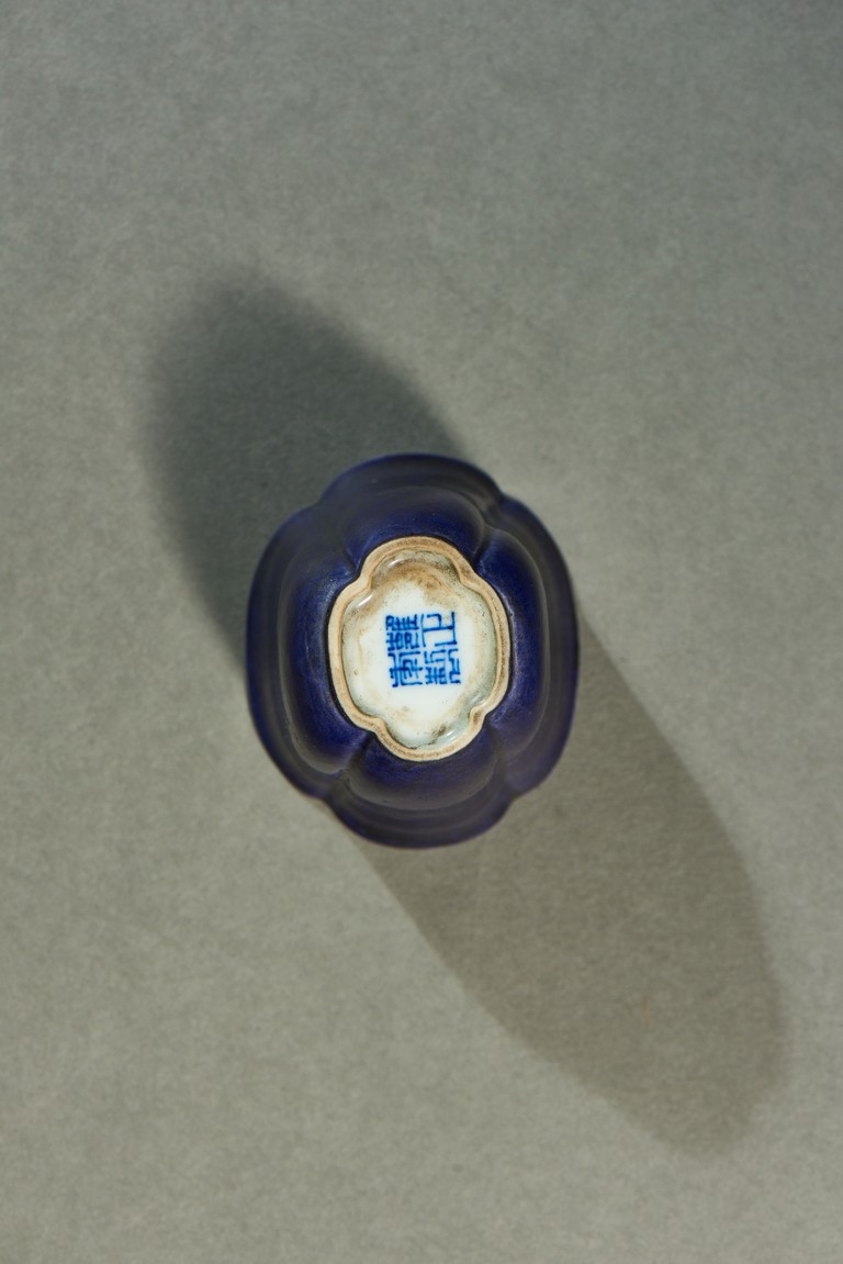 Of lobed form, the exterior suffused with attractive purple glaze, base inscribed with four character mark. Qing Dynasty period.