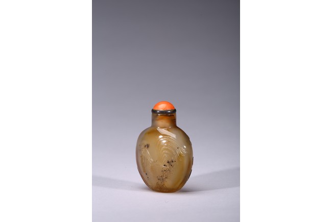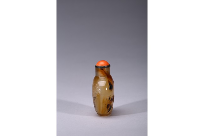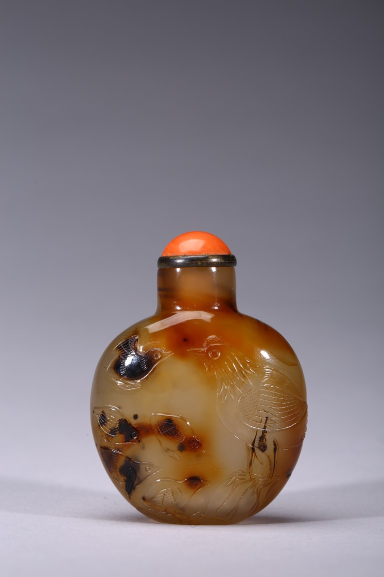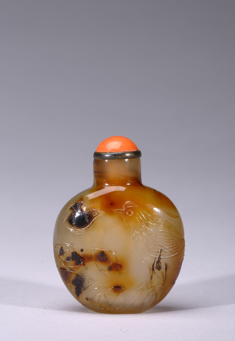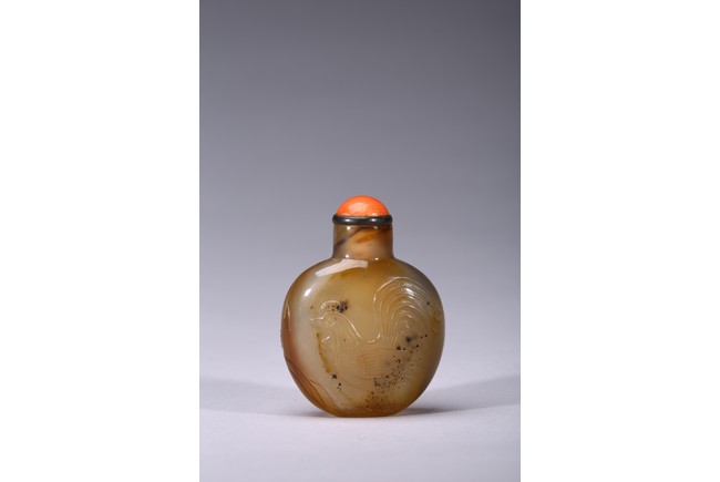 Of compressed spherical shape, the well-hollowed body carved on one side utilizing the dark brown markings with a hem and five chicks, the reverse carved with a rooster, accompanied with a coral stopper. Mid-Qing Dynasty period.