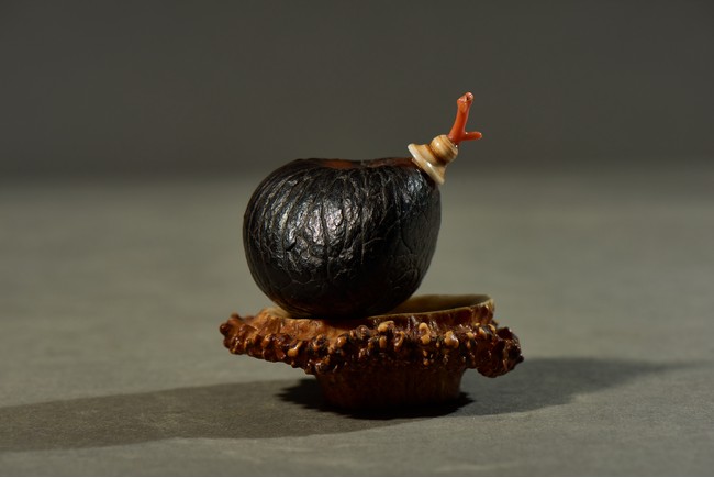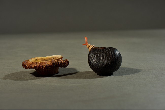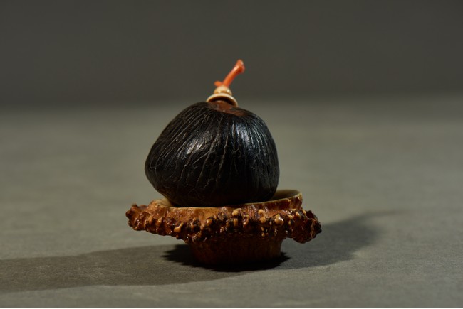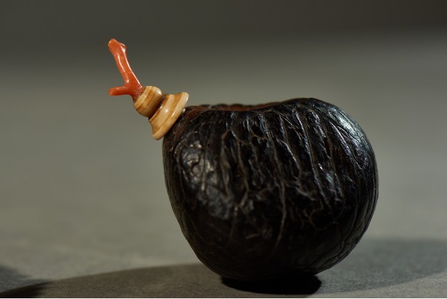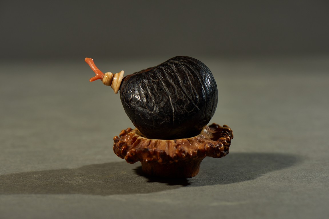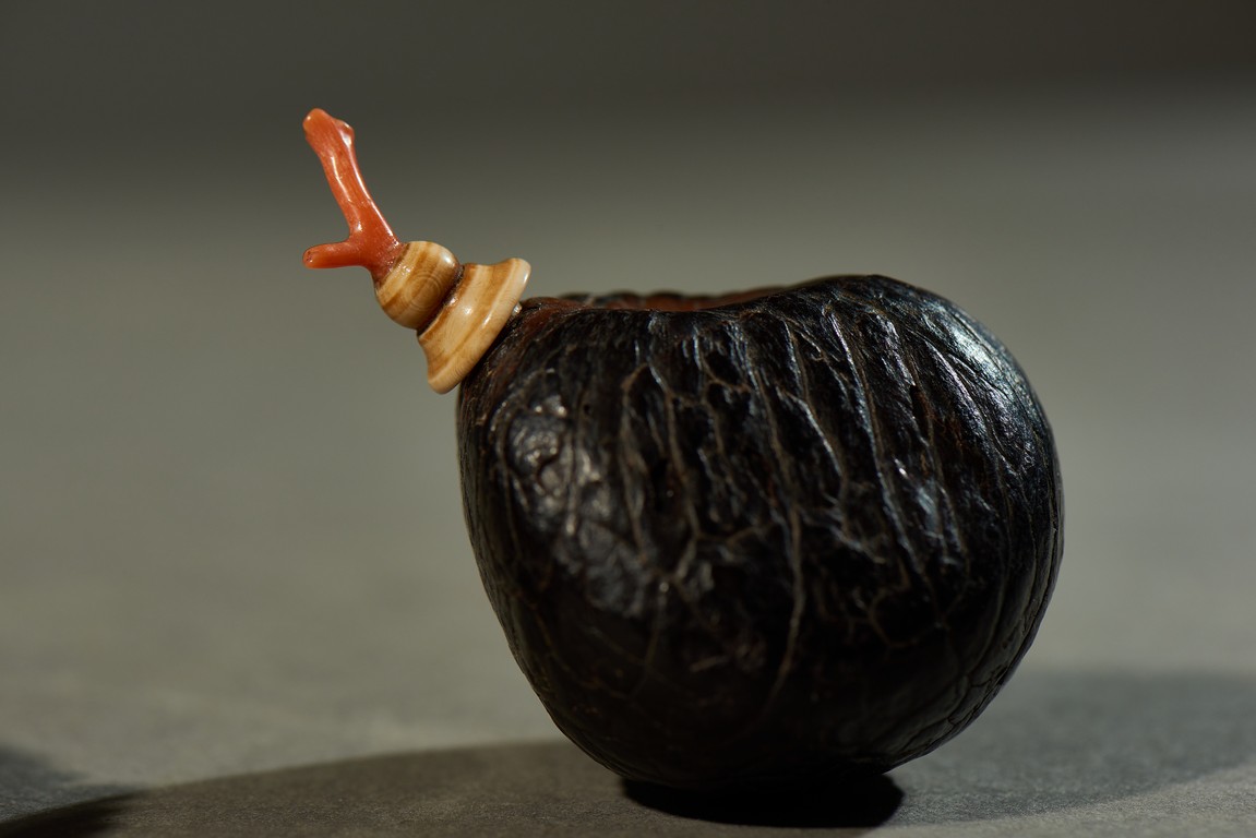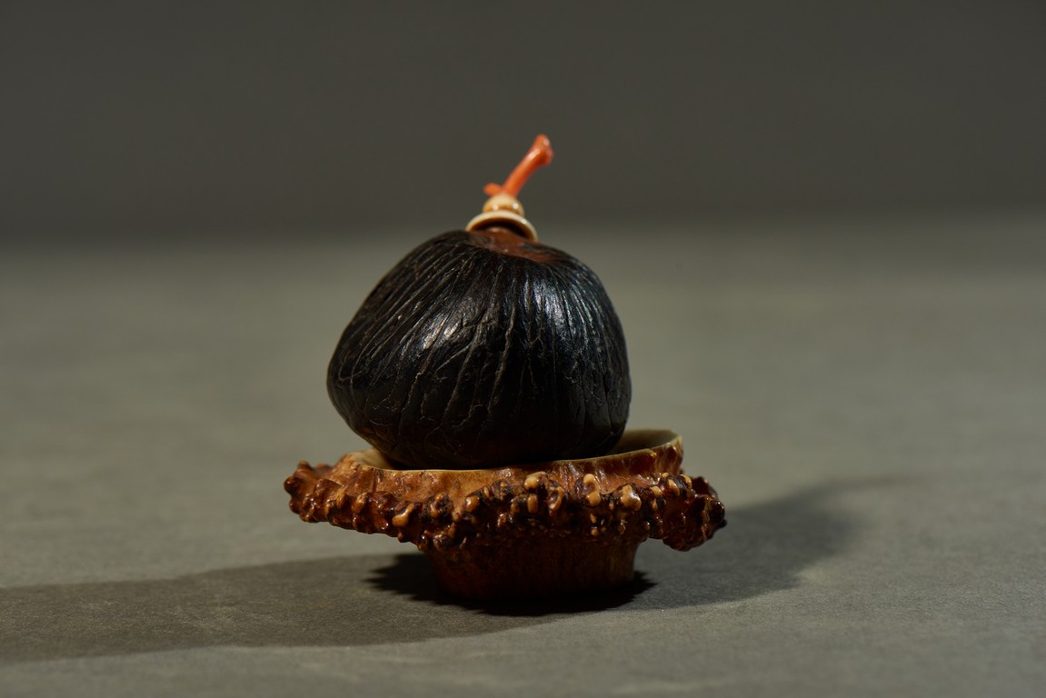 The naturalistic puti seed well hollowed with coral stopper, accompanied with stand. Qing Dynasty period.