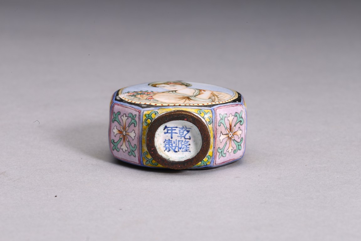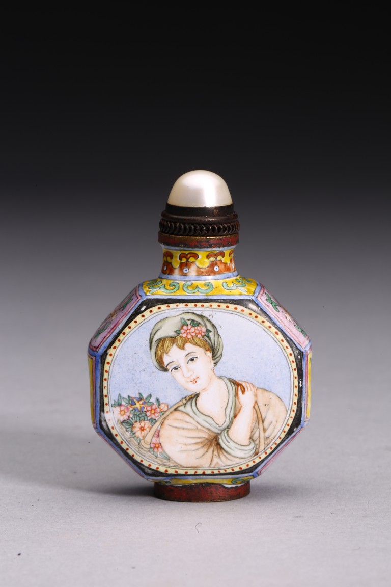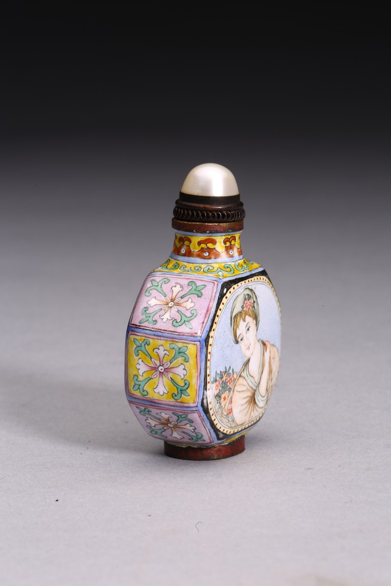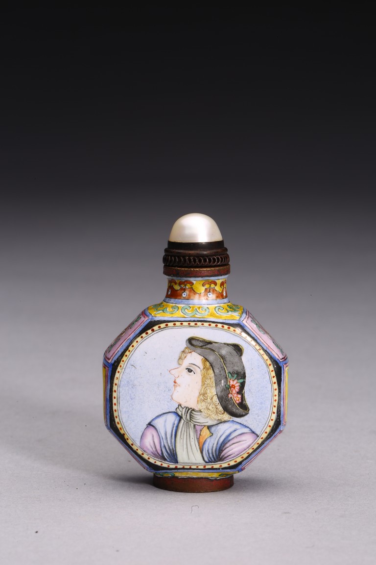 The snuff bottle is colourfully enamelled with two cartouches depicting European lady next to flowers, the reverse depicting a European gentleman, The base bears an apocryphal Qianlong four-character mark. Qing Dynasty period.
