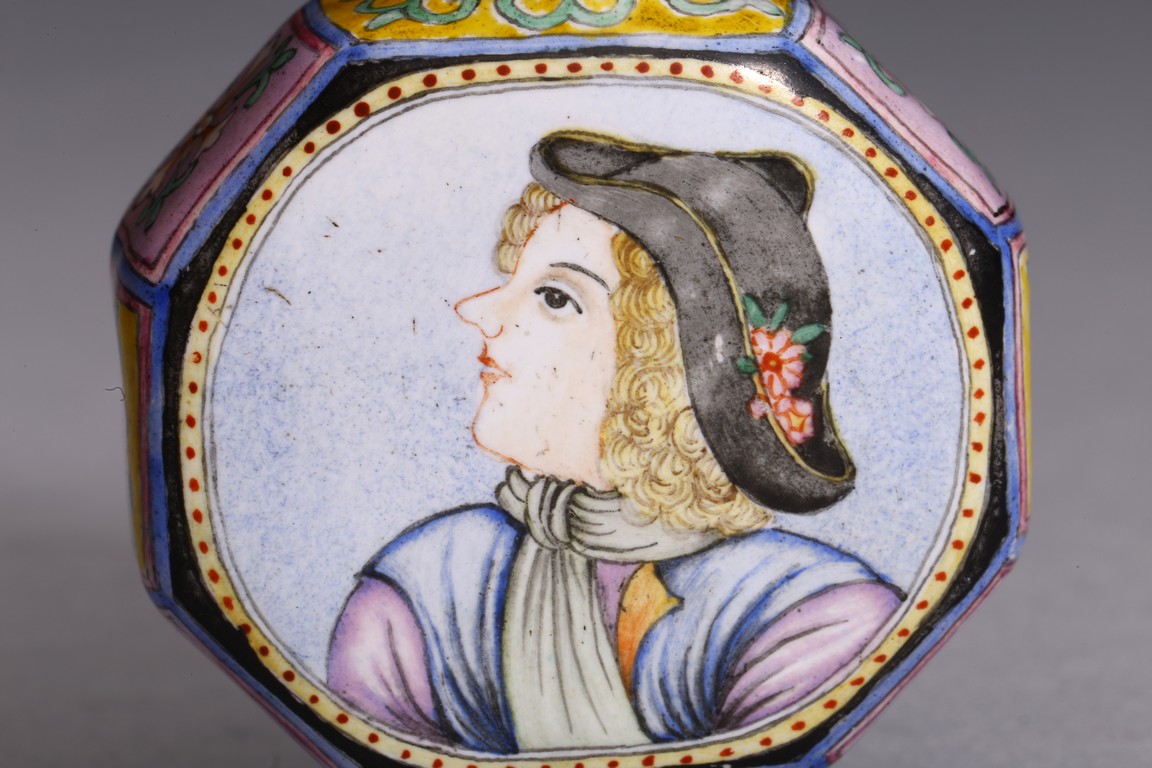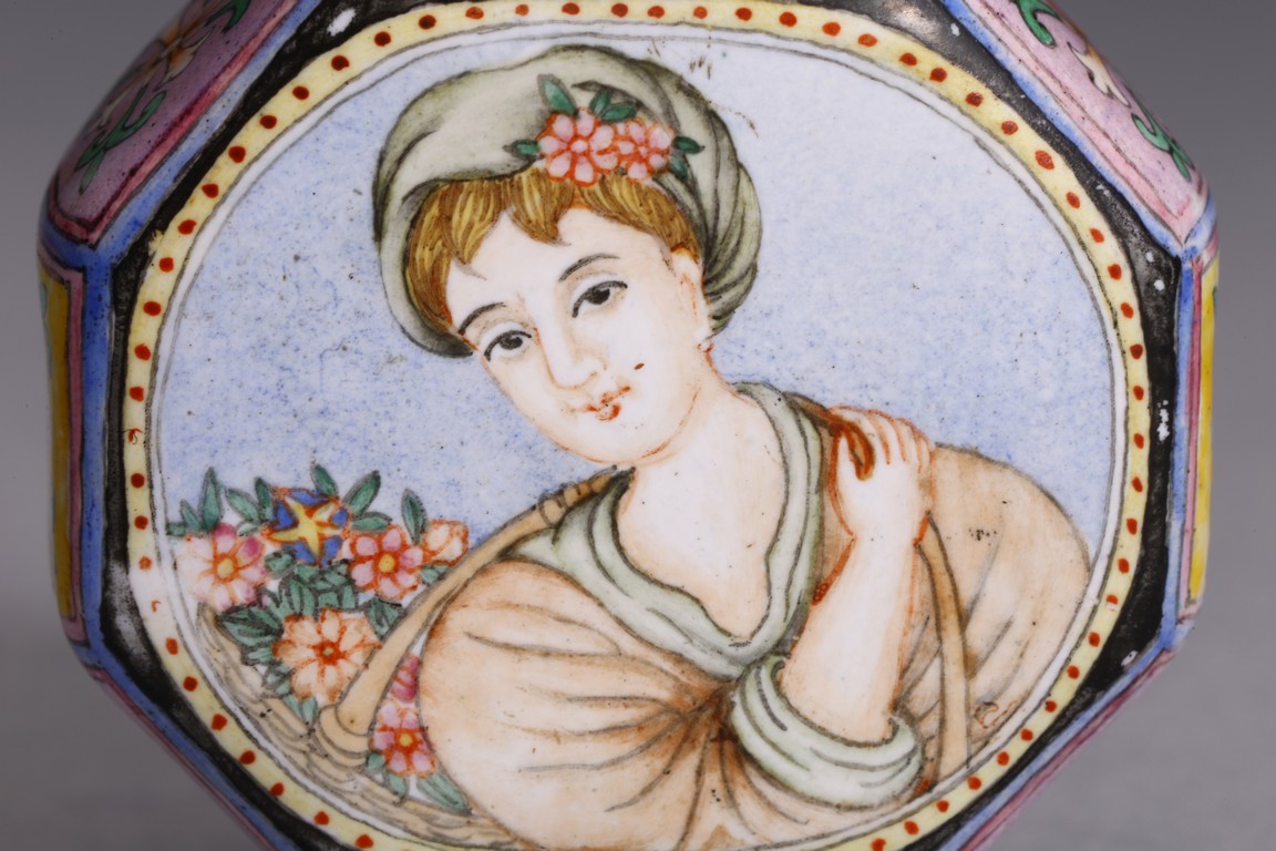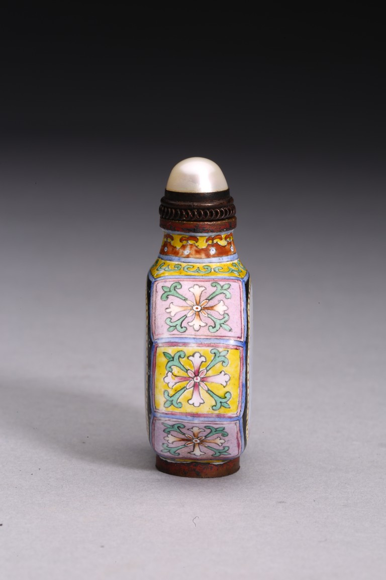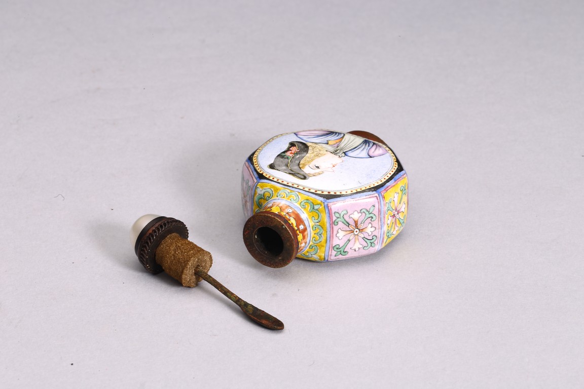 The snuff bottle is colourfully enamelled with two cartouches depicting European lady next to flowers, the reverse depicting a European gentleman, The base bears an apocryphal Qianlong four-character mark. Qing Dynasty period.