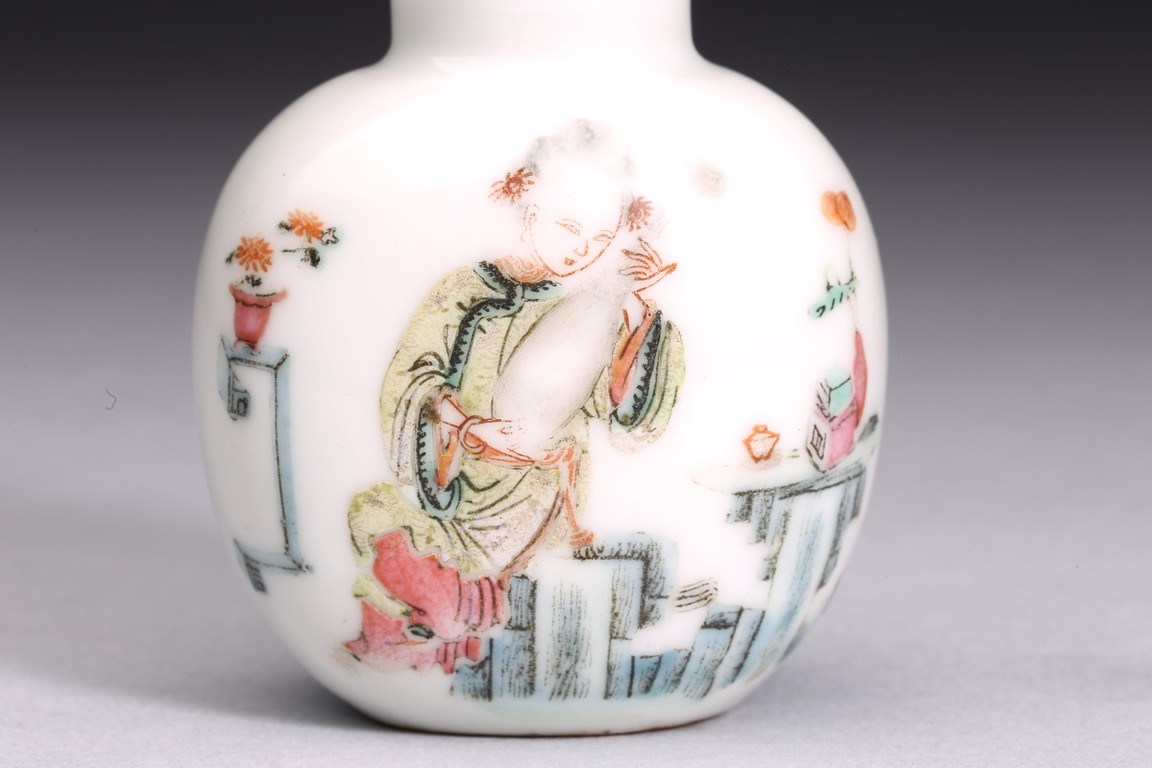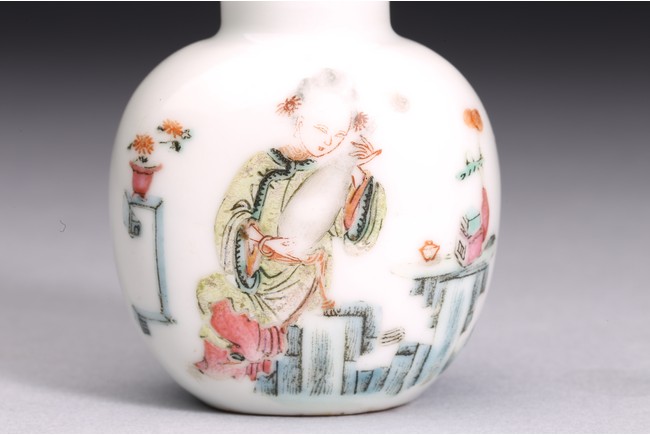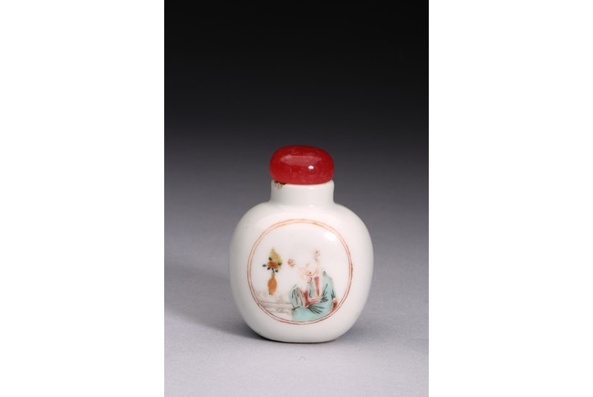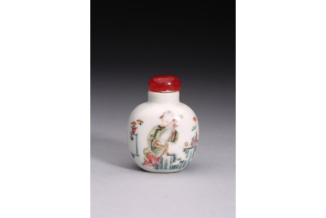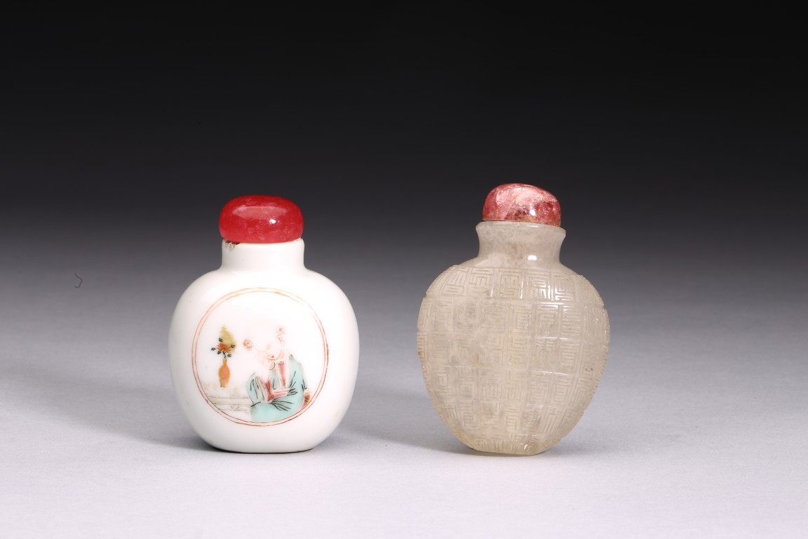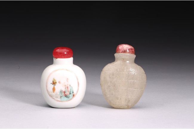 粉彩仕女鼻煙壺:小圓口、直頸、扁腹,用粉彩繪仕女圖案,正面仕女手捧琵琶,沉醉在庭院之中;反面開光仕女低頭若有所思。人物神情嫻靜,儀態優雅,衣褶飄逸。整體線條流暢,描繪細緻入微,表情生動傳神,構圖雅緻和諧,色澤華麗。瑪瑙百壽鼻煙壺:此壺體型秀美,扁平形、小圓口、束頸、扁腹。取材上乘,用上等瑪瑙為材,壺蓋為碧璽製成,器身浮雕百壽紋,雕工精細。寓意美好,為“福報百壽”之意。