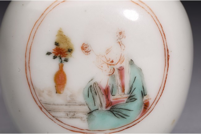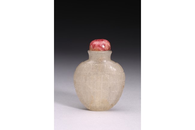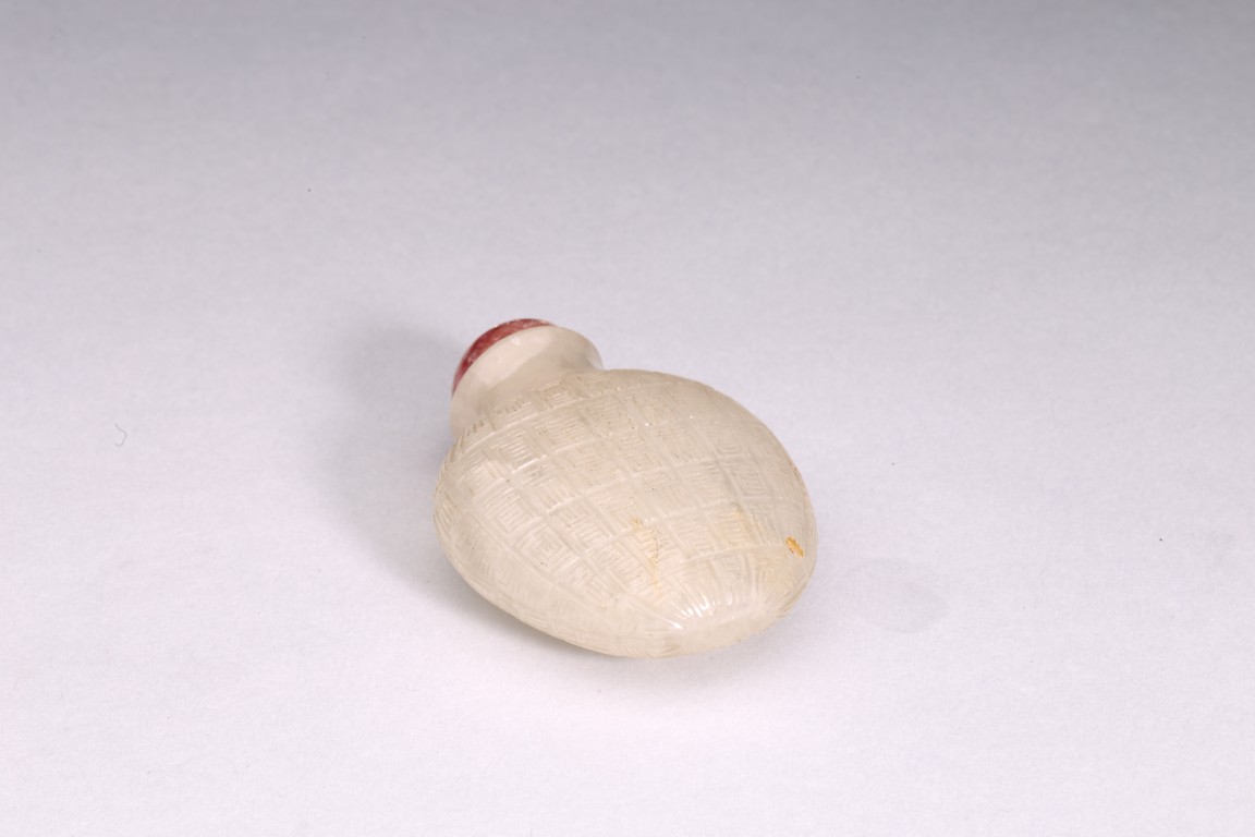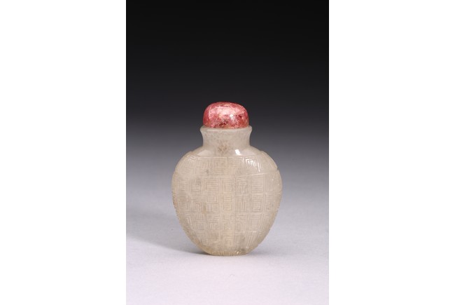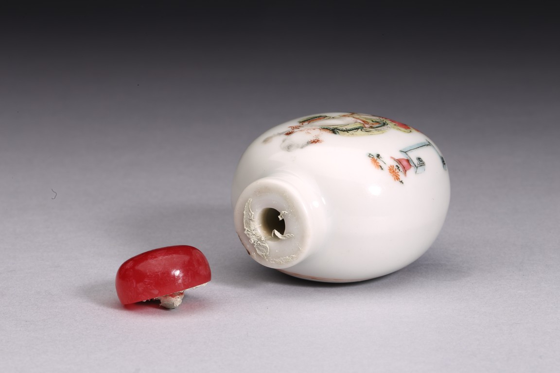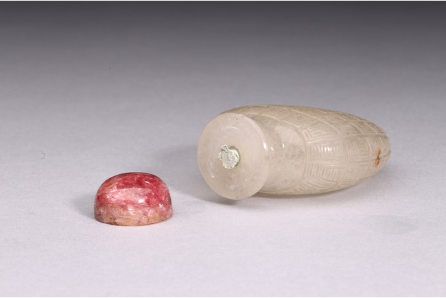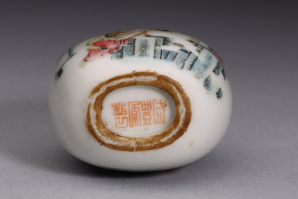 粉彩仕女鼻煙壺:小圓口、直頸、扁腹,用粉彩繪仕女圖案,正面仕女手捧琵琶,沉醉在庭院之中;反面開光仕女低頭若有所思。人物神情嫻靜,儀態優雅,衣褶飄逸。整體線條流暢,描繪細緻入微,表情生動傳神,構圖雅緻和諧,色澤華麗。瑪瑙百壽鼻煙壺:此壺體型秀美,扁平形、小圓口、束頸、扁腹。取材上乘,用上等瑪瑙為材,壺蓋為碧璽製成,器身浮雕百壽紋,雕工精細。寓意美好,為“福報百壽”之意。