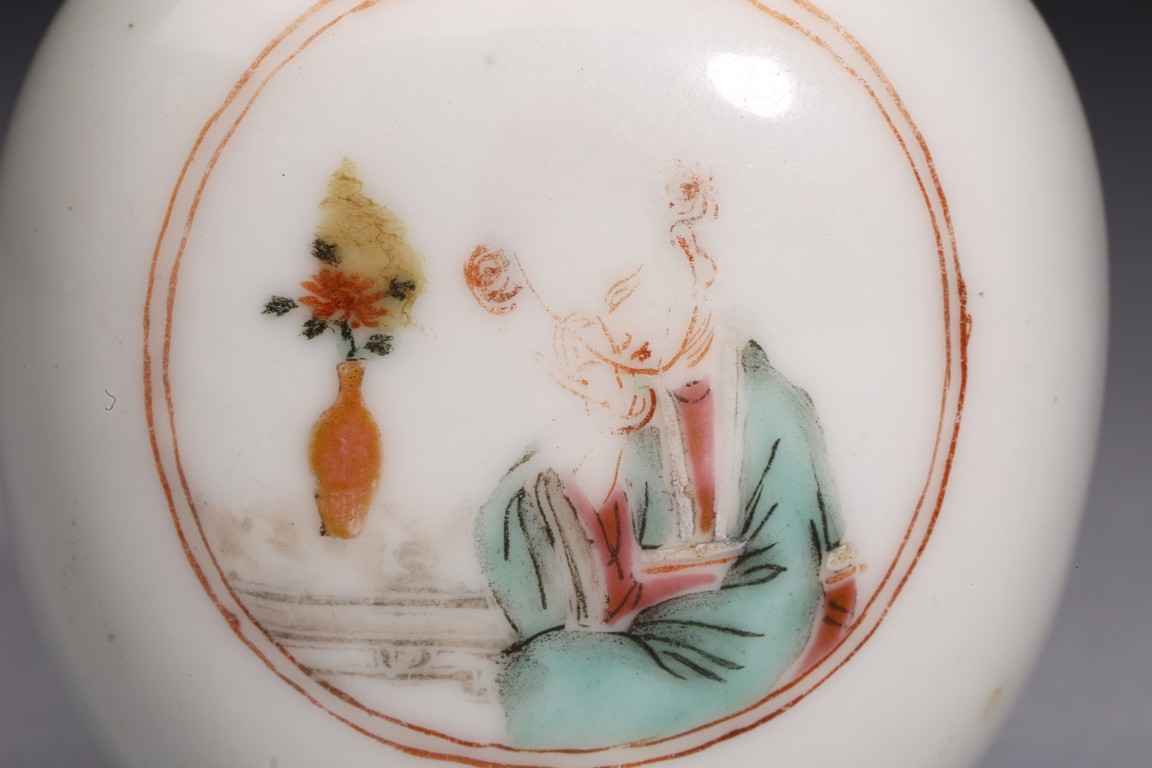 Of ovoid form, body painted with beauty to the front and reverse, with red stopper. Bottom inscribed and signed four characters "Xian Feng Nian Zhi"; The agate snuff bottle carved longevity pattern. Qing Dynasty period.