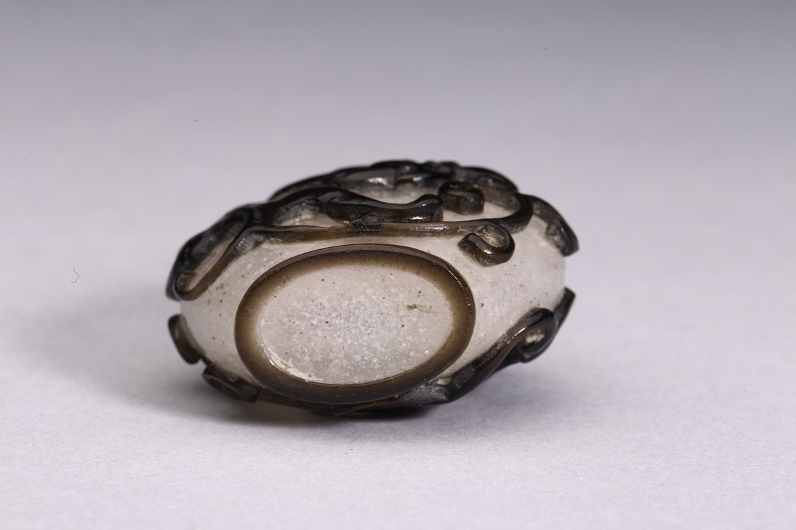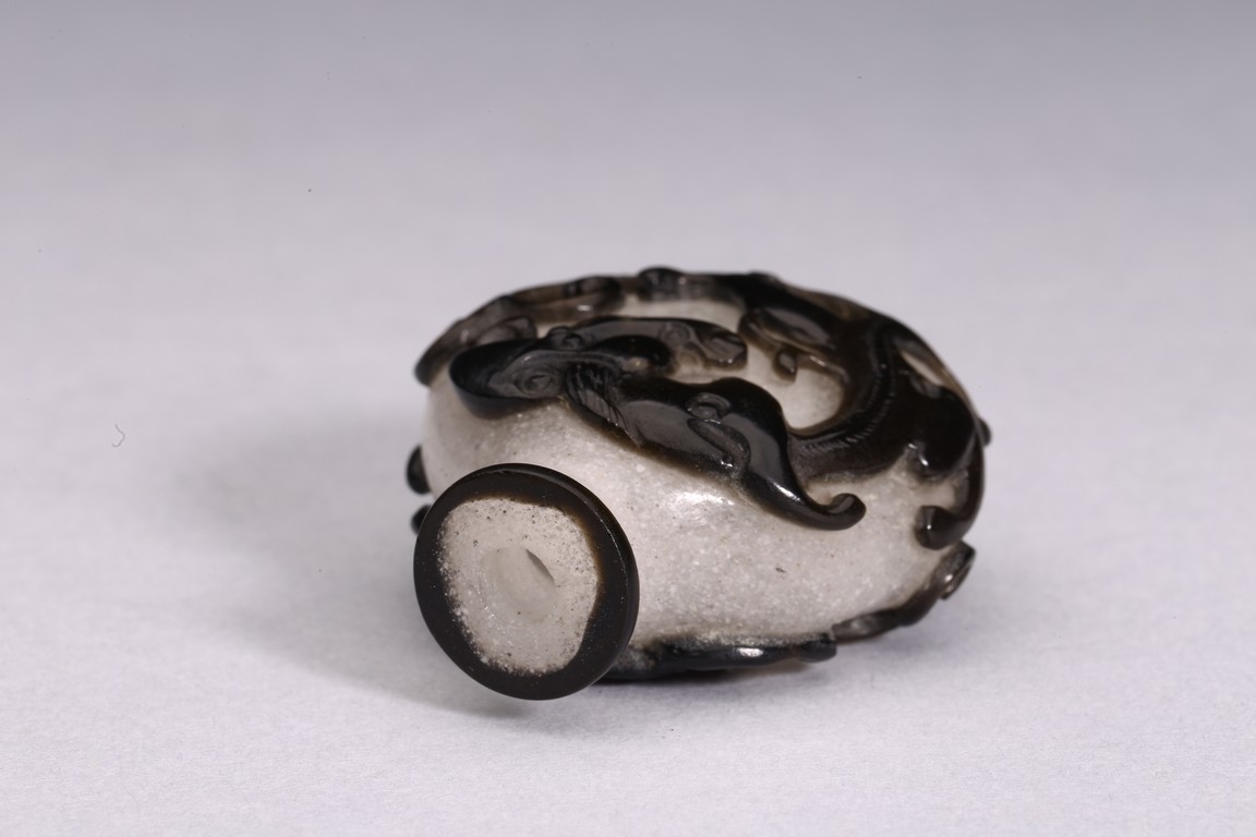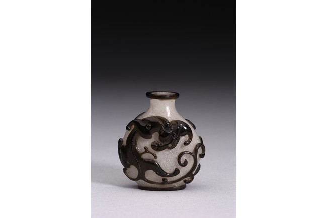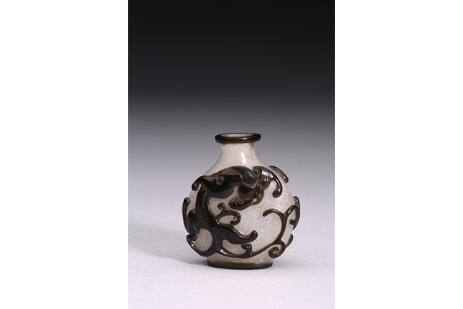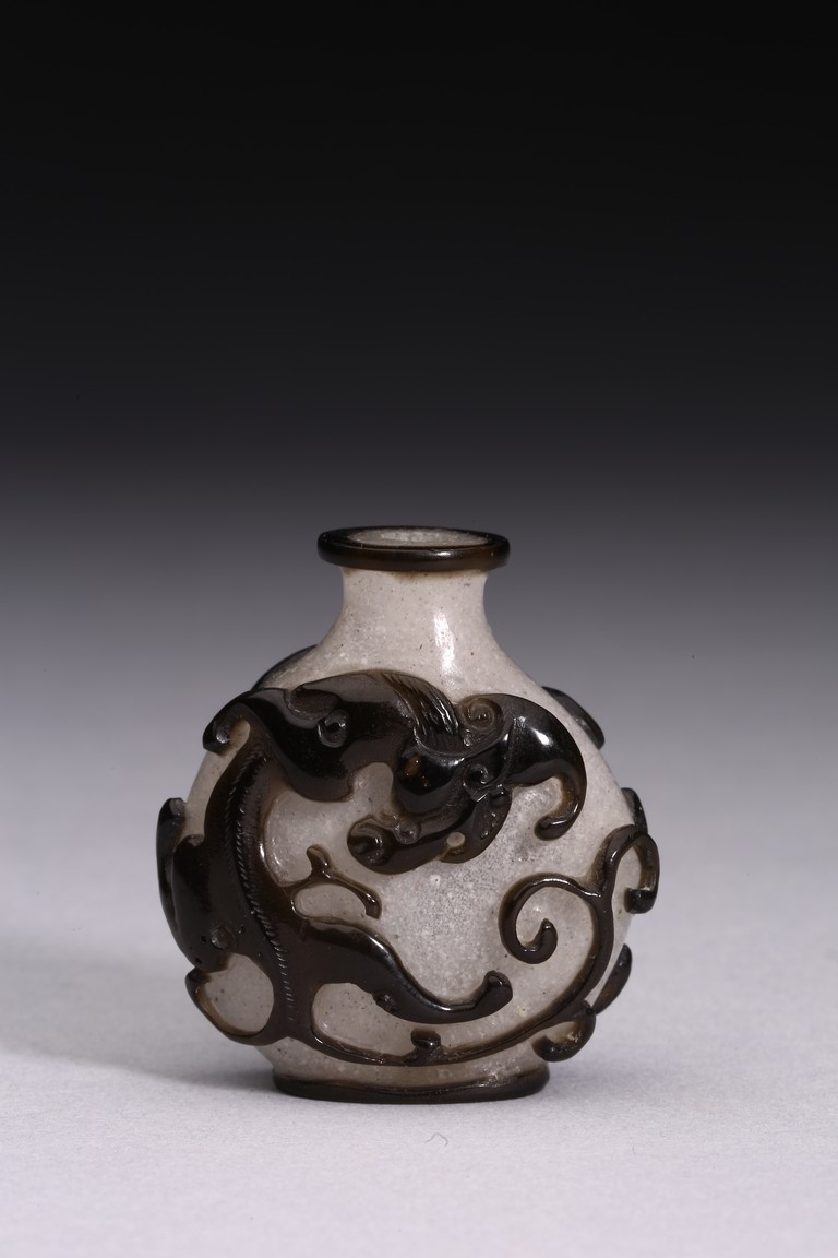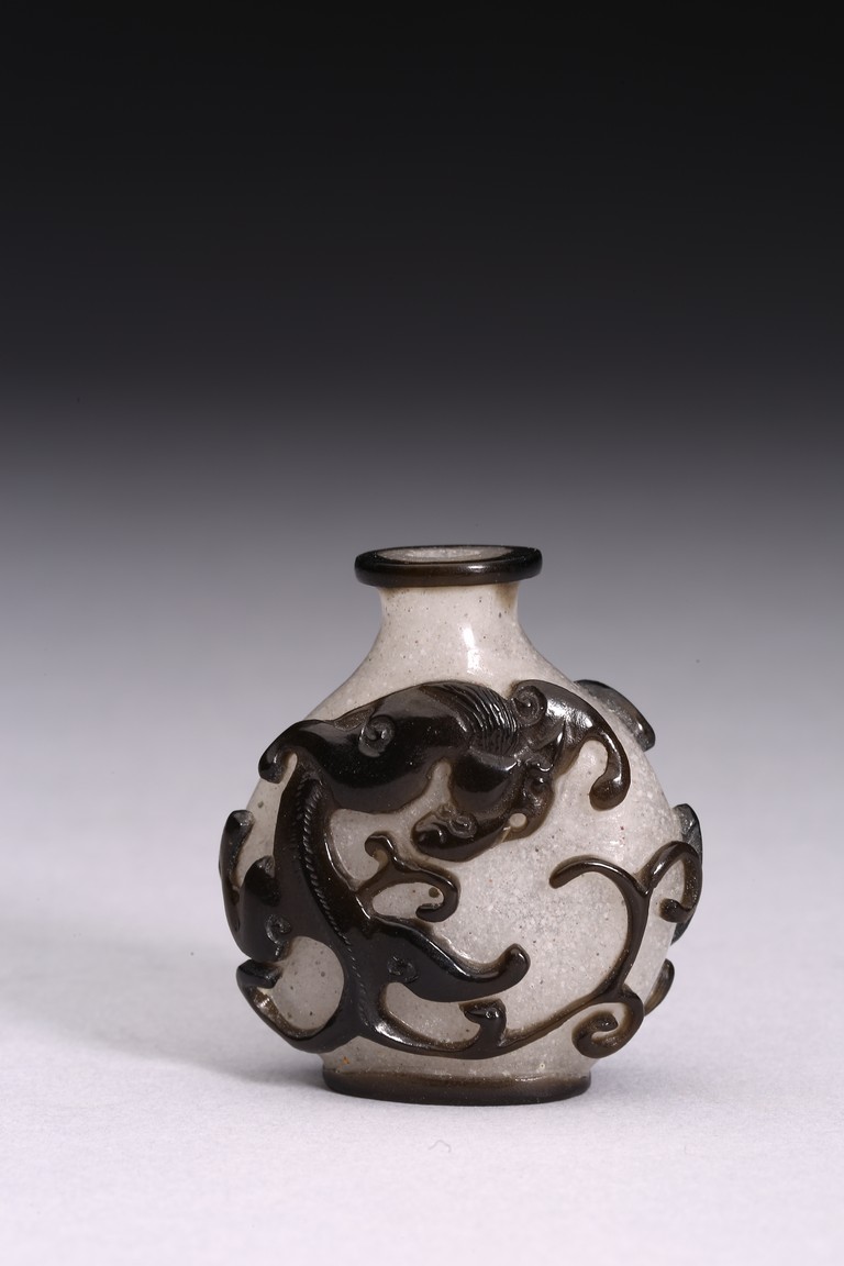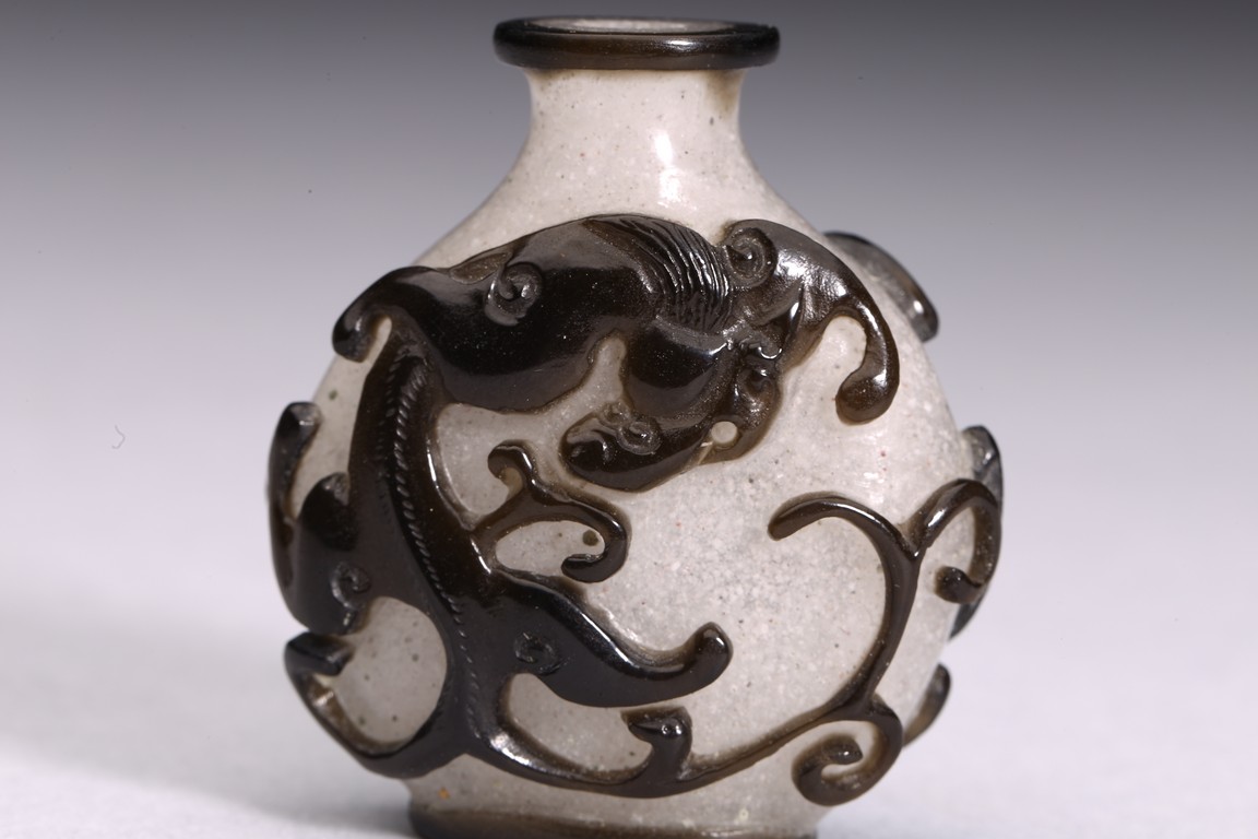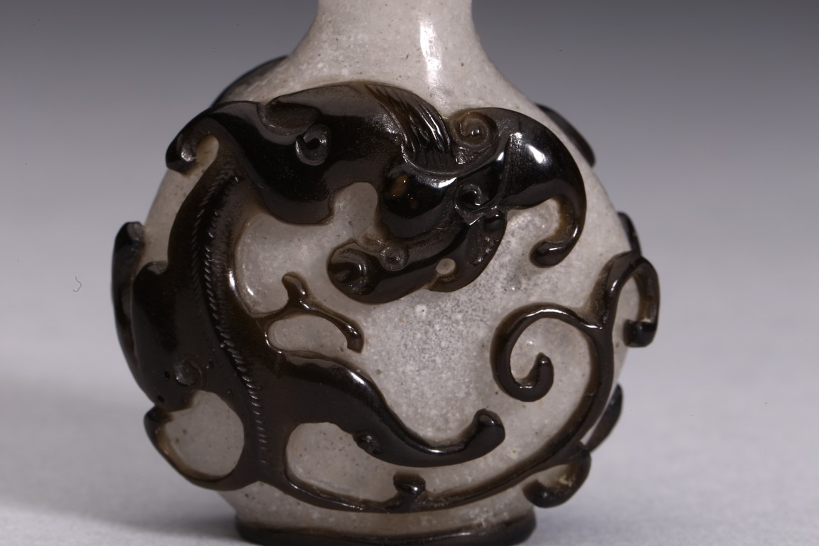 The semi-translucent white bottle carved through a layer of black glass to depict a sinuous chilong on both front and reverse. Qing Dynasty period.