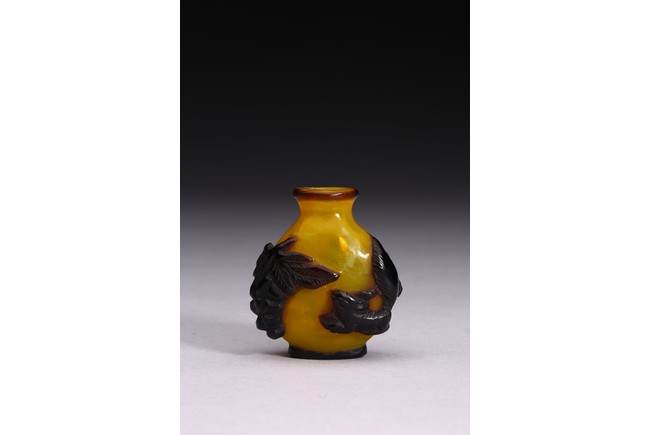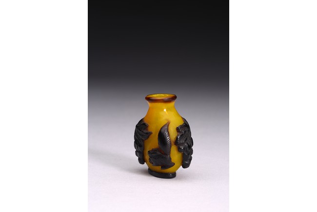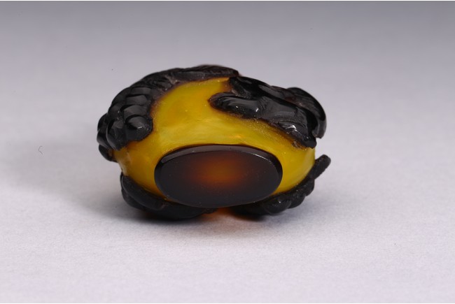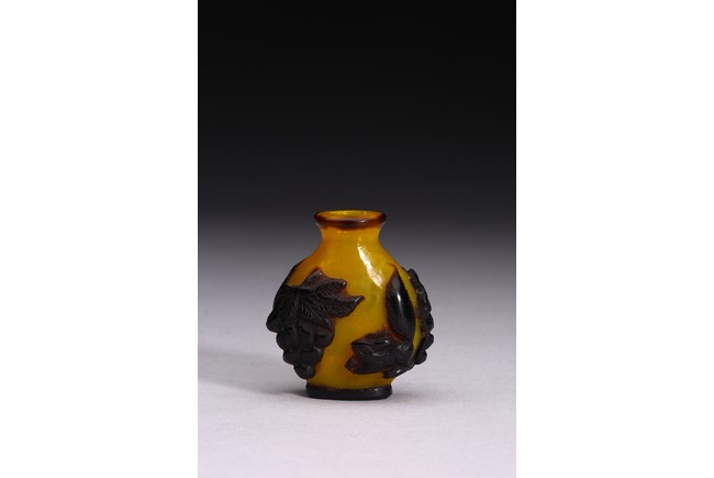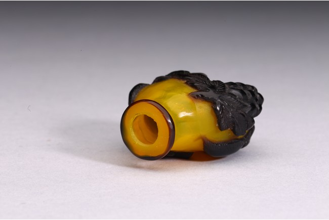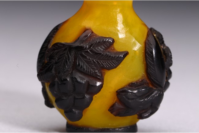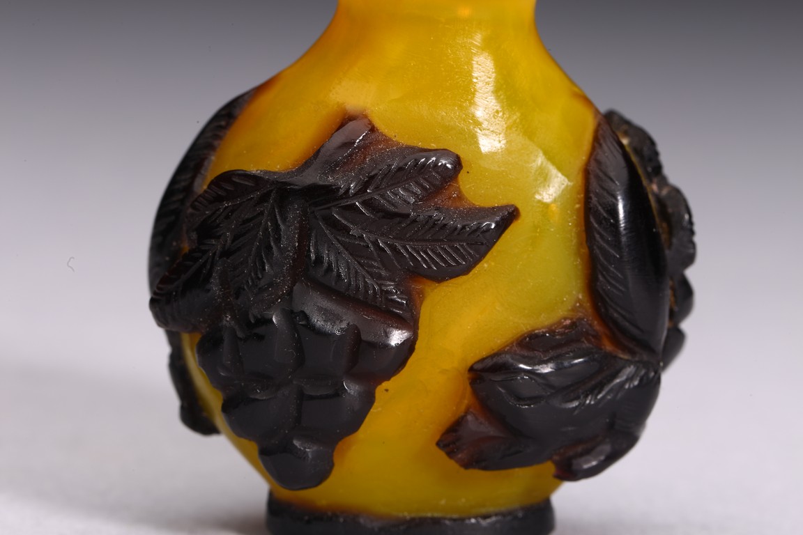 A BLACK OVERLAY YELLOW GLASS SNUFF BOTTLE 清 套料葡萄松鼠紋鼻煙壺