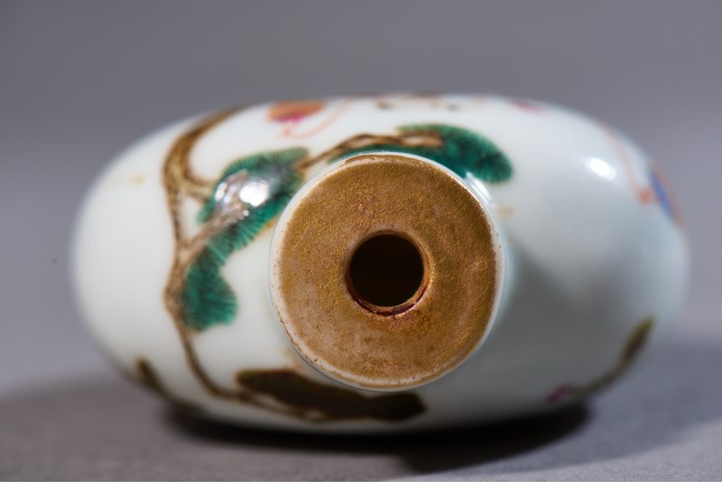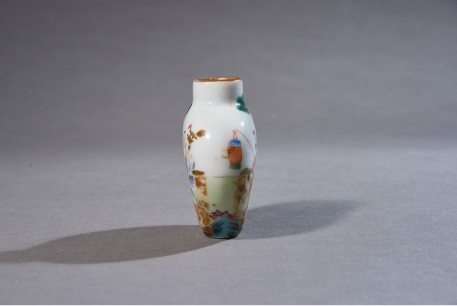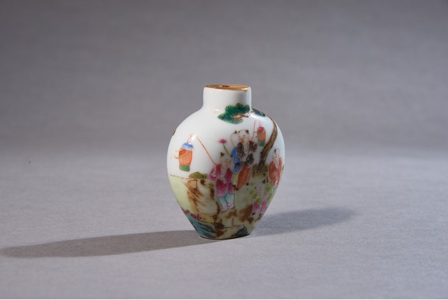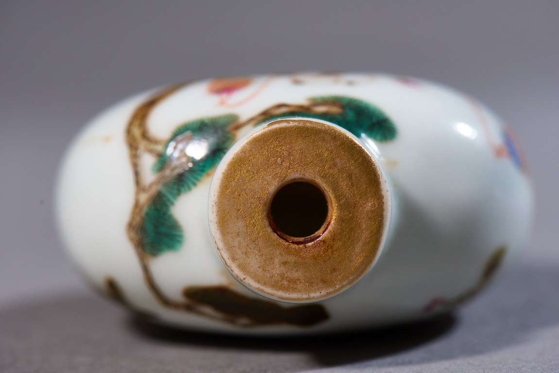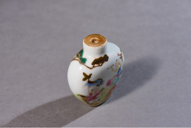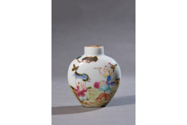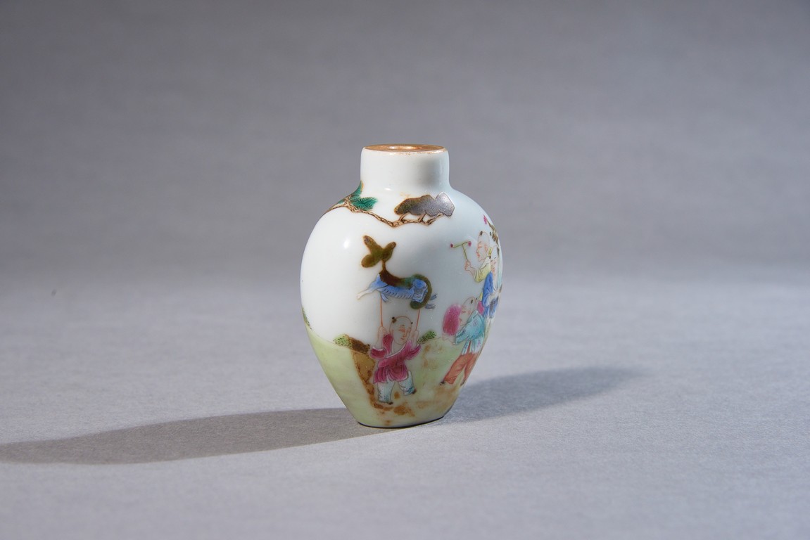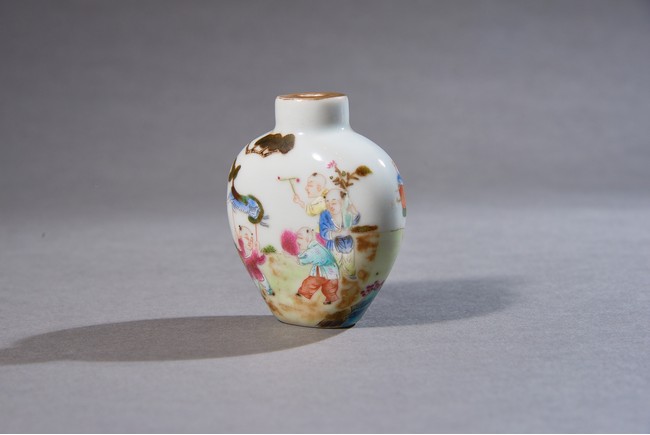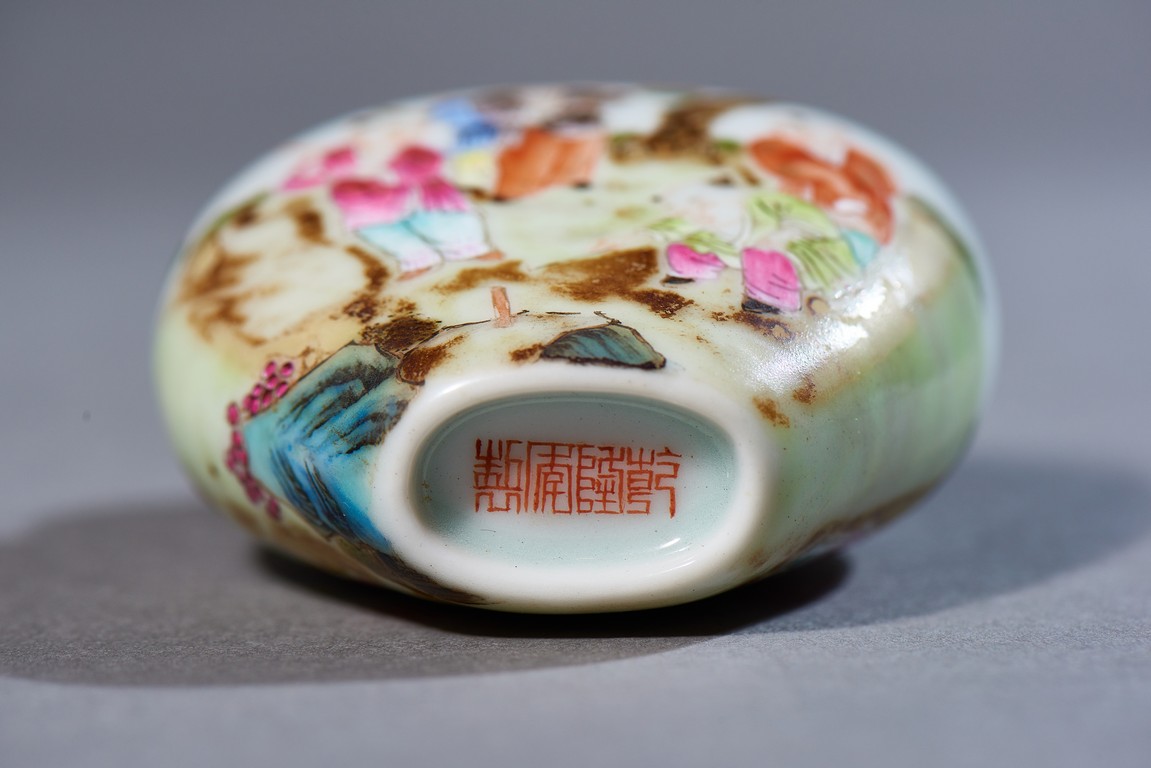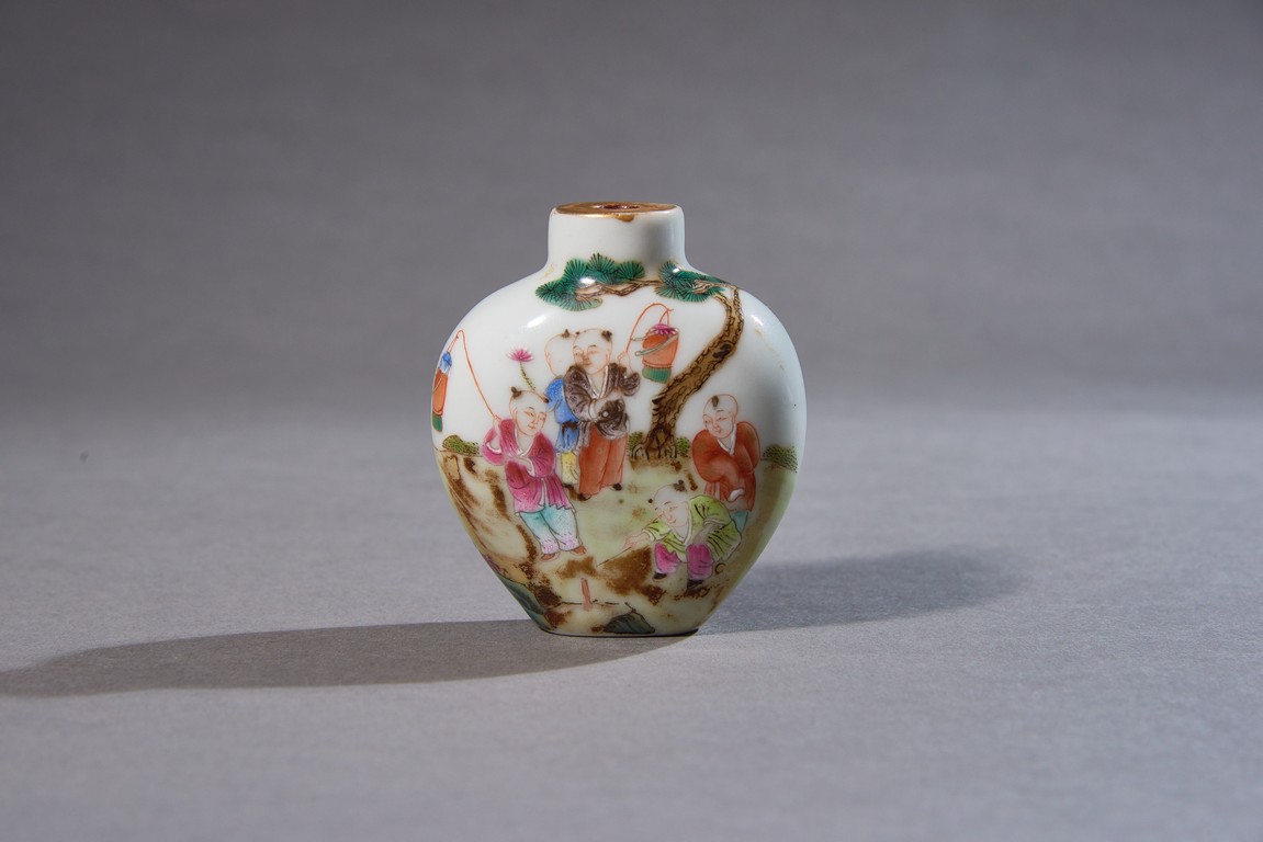 Of flattened ovoid form, the exterior decorated with children playing in an outdoor garden setting, mouth rim in gilt, base inscribed with Qianlong mark. Stopper missing. Qing Dynasty period.