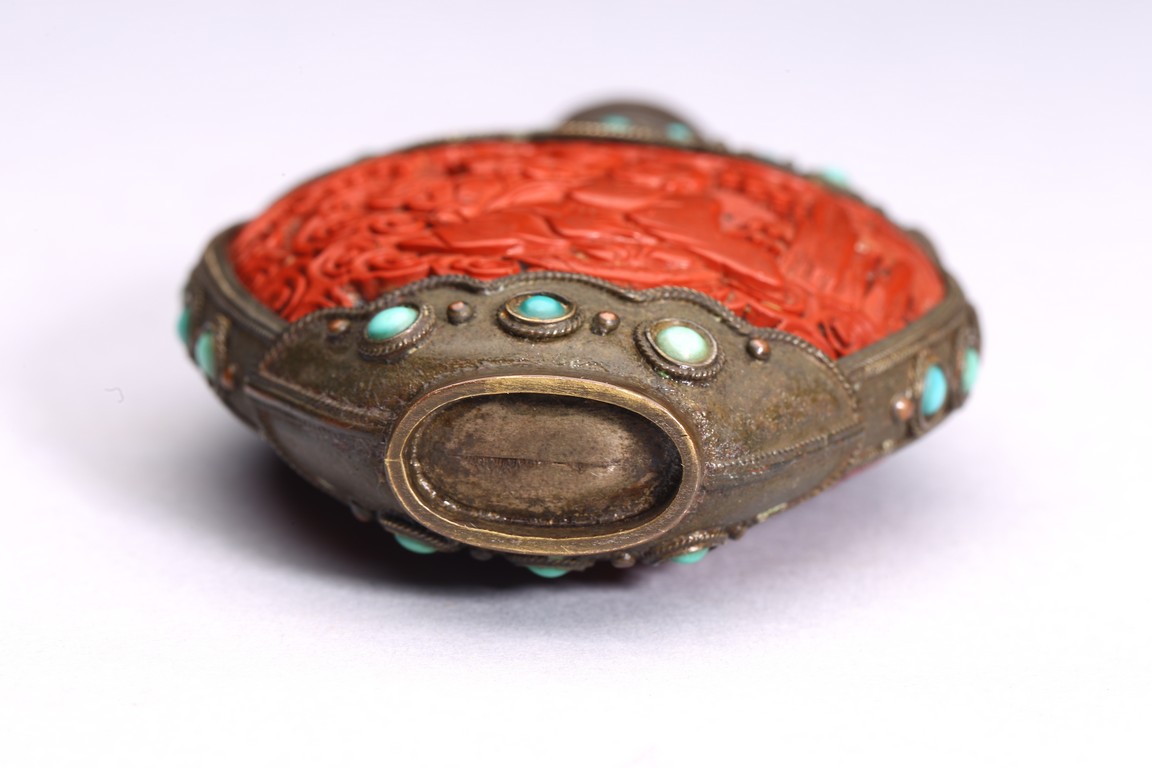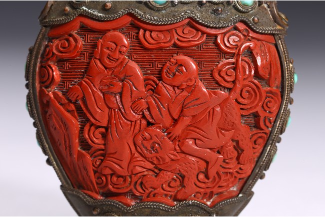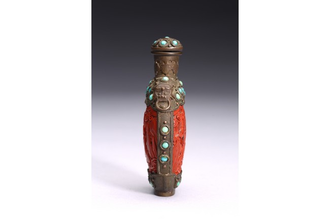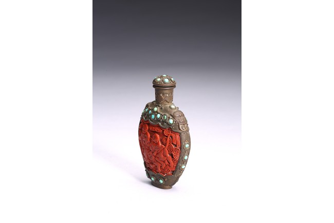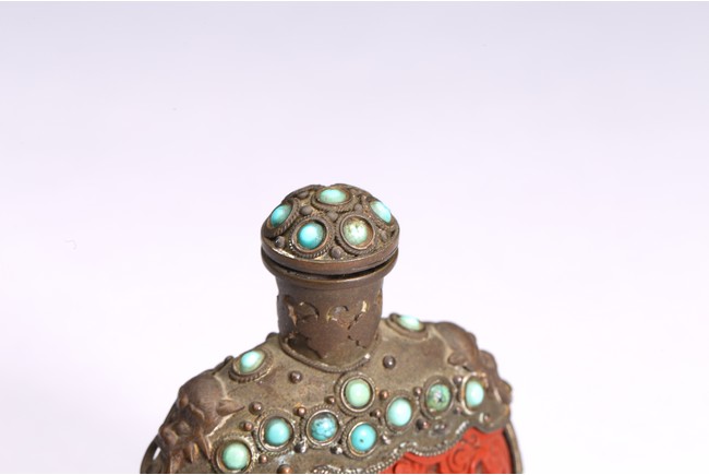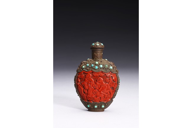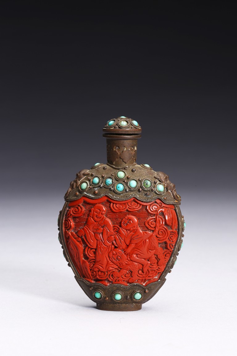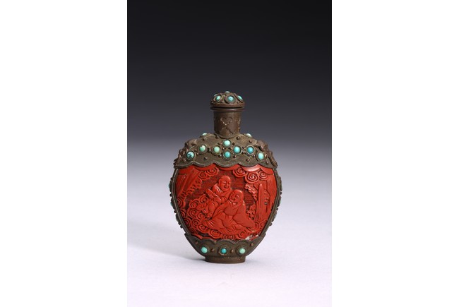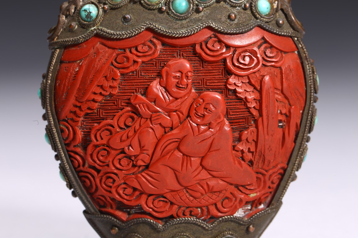 Of ovoid form,the body carved immortals of Harmony and Union to the front and reverse. The turquoise beads inlaid at upper body, bottom, both sides and stopper. Qing Dynasty period.
