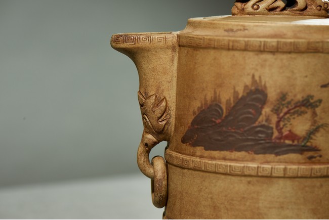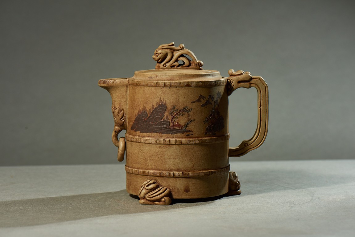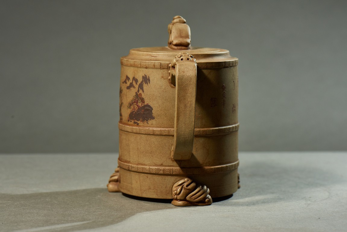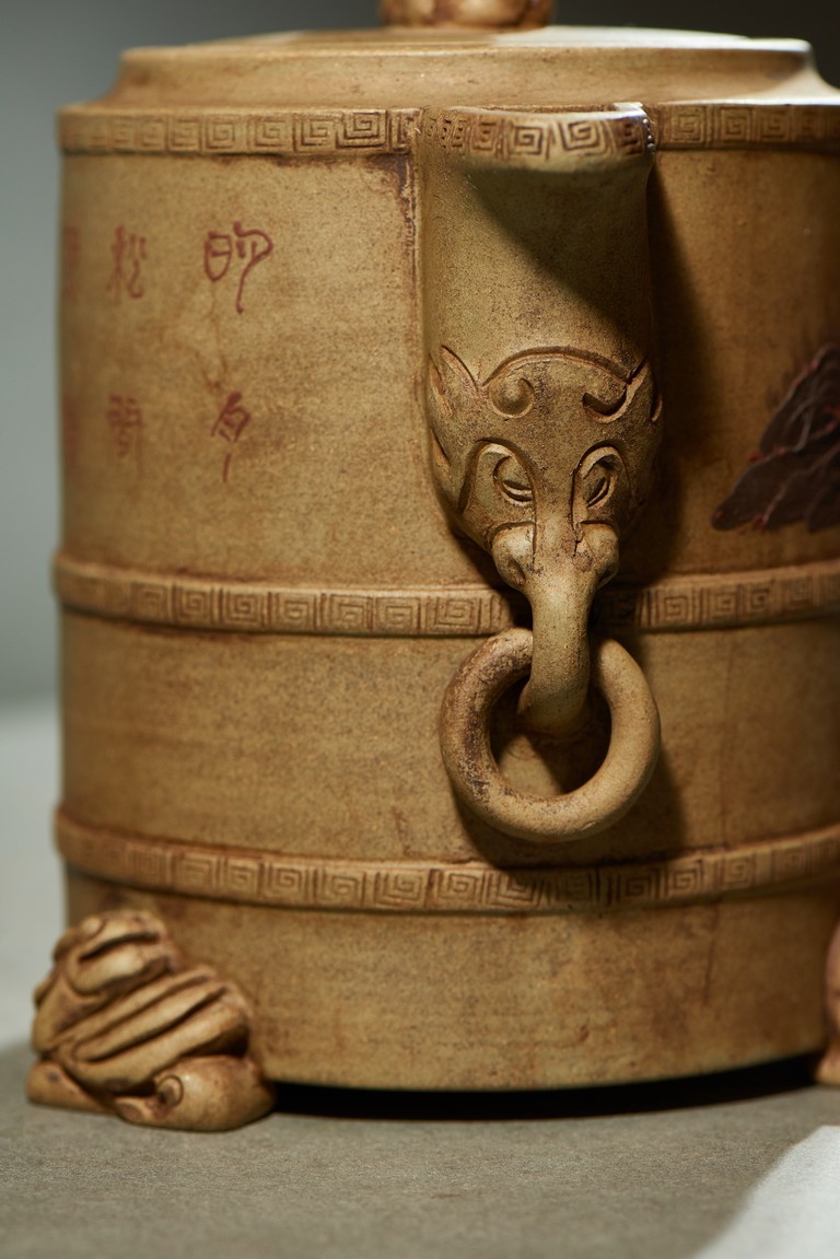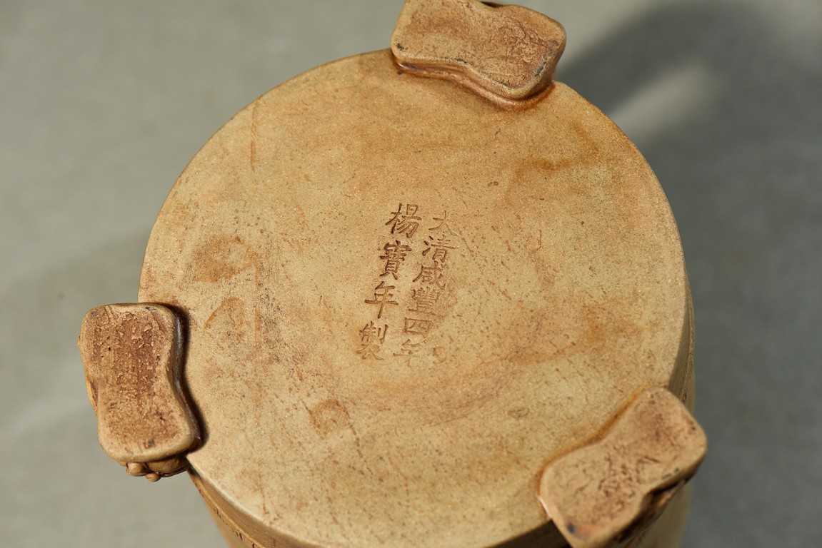 Of cylindrical form, the exterior decorated in shallow relief with landscape scenes and inscription within raised key-fret borders, supported with three mythical beast feet, base with mark.